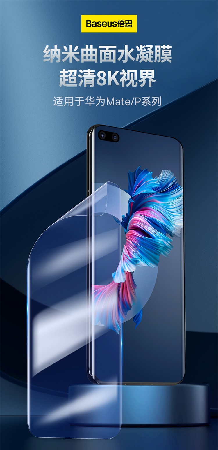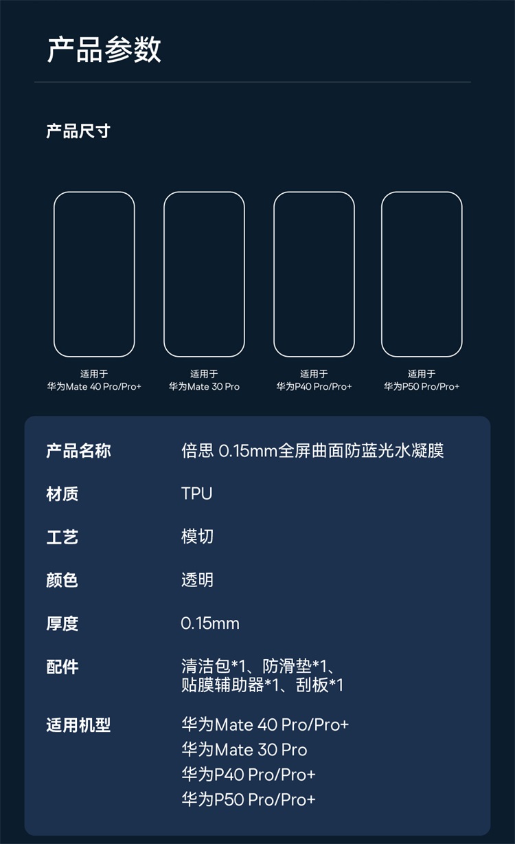 倍思 0.15mm全屏水凝膜 For 华为 Mate 50系列 透明(两片装)(含:清洁包*2+贴膜神器*1+刮板*1+防滑垫*1)