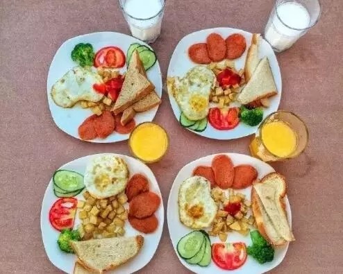 早餐不仅有颜值还很健康,果汁牛奶搭配煎蛋吐司蔬菜水果等,吃完又可以元气满满地开启新的一天!