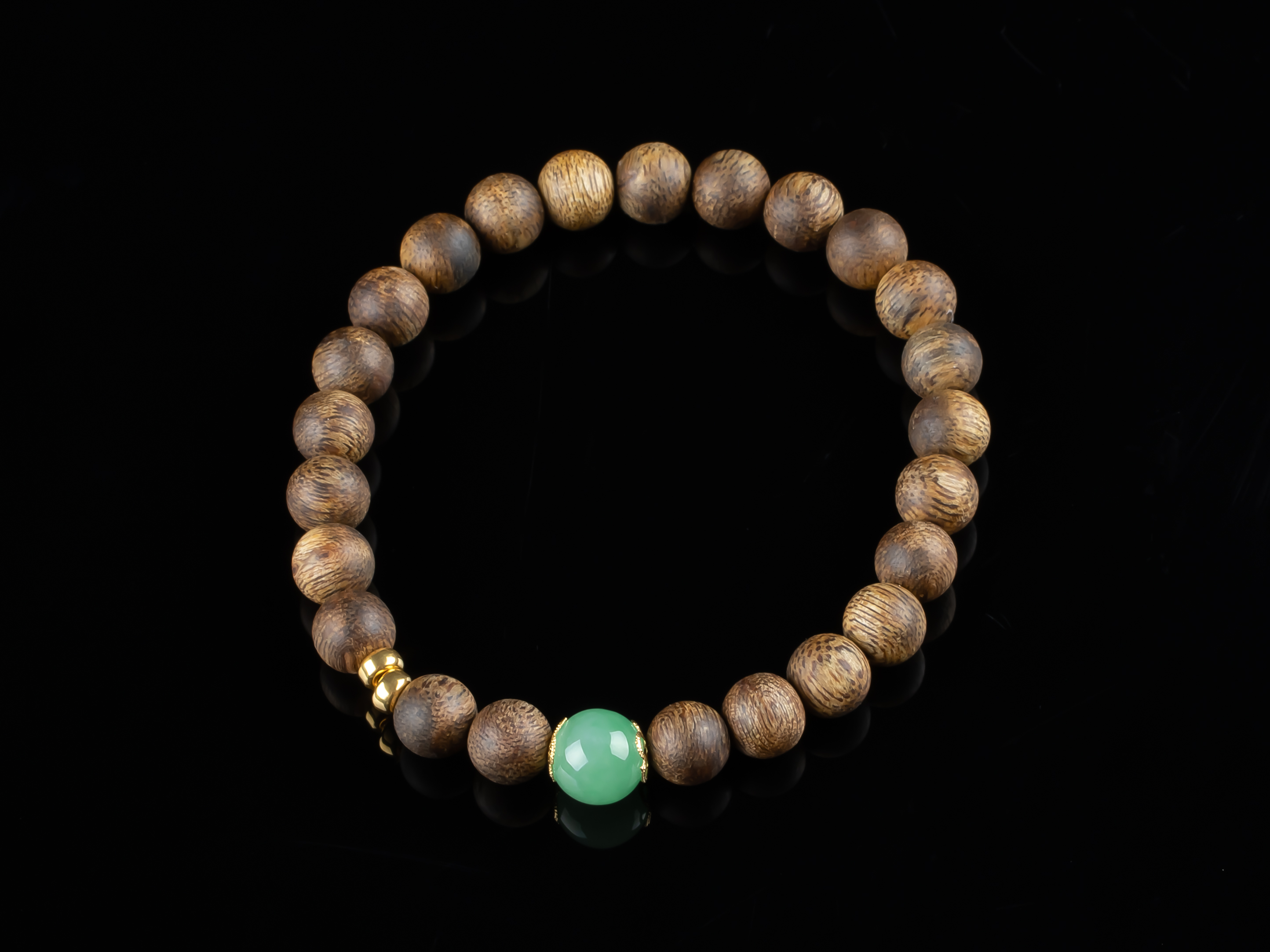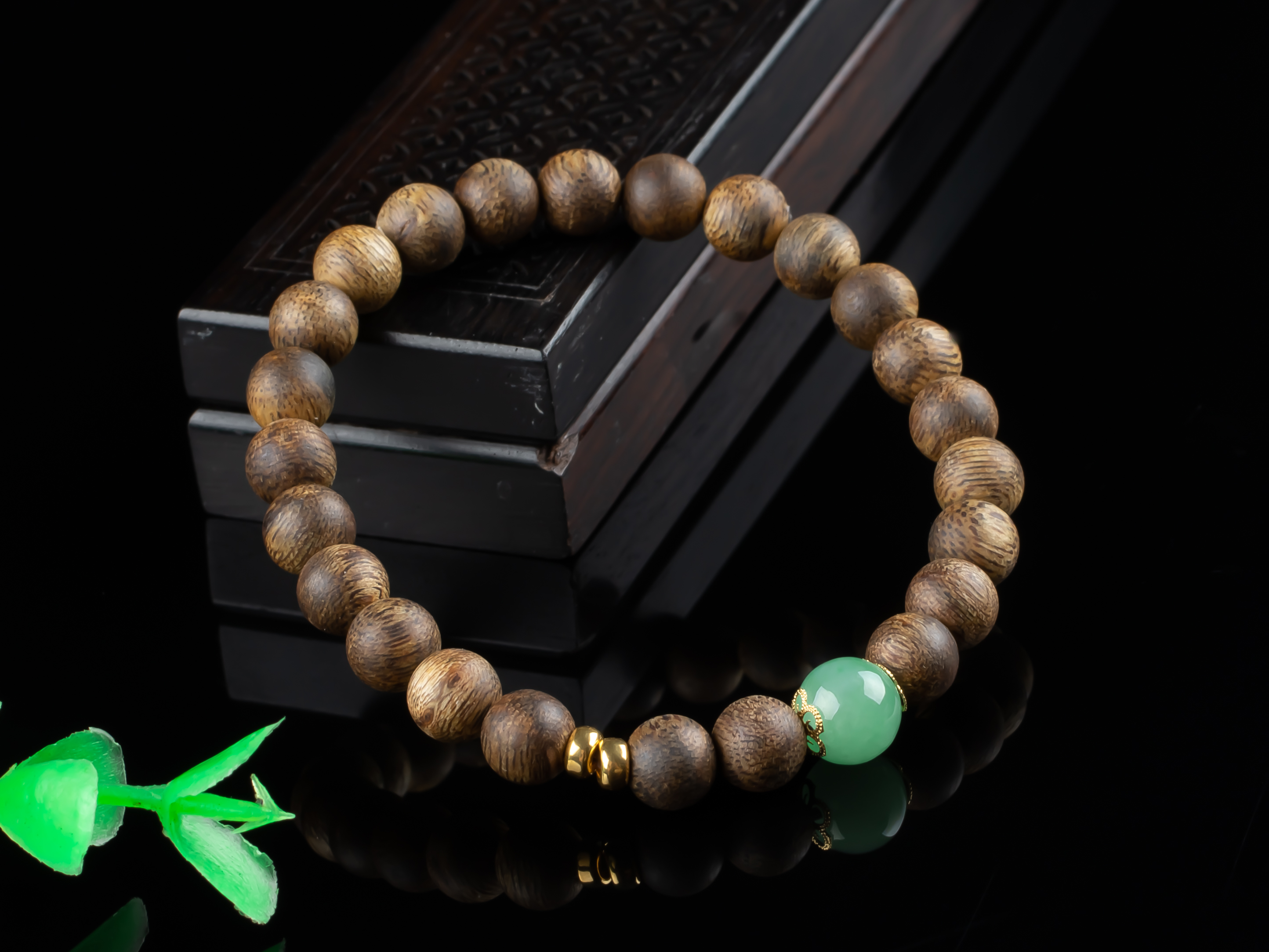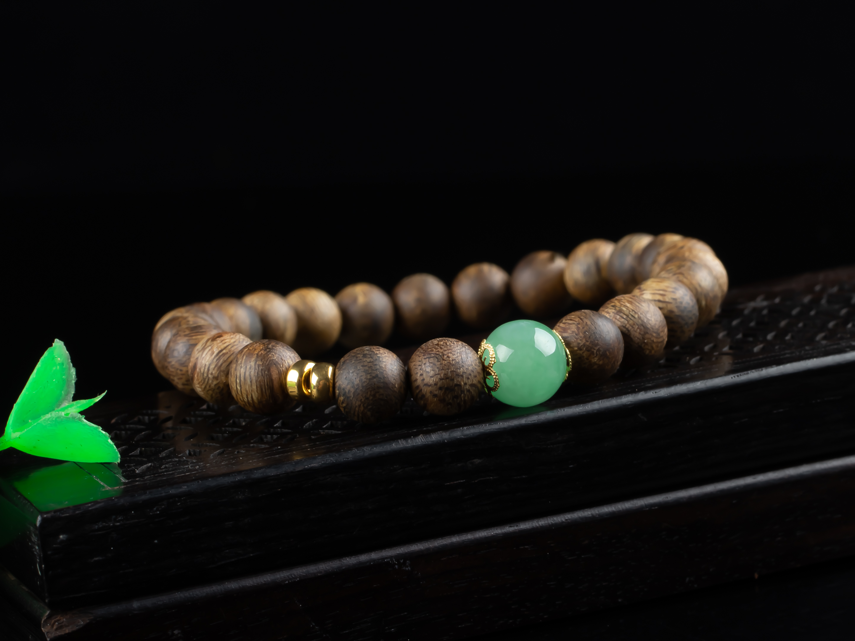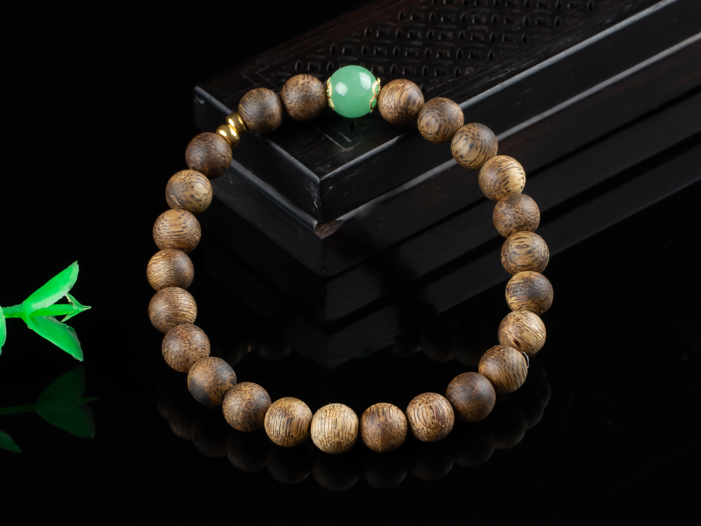 XY0111沉香翡翠18K金隔珠手串,天然沉香圆珠7.3mm,原色原味,香味自然清甜,一颗冰种翡翠珠子7.7mm,以18K金双珠穿搭,成双成对,好运连连、好事成双,快乐翻倍。