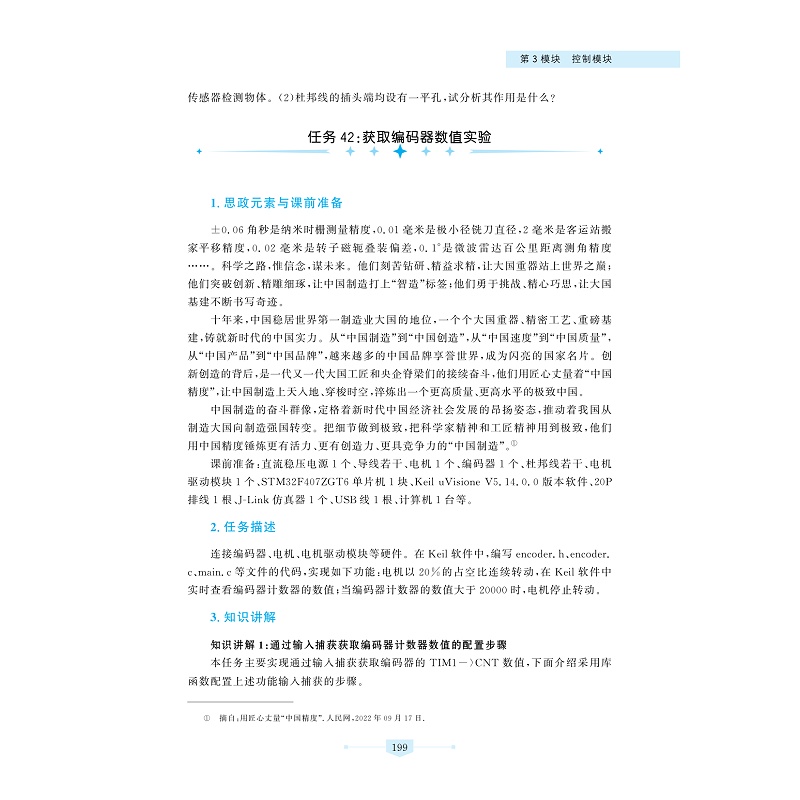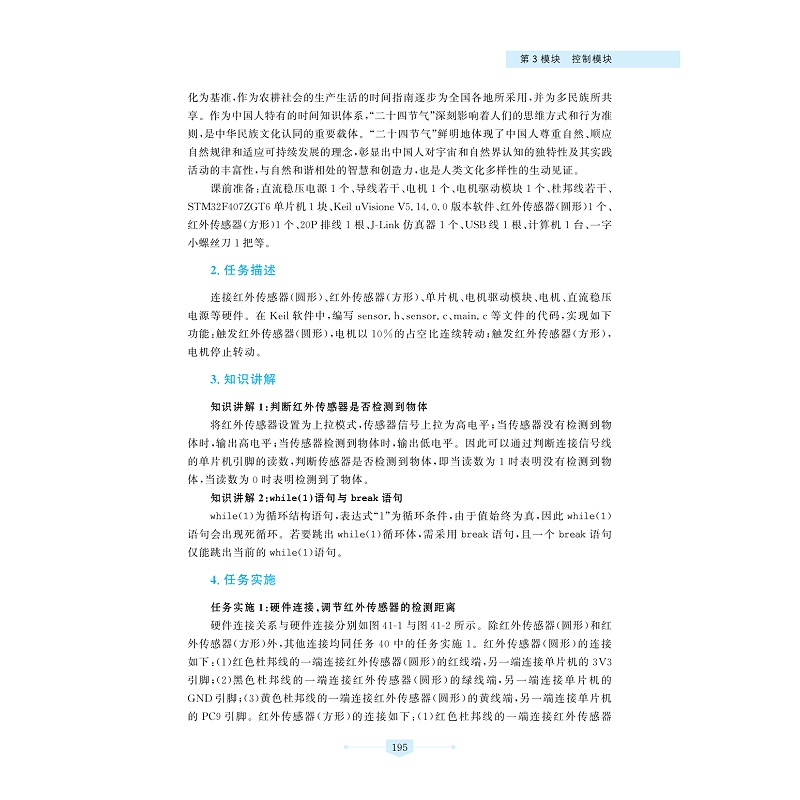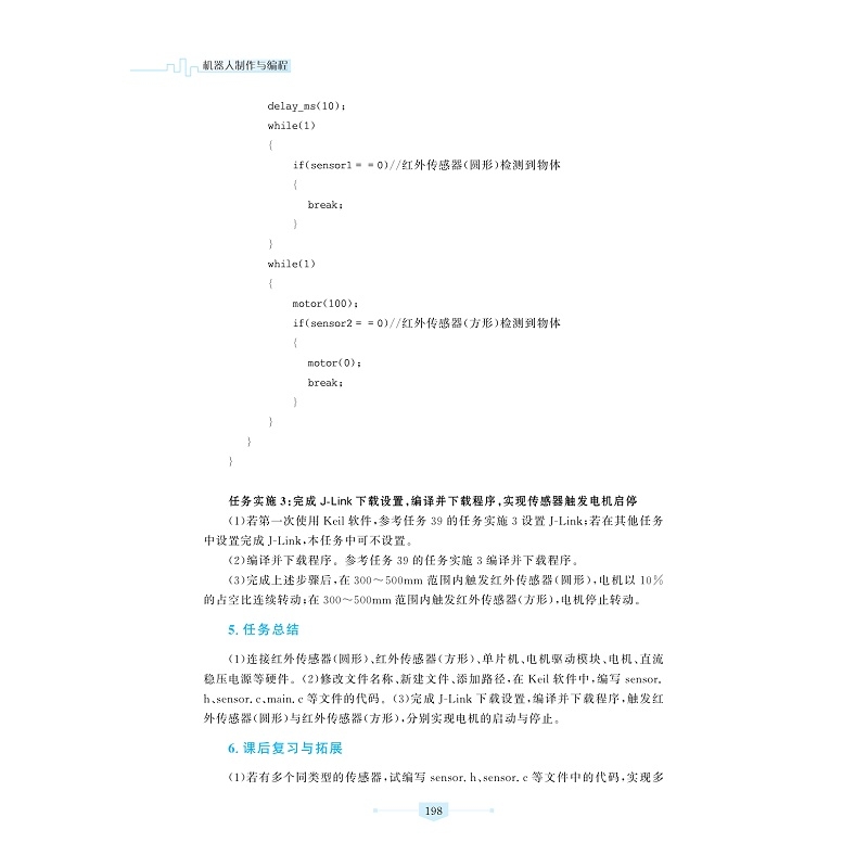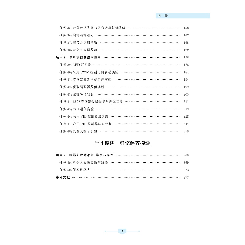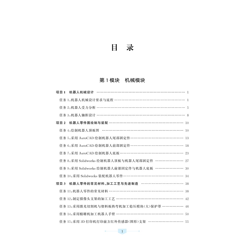 本书以大学生机器人竞赛中的移动机器人为对象,划分为机械模块、电子模块、控制模块、维修保养模块等4个模块,涉及机械设计、理论力学、机械图样识读与绘制、AutoCAD绘图技术、Solidworks三维建模技术、工程材料、机械制造工艺与先进制造技术、电工与电子、电机与拖动、传感器与检测技术应用、机器视觉技术、电路板设计与制作、焊接技术、C语言程序设计、单片机控制技术、控制算法、机电设备故障诊断与维修、保养技术等多门课程知识。本书采取项目引领、任务驱动的方式,编排了9个项目、50个任务,每一个任务均由思政元素与课前准备、任务描述、知识讲解、任务实施、任务总结、课后复习与拓展等6部分内容组成。