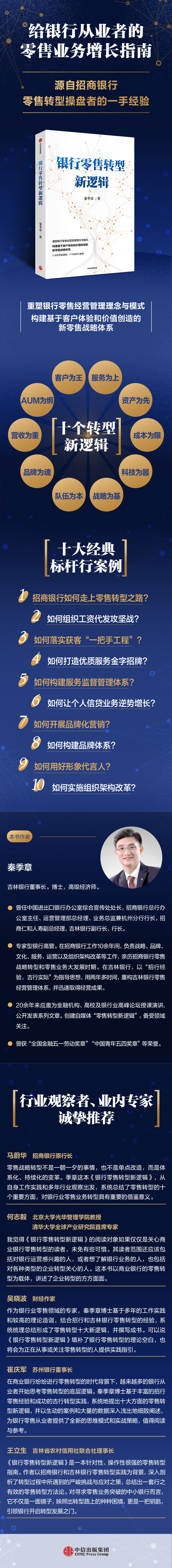 给银行从业者的一本零售转型指南。近年来,受利率市场化、经济周期波动等因素影响,商业银行主要依靠公司业务的运营模式遭遇挑战,而零售业务巨大的市场潜力,以及在银行业务中的资本回报高、风险水平低、带动作用大、业绩波动小等优势,使得银行纷纷开启零售转型。银行零售转型包含两个层面的任务:一是零售业务本身的转型,即经营管理由存款导向的传统模式,转变为盈利导向的现代模式;二是银行业务整体的转型,即零售业务的规模和盈利在全行中的占比逐步攀升,成为整个银行主要乃至大的支柱。这本书作者基于在招商银行零售业务领域的多年工作经验以及在吉林银行的工作实践,结合兴业银行和平安银行等标杆行零售转型的探索实践,在战略和操作层面对商业银行零售转型提出新的逻辑,并提炼为十大方面,包括客户为王、服务为上、AUM为纲、资产为先、营收为重、成本为限、品牌为魂、科技为器、队伍为本、战略为基,力图给为零售转型所苦、所惑、所困的商业银行提供一份实操手册。