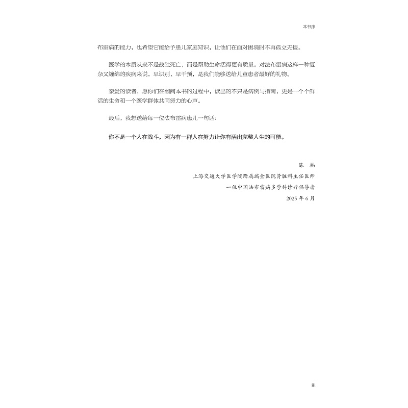 法布雷病不仅是一个酶缺乏导致的溶酶体贮积病,更是一种影响家庭命运的“慢性遗传时间炸弹”。而儿童患者,则是这场风暴中最脆弱的中心。但同时,儿童也是最具有韧性的。本书的问世,是一件值得欣慰、值得敬畏的事情。它不仅填补了国内在该领域系统化的儿童专著的空白,更重要的是,它为无数个家庭带来了一束“可及的光”。医学的本质从来不是战胜死亡,而是帮助生命活得更有质量。对法布雷病这样一种复杂又缠绵的疾病来说,早识别、早干预,是我们能够送给儿童患者最好的礼物。