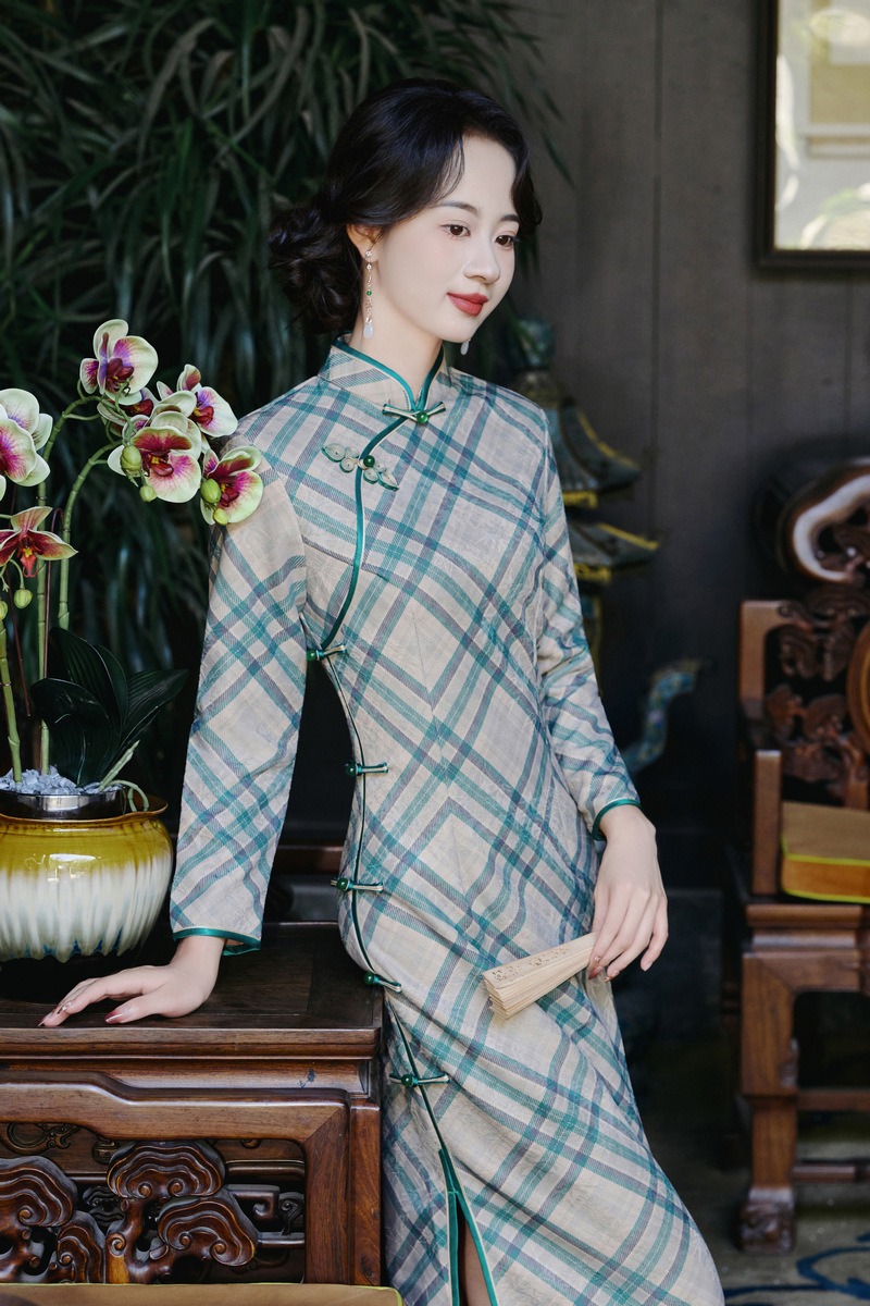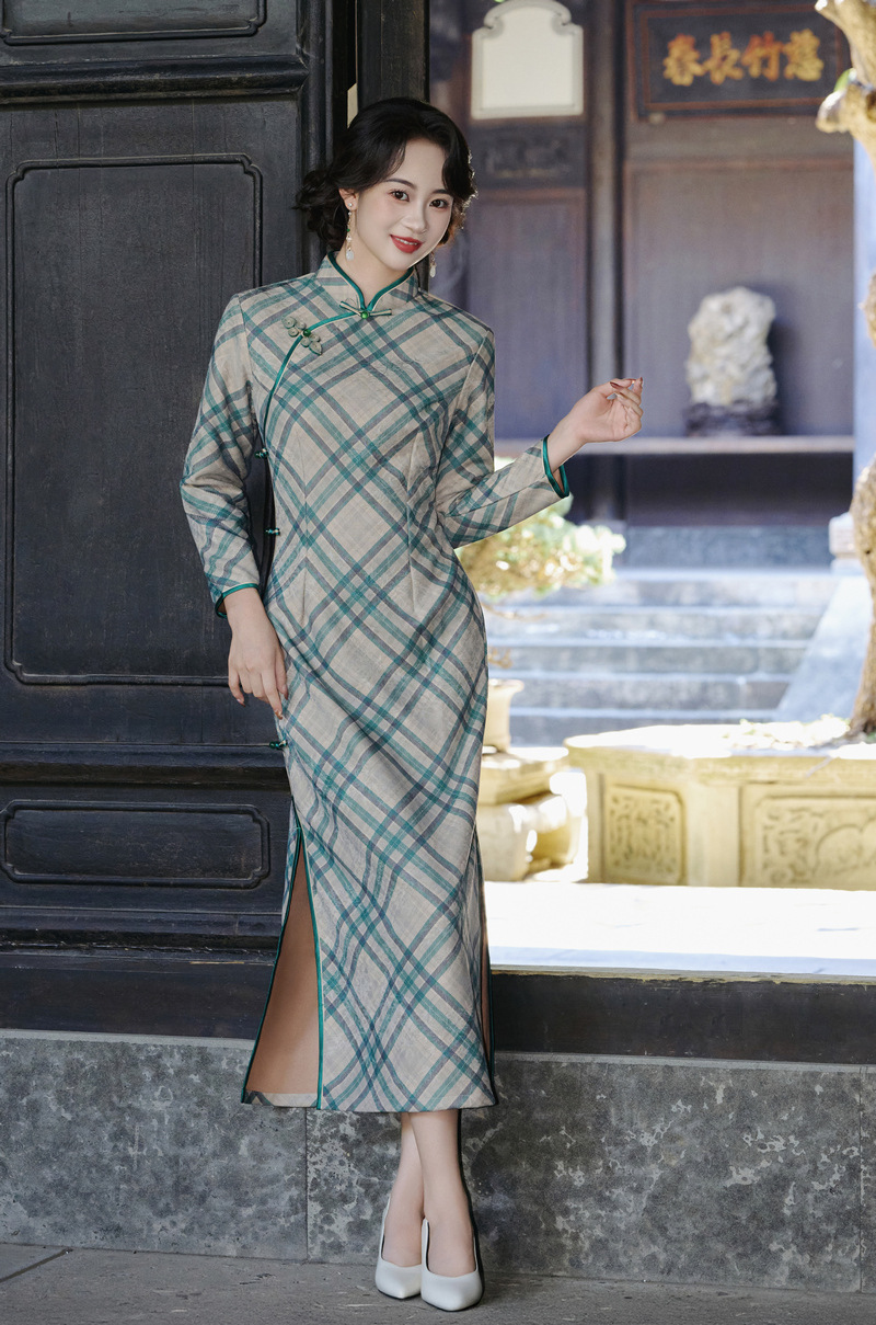 WC9362 新式旗袍2025秋冬款中国风优雅气质长款平绒显瘦修身连衣裙菱格