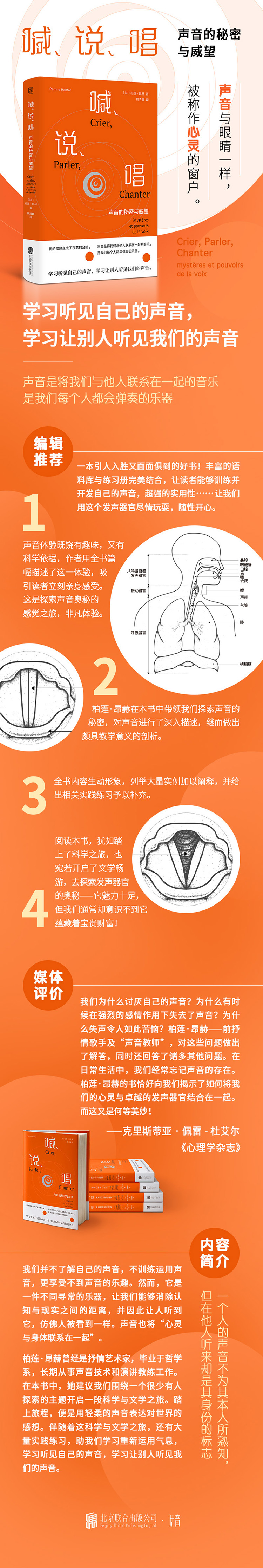 我建议大家完成一次这样亲密的奇特之旅,在他人与您自己的声音之间闲庭信步,沉浸于振动与感觉、科学与文学的世界。我们的声音是生机勃勃的动物,我们感觉其既习以为常, 又原始荒芜,既饱含情感,又迷人性感,我愿邀您聆听、质疑或者驯服这声音。从我们的第一声啼哭到最后一声喘息,我们的声音陪伴着我们,抒发着我们的情感与思想。抱怨、喊叫、 交谈、引诱、说服、歌唱……它神秘又美丽,是我们与他人及世界之间音乐般的桥梁,是我们每个人都能演奏的乐器,有着巨大无比的可能性。