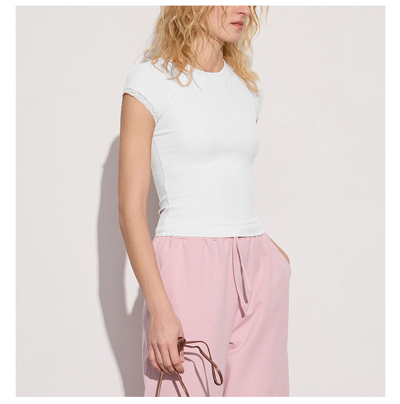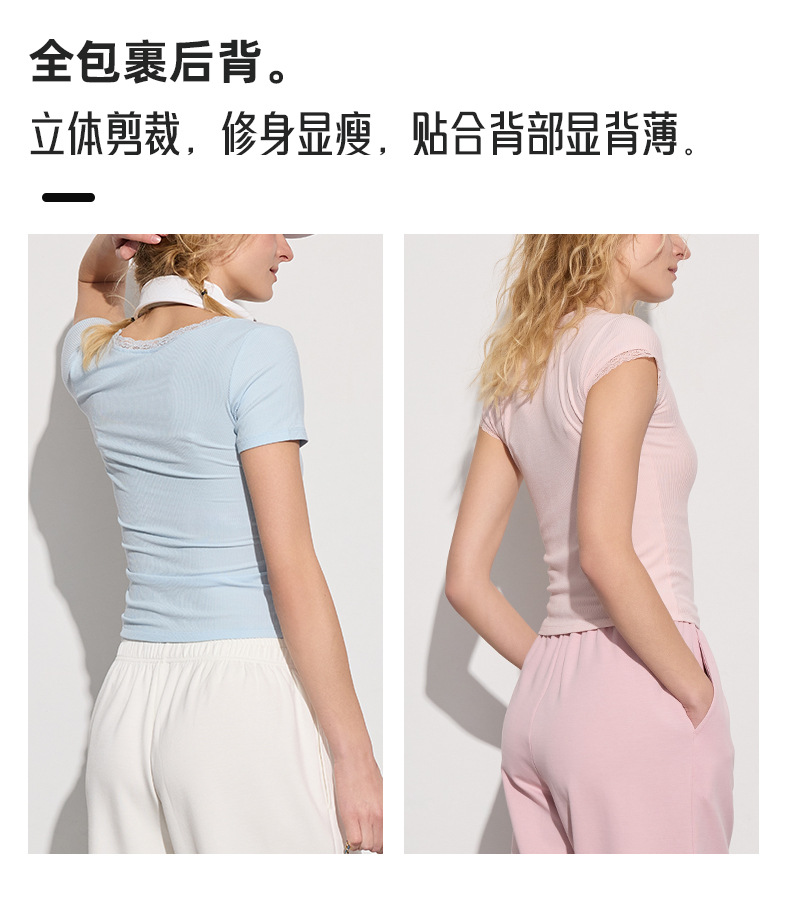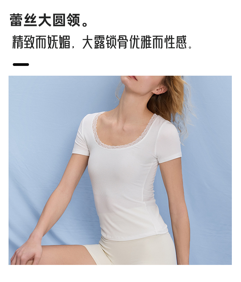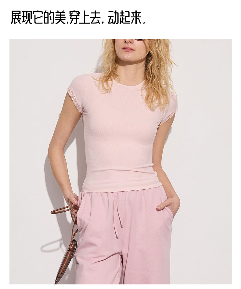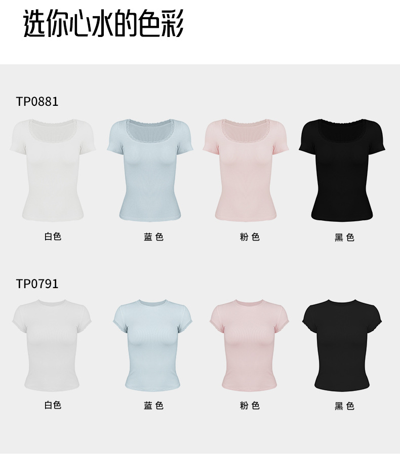 跃牌【周游世界系列】春夏新款圆领蕾丝花边短袖T恤修身打底运动短款健身服TP0791/TP0881