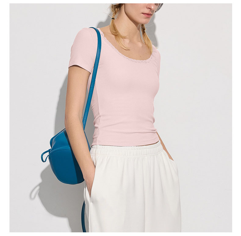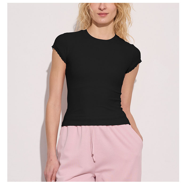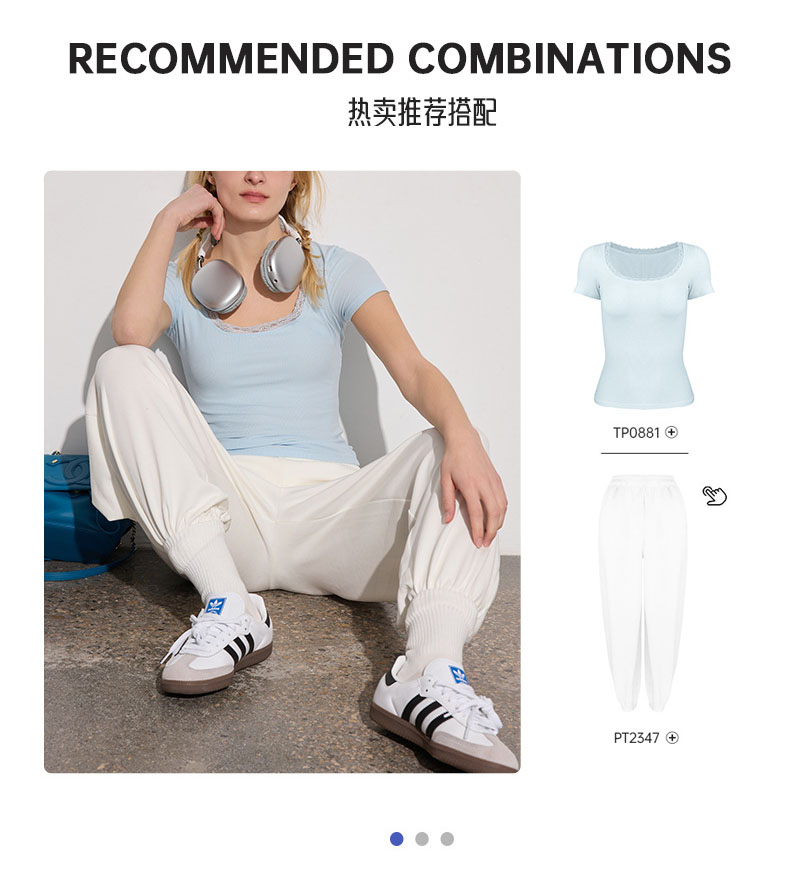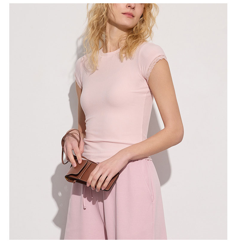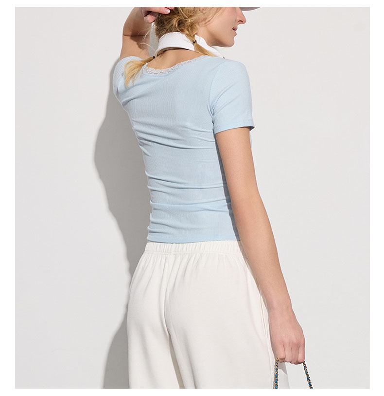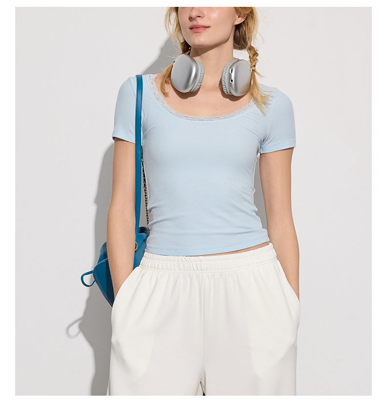 跃牌【周游世界系列】春夏新款圆领蕾丝花边短袖T恤修身打底运动短款健身服TP0791/TP0881