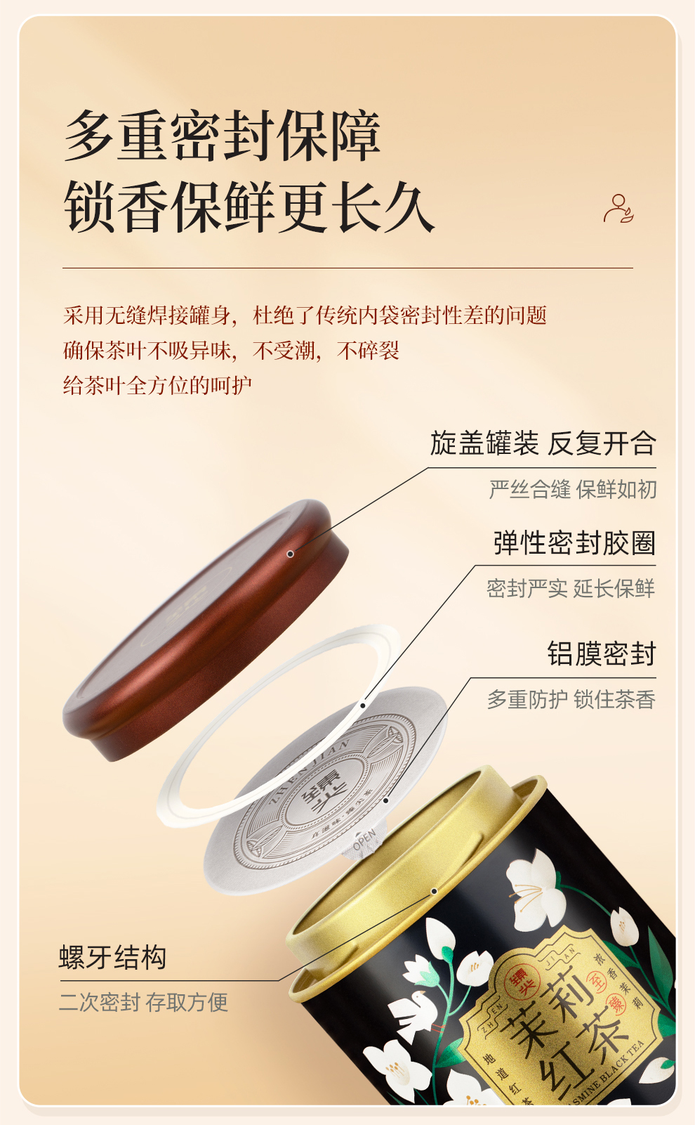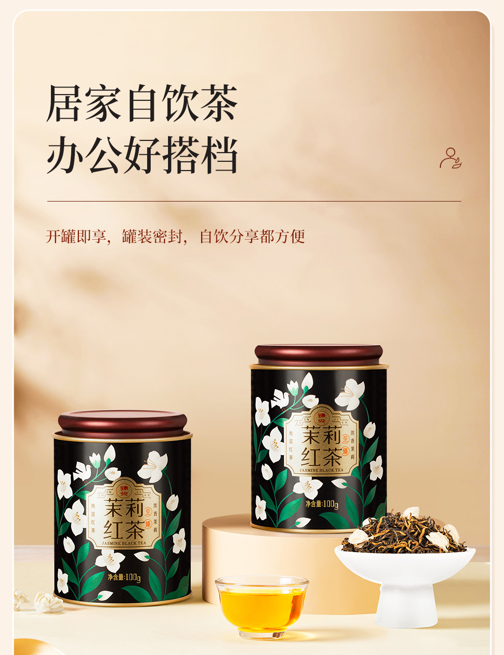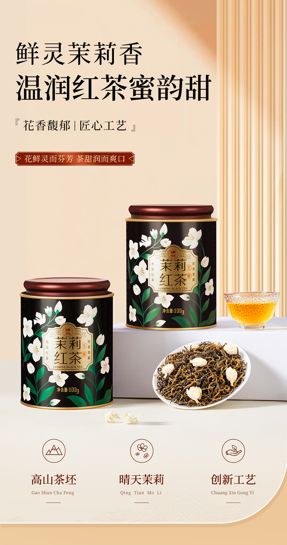 【臻尖-茉莉红茶至臻】茉莉红茶特级浓香型茉莉花茶茶叶100g*2罐