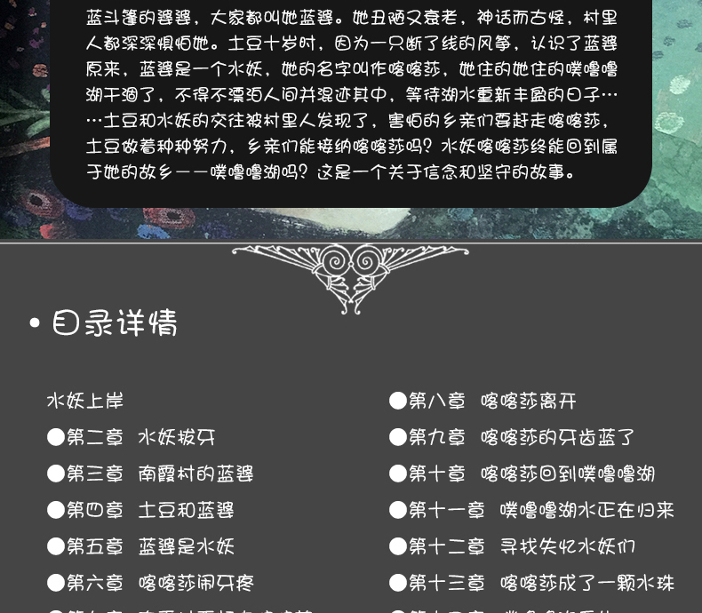 汤汤编著的《水妖喀喀莎》讲述了,南霞村晒谷坪边的一间泥土屋里住着一个穿蓝斗篷的婆婆,大家都叫她蓝婆。她丑陋又衰老,神话而古怪,村里人都深深惧怕她。土豆十岁时,因为一只断了线的风筝,认识了蓝婆。原来,蓝婆是一个水妖,她的名字叫作喀喀莎,她住的她住的噗噜噜湖干涸了,不得不漂泊人间并混迹其中,等待湖水重新丰盈的日子……土豆和水妖的交往被村里人发现了,害怕的乡亲们要赶走喀喀莎,土豆做着种种努力,乡亲们能接纳喀喀莎吗?水妖喀喀莎最终能回到属于她的故乡——噗噜噜湖吗?这是一个关于信念和坚守的故事。