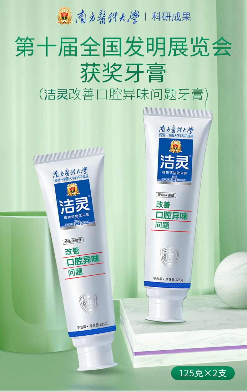 - 洁灵牙膏,由南方医科大学研制,牙膏的核心8081功效成分效果出众,在第十届全国发明展览会成为获奖牙膏。