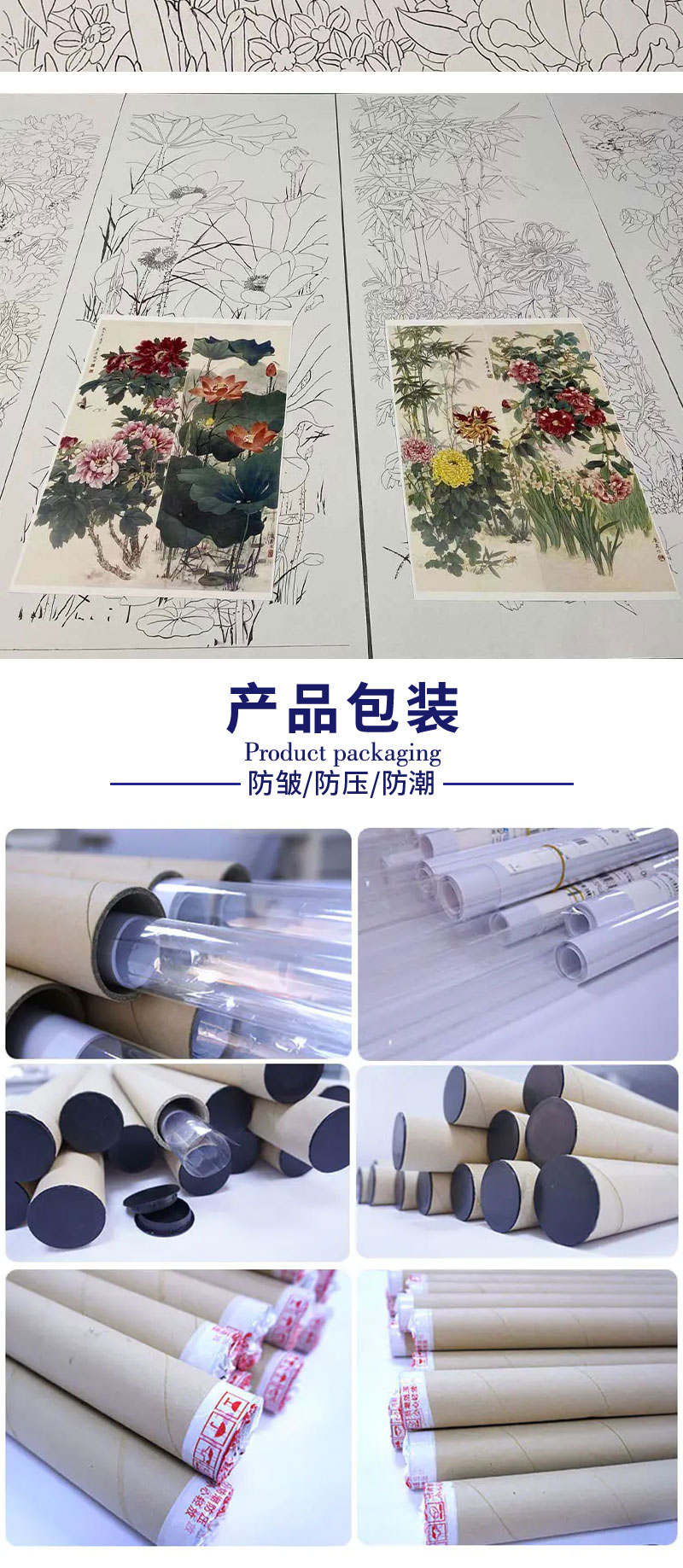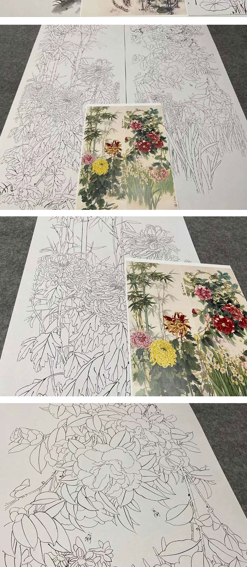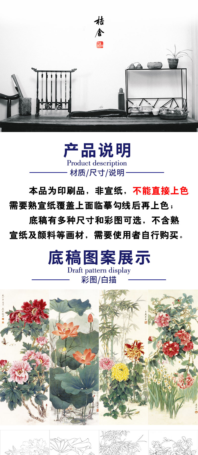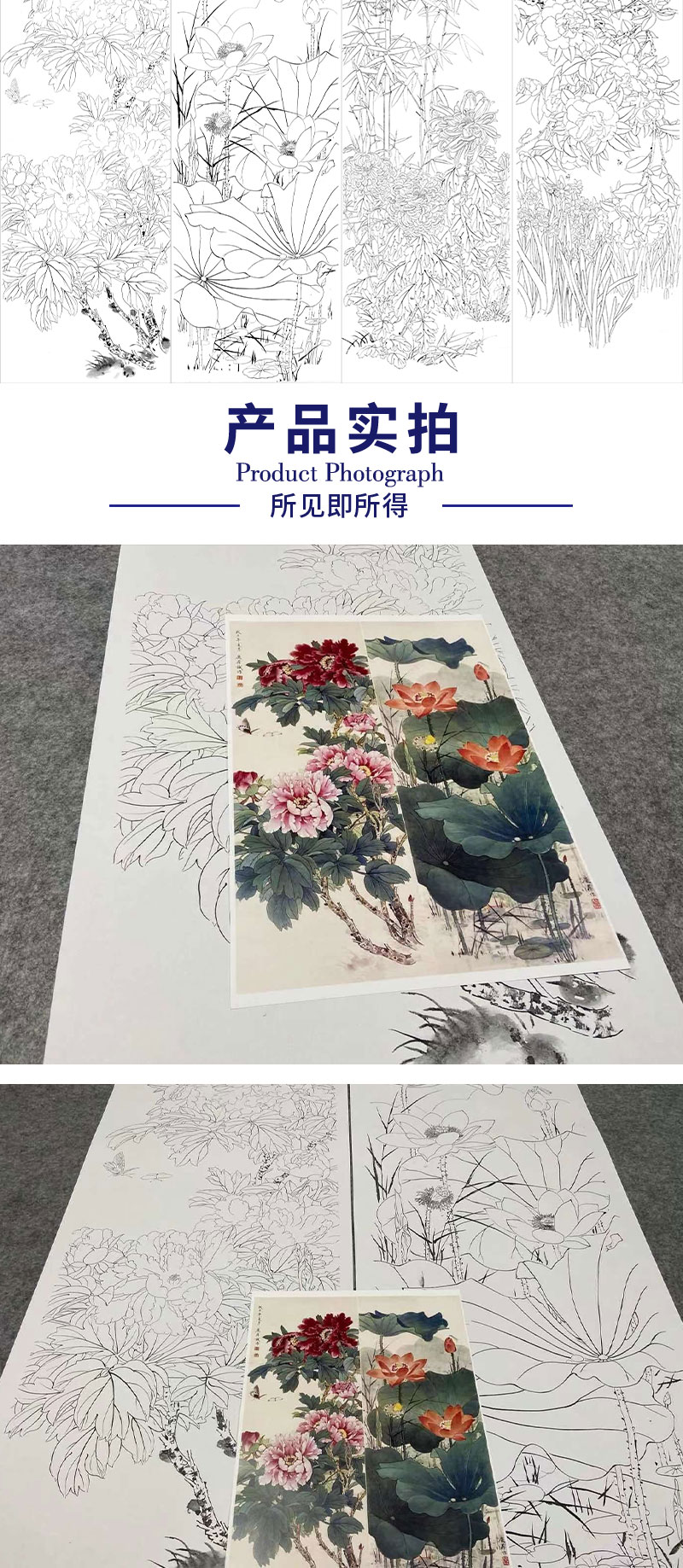 【四条屏】王庆升工笔画白描底稿《四季花卉图》荷花牡丹临摹花鸟线稿TP38