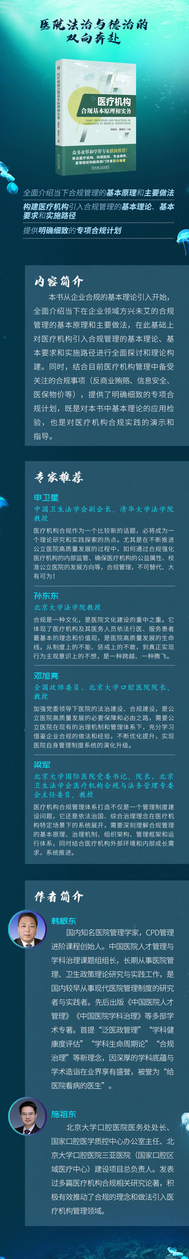 本书从企业合规的基本理论引入开始,全面介绍当下在企业领域方兴未艾的合规管理的基本原理和主要做法,在此基础上对医疗机构引入合规管理的基本理论、基本要求和实施路径进行全面探讨和理论构建。同时,结合目前医疗机构管理中备受关注的合规事项(反商业贿赂、信息安全、医保物价等),提供了明确细致的专项合规计划,既是对本书中基本理论的应用检验,也是对医疗机构合规实践的演示和指导。