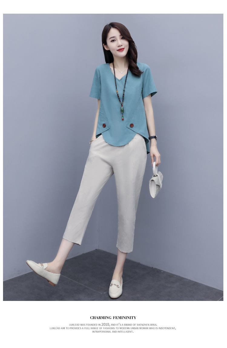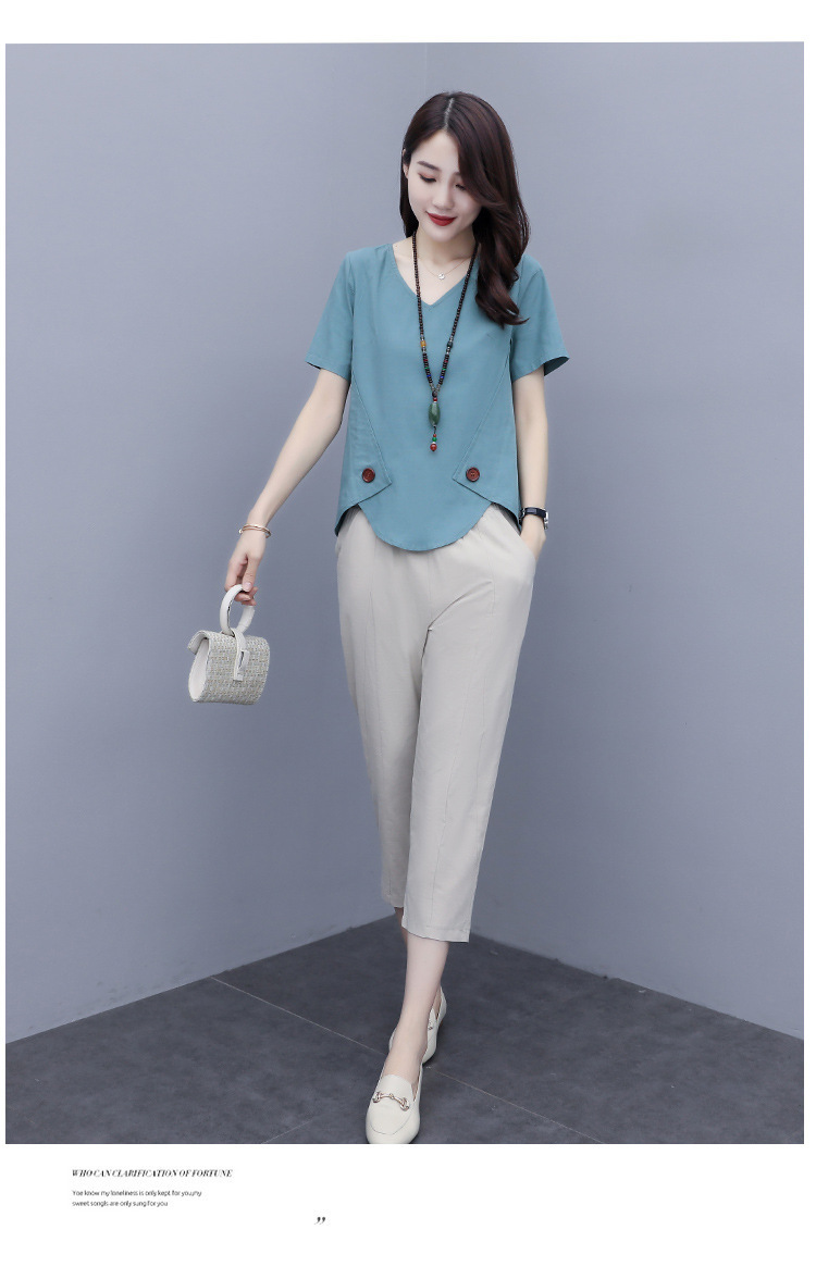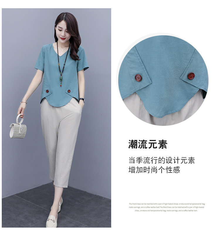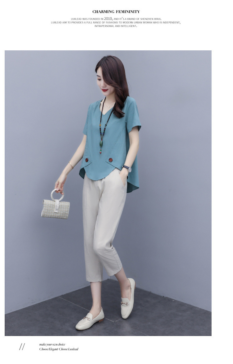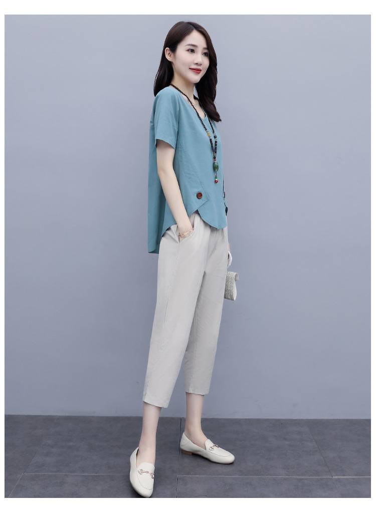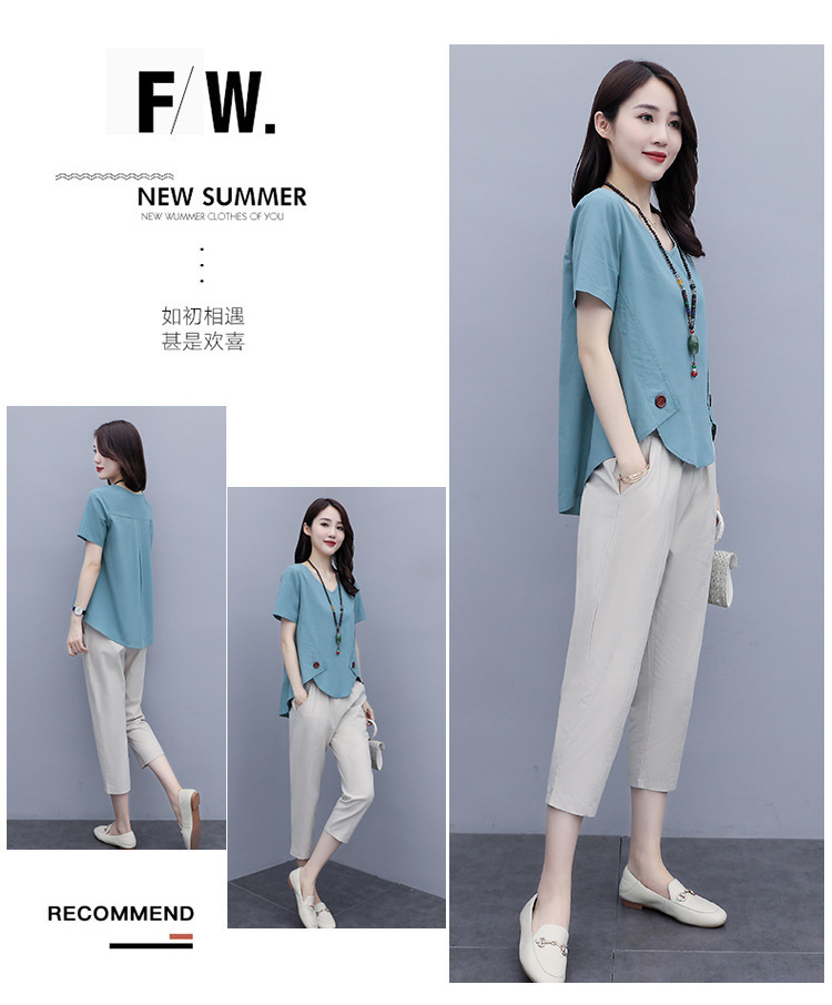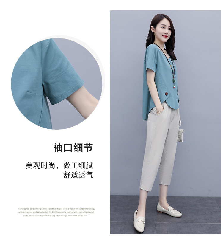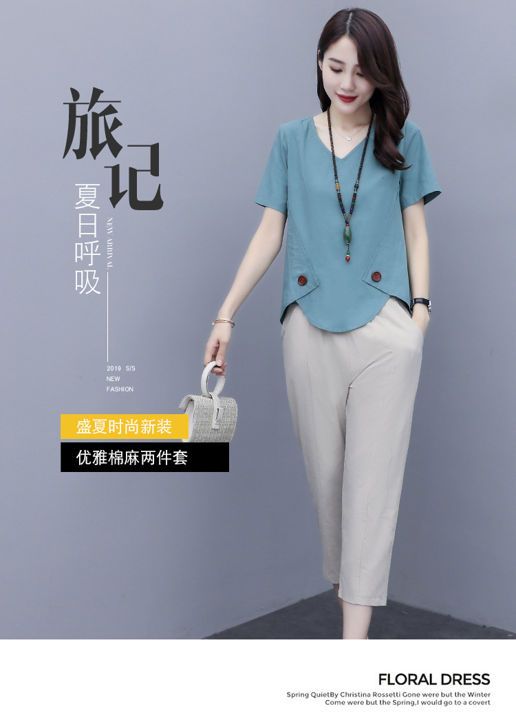YRH-纯色棉麻套装2020气质宽松显瘦亚麻两件套