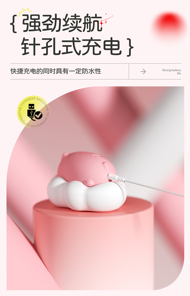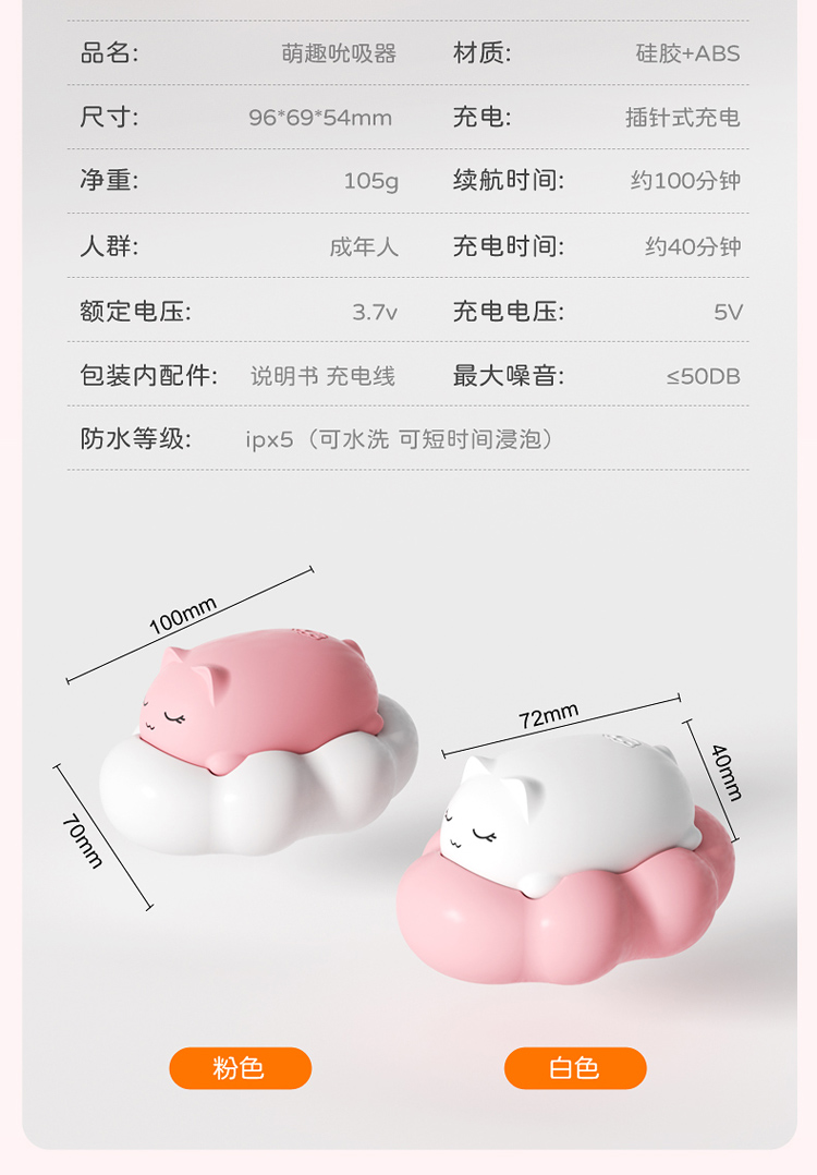 【产品名称】漫渺萌趣吮吸器【型号】W29 【尺寸】9.6*6.9*5.4cm【重量】105g【额定电压电流】3.7V-0.25A【电池容量】200mA 【充电电压电流】5V-1A 充满电约40分钟 续航约100分钟【品牌名称】ManMiao漫渺®【品牌商】上海漫渺国际贸易有限公司【执行标准】Q/MMBJ 002-2017【质检标准】GB/T 22048-2008 B6675.4-2014 GB 4706.1-2005合格【产品材质】硅胶+ABS【主要功能】9频吮吸震动/APP远程控制【保质期】3年【生产日期】见包装盒【保存条件】置阴凉干燥处保存【使用方法】见视频或网页【注意事项】1、本产品为成人用品,严禁未成年人使用 2、在废弃器具前,必须将电池从器具中取出3、在取出电池时,器具必须要断电4、电池应安全地处置 5、考虑个人卫生问题,使用之后请及时清洗。