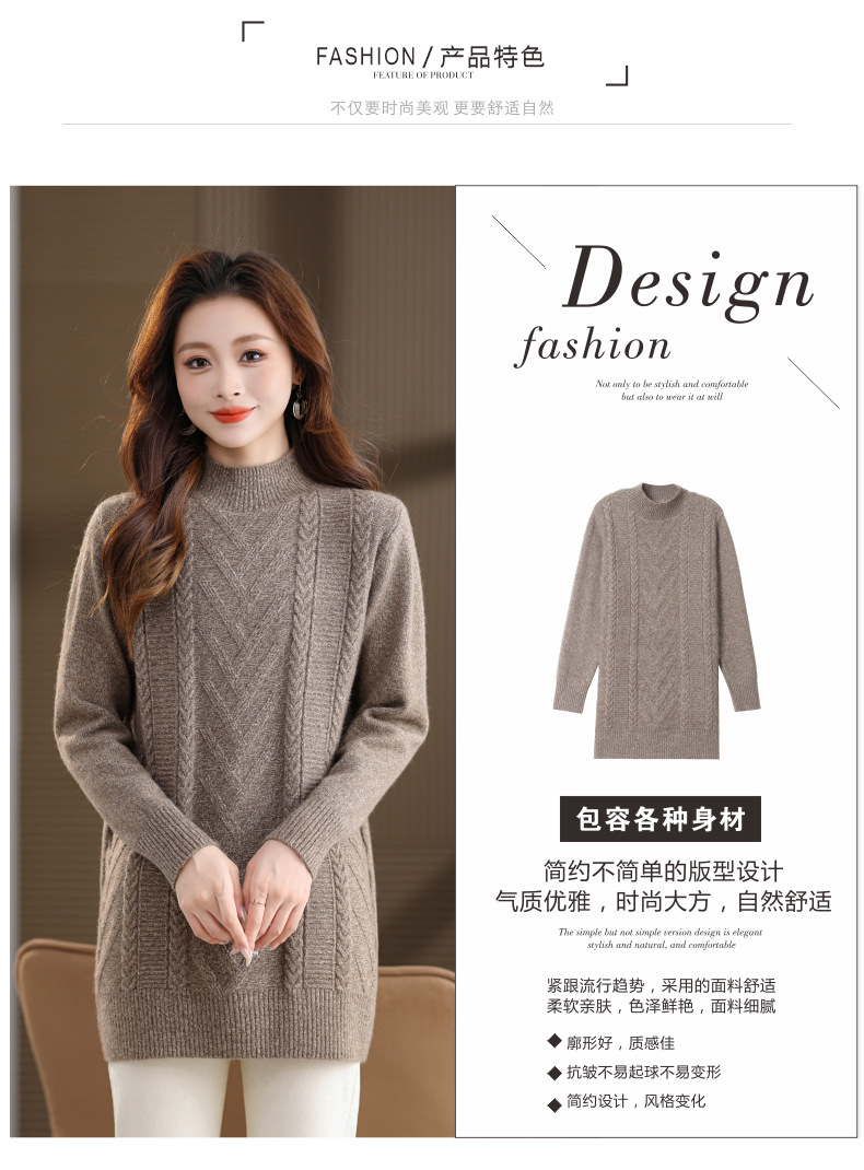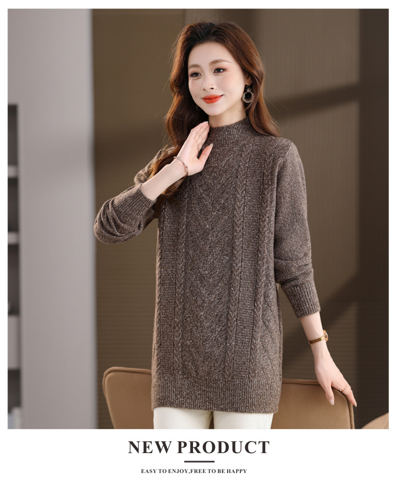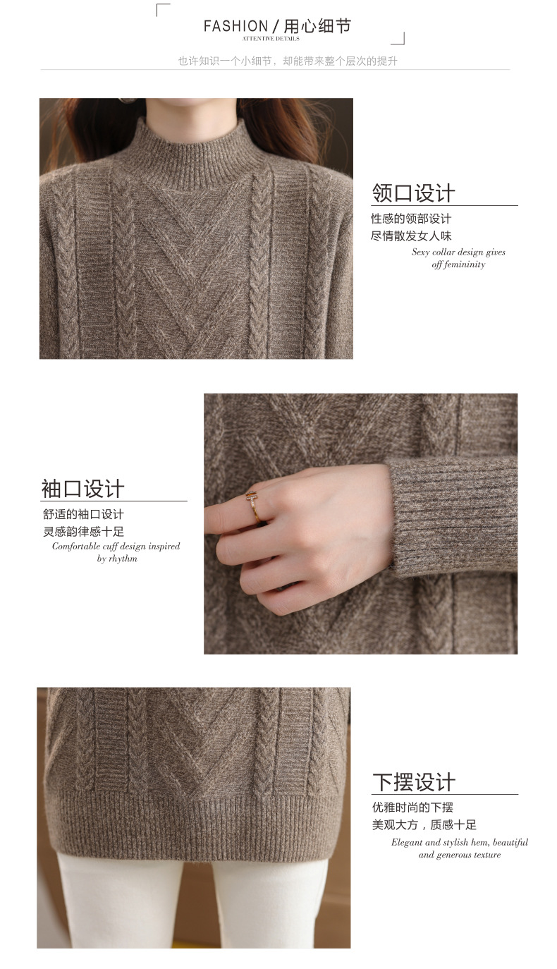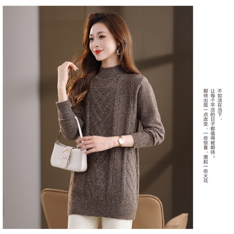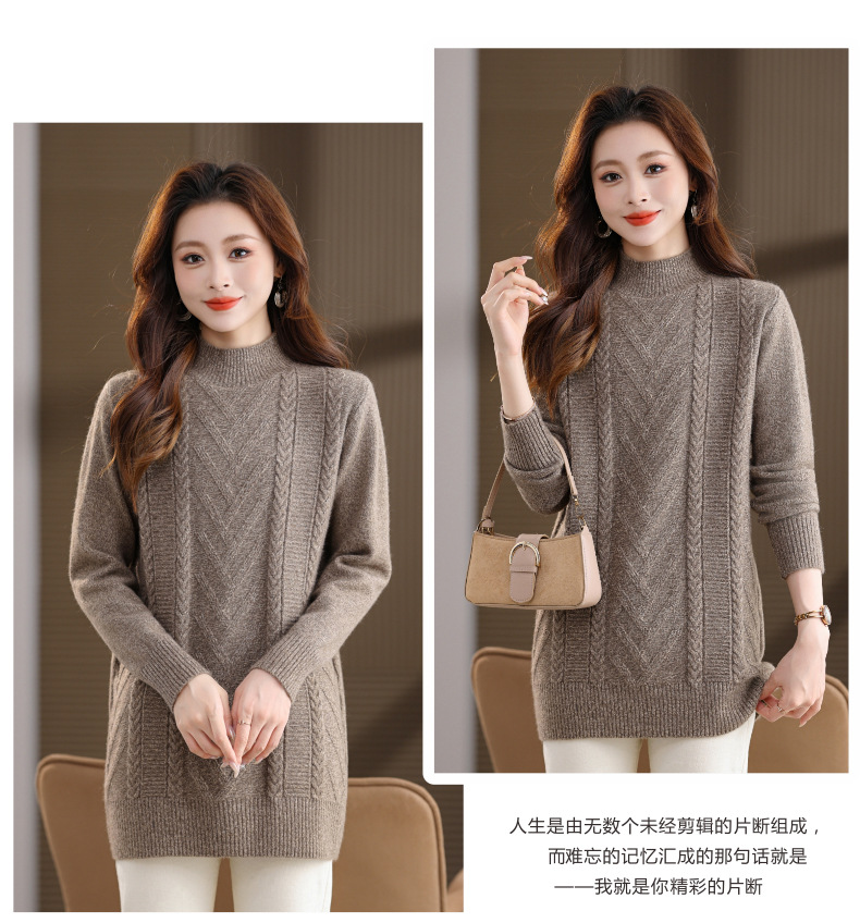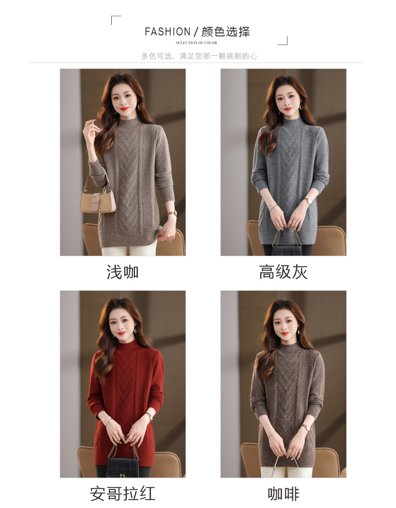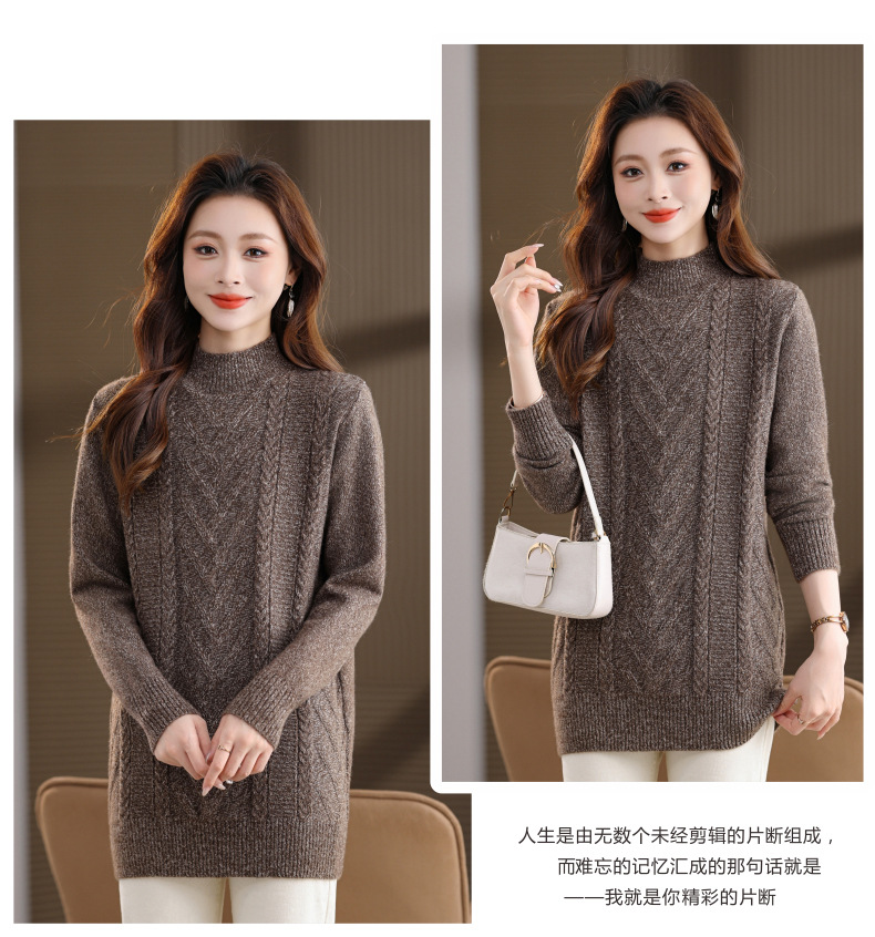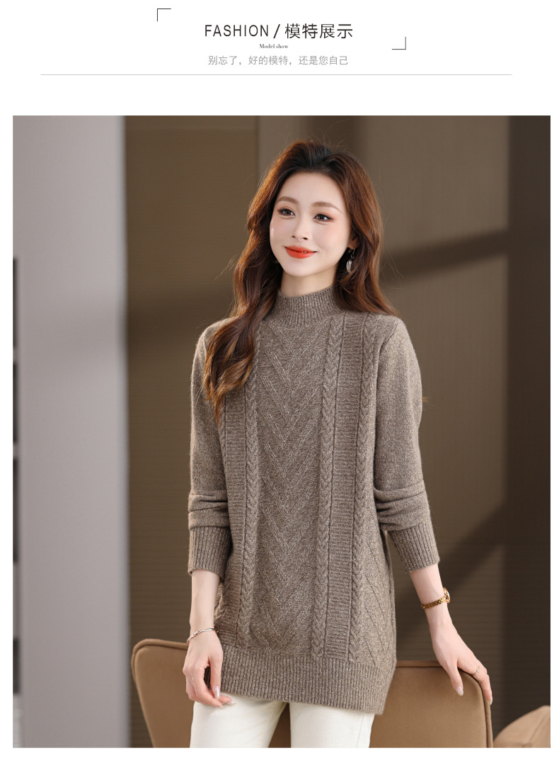 CC半高领中长款毛衣女秋冬季卡其色麻花针织衫宽松显瘦百搭打底毛衣