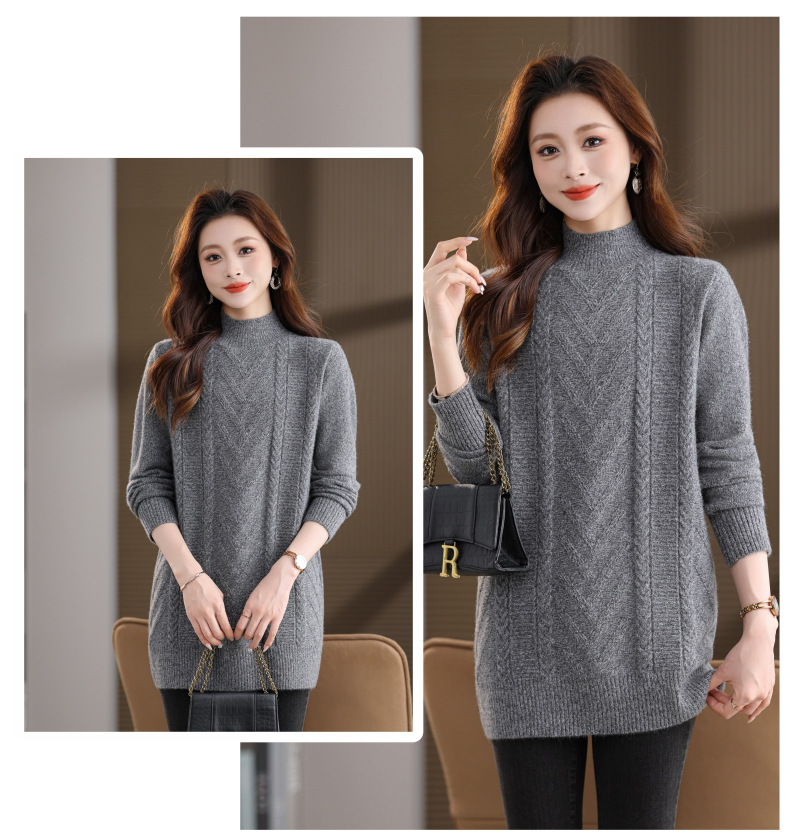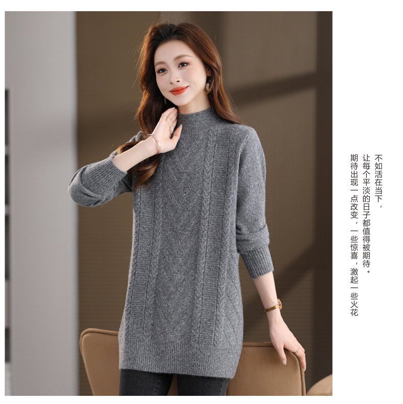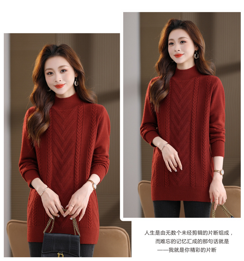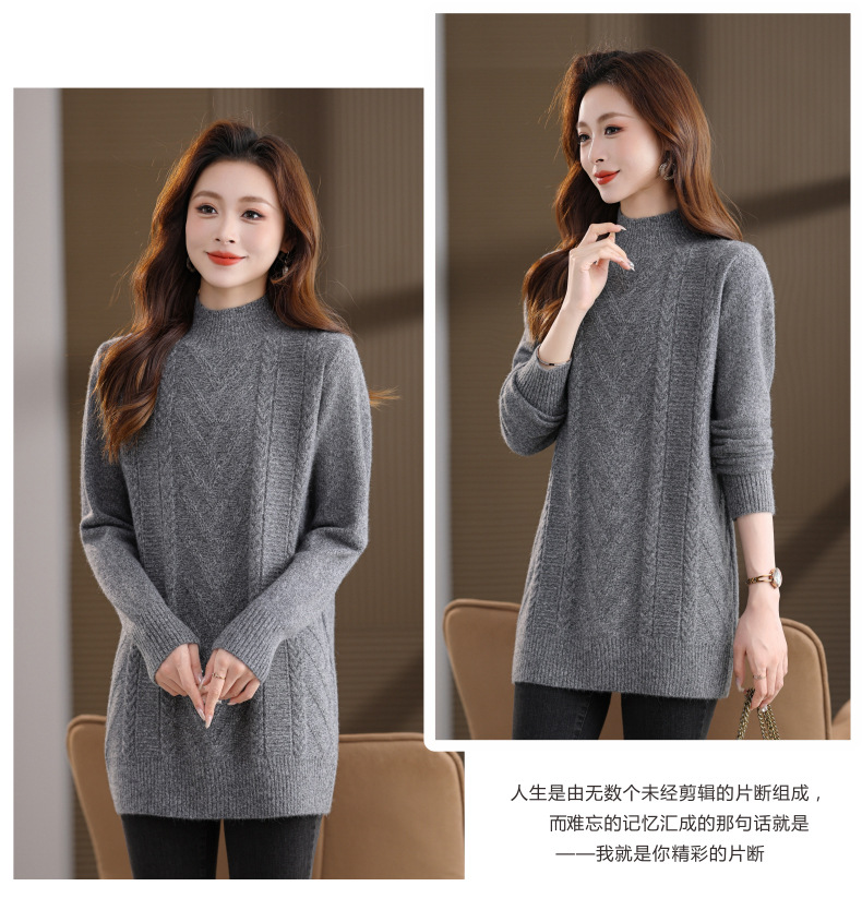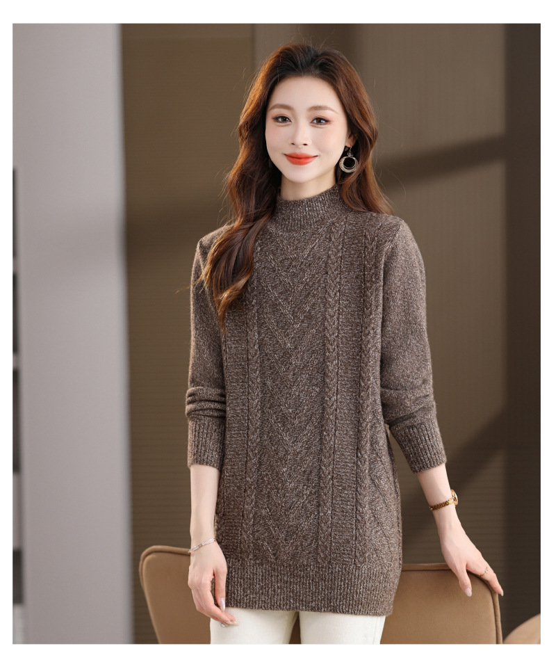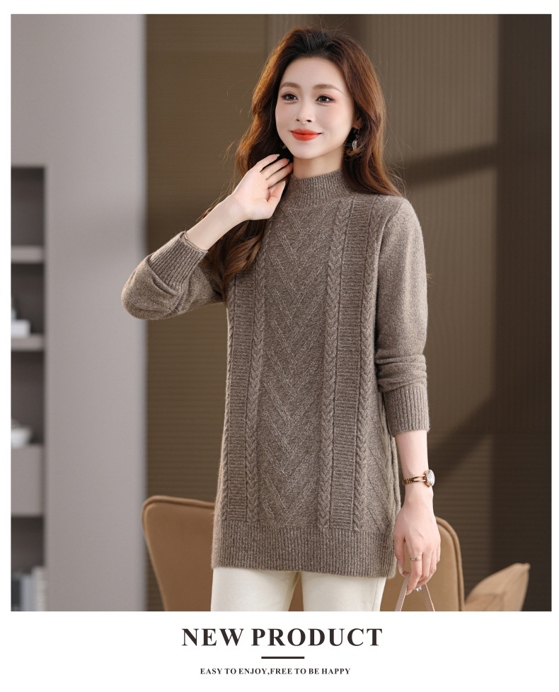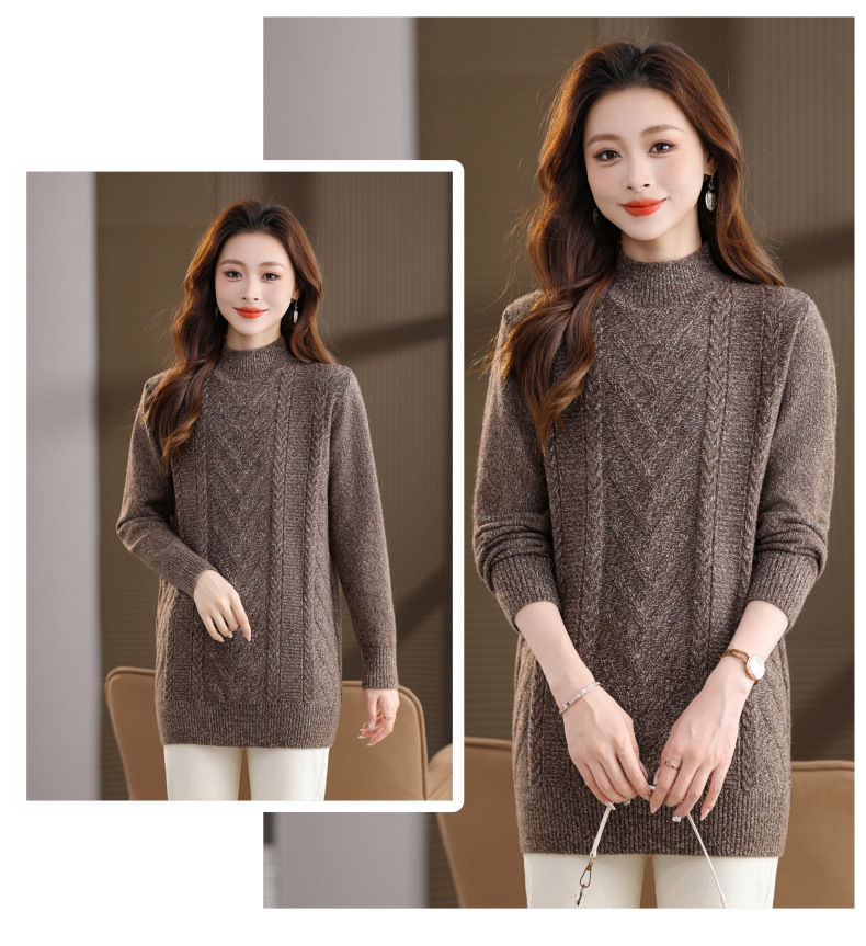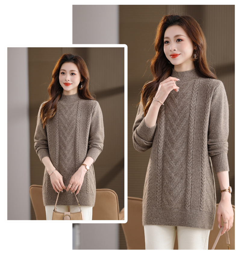 CC半高领中长款毛衣女秋冬季卡其色麻花针织衫宽松显瘦百搭打底毛衣
