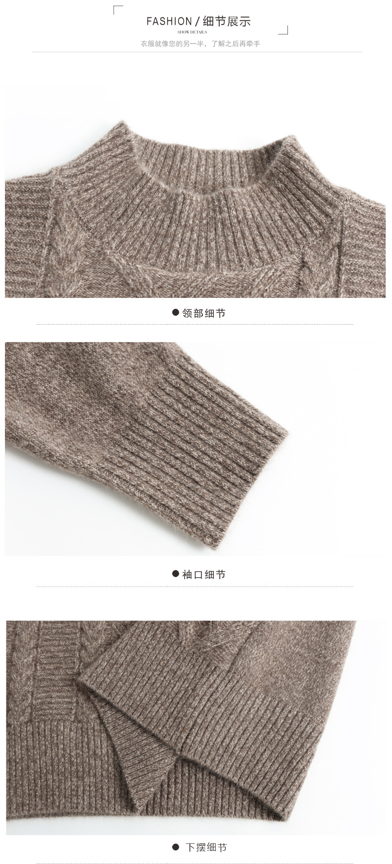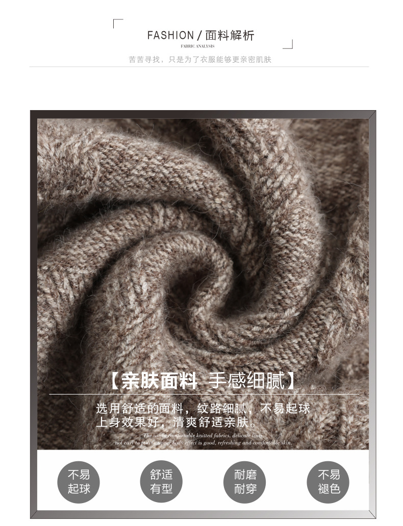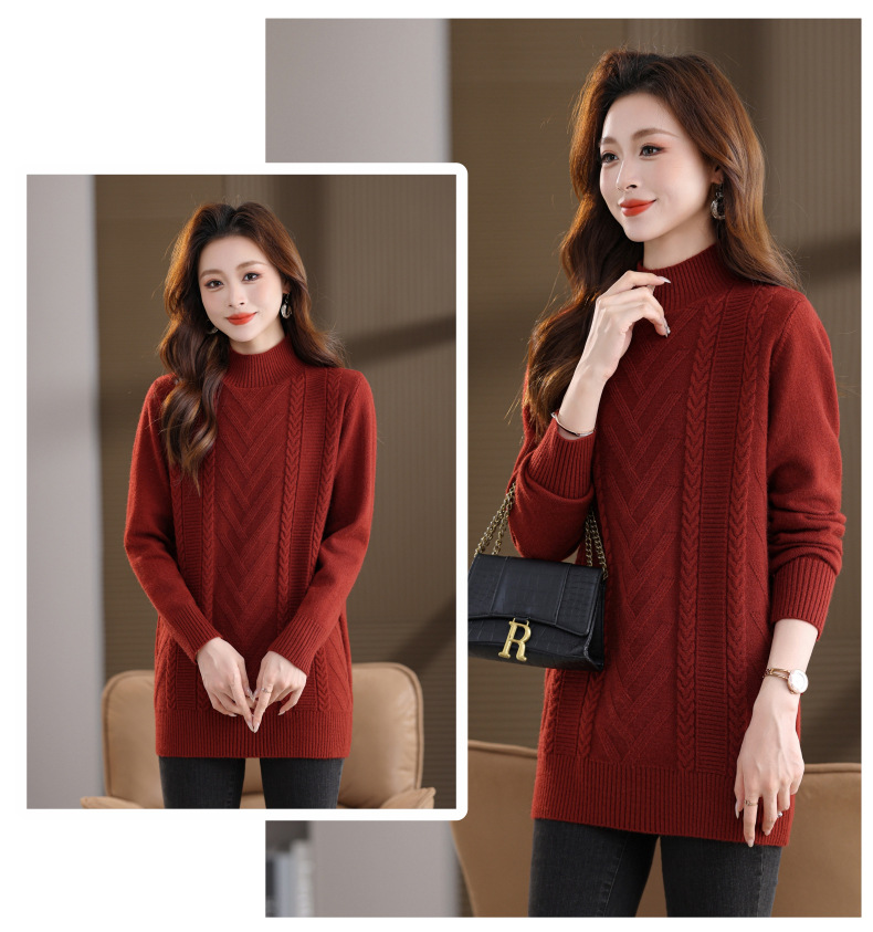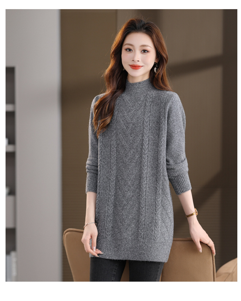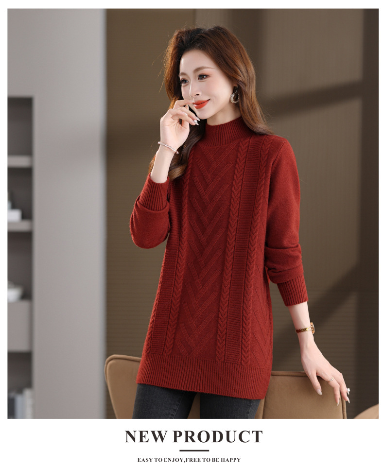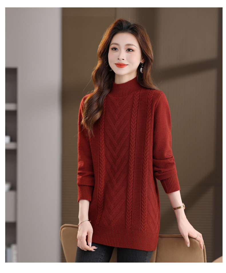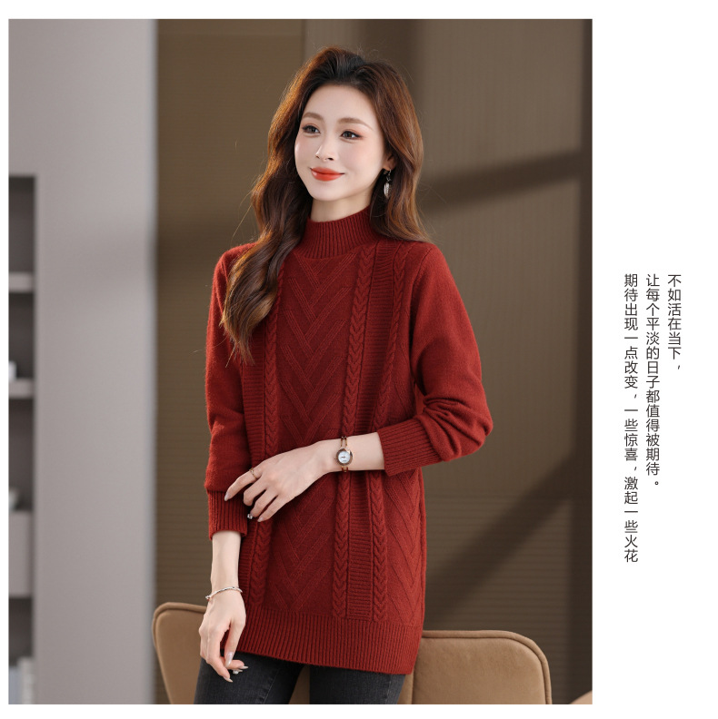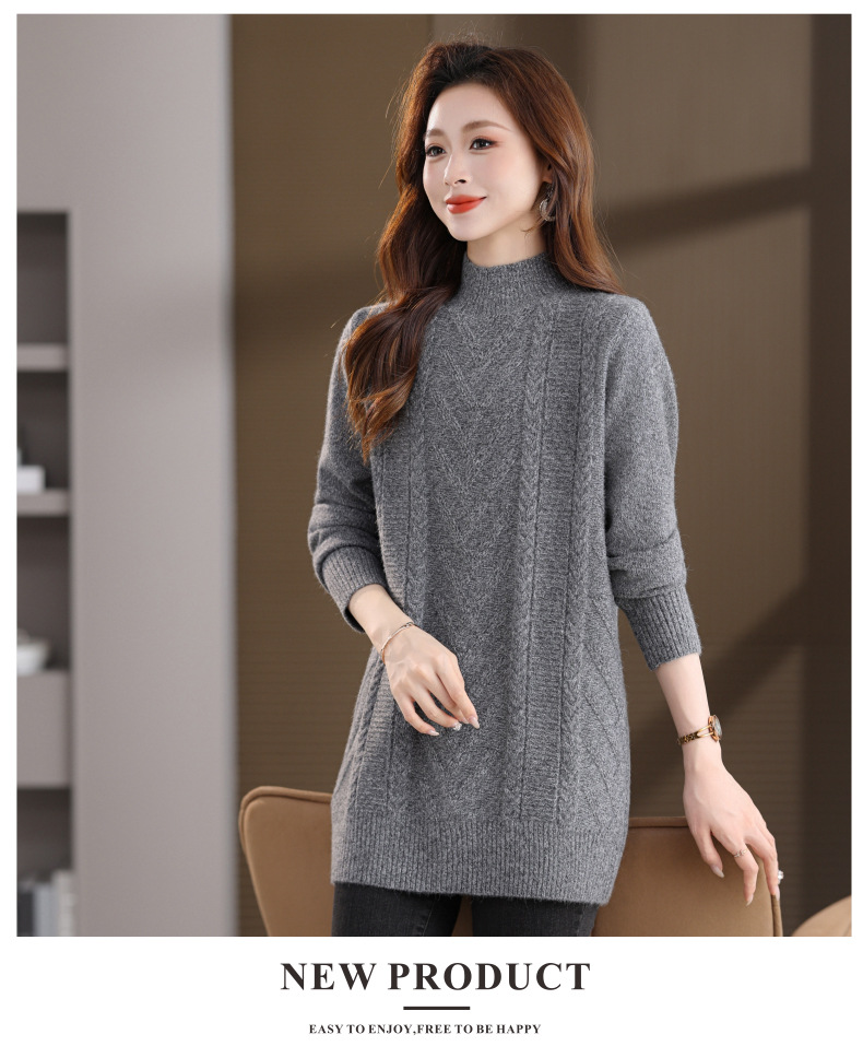 CC半高领中长款毛衣女秋冬季卡其色麻花针织衫宽松显瘦百搭打底毛衣