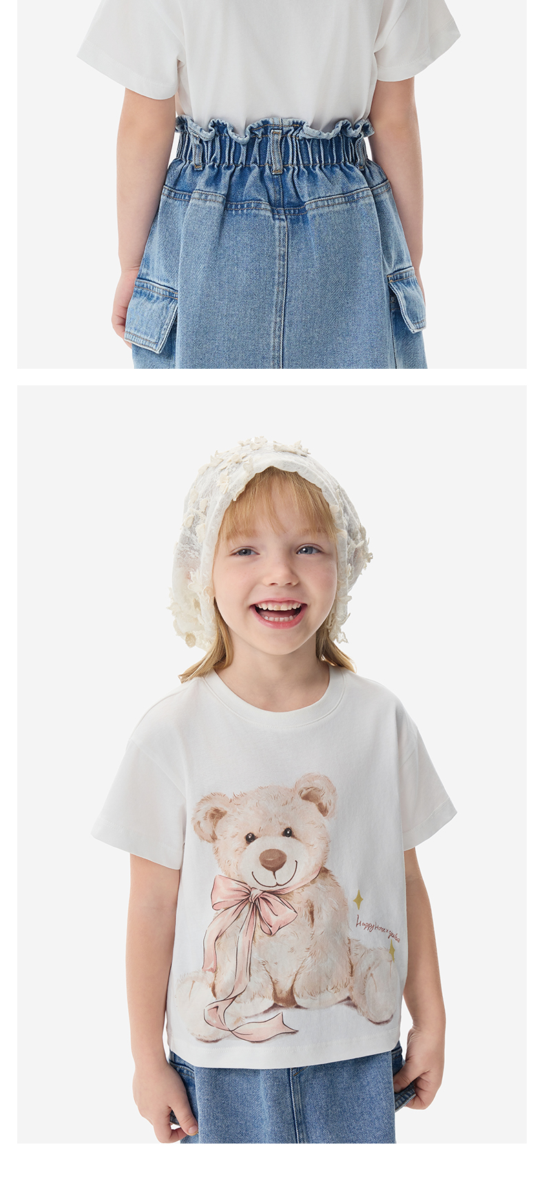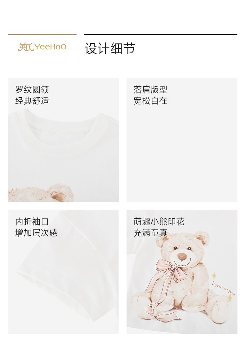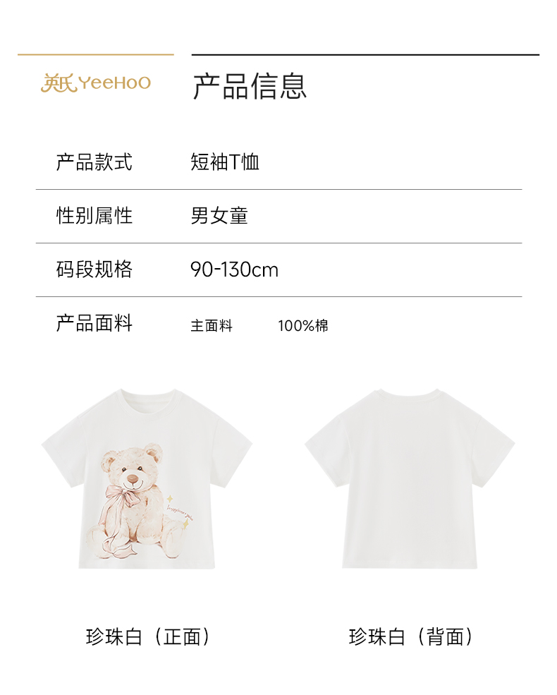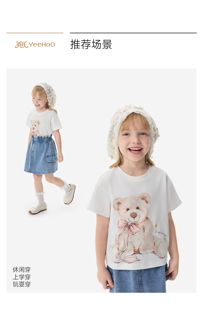 英氏儿童衣服女童夏季百搭短袖圆领T恤纯棉白色卡通休闲套头衫