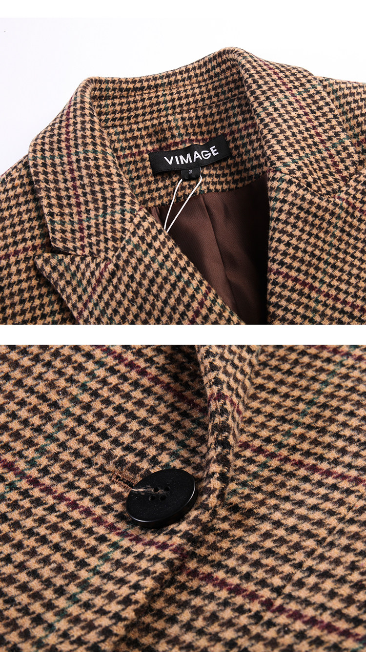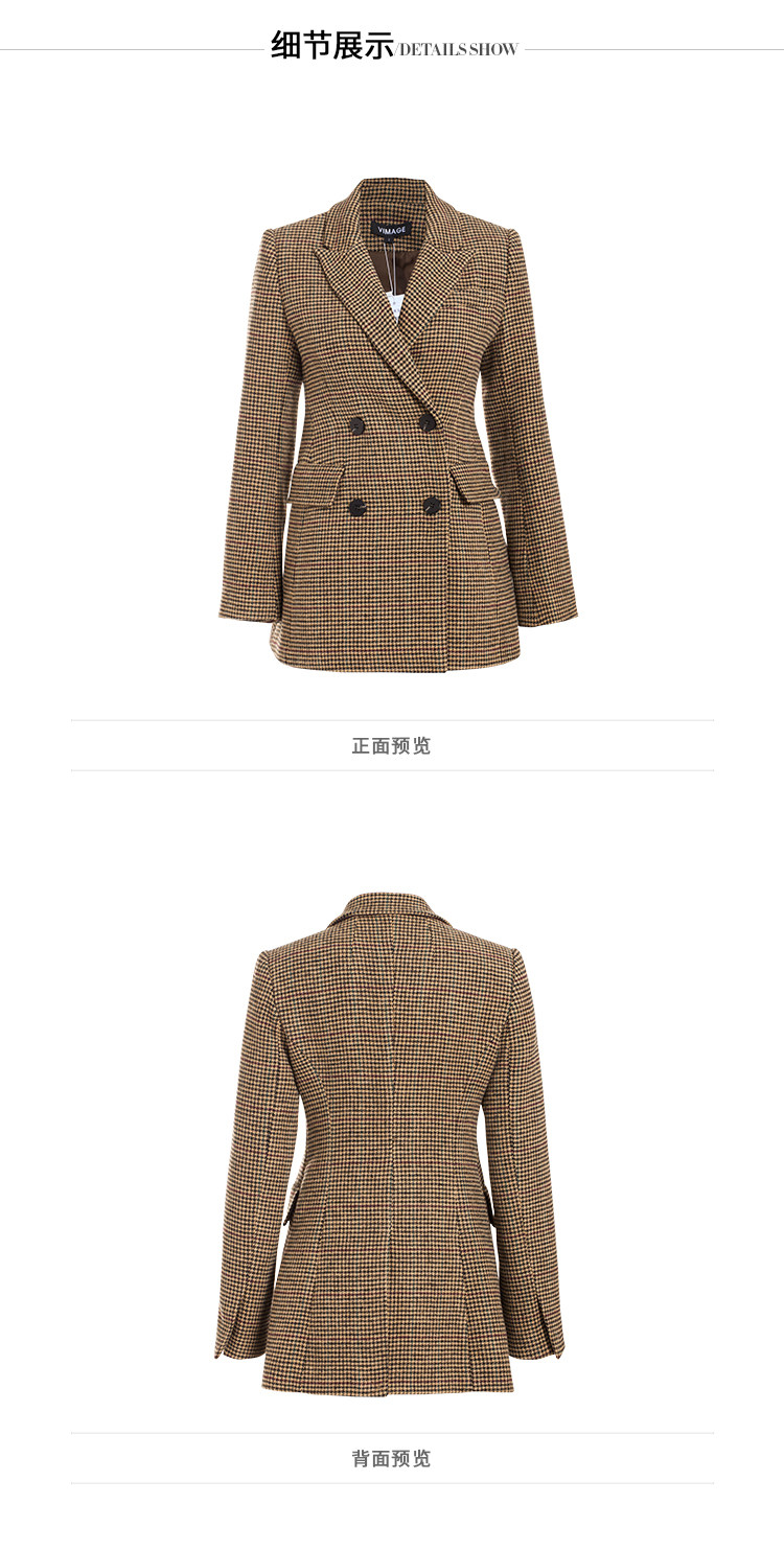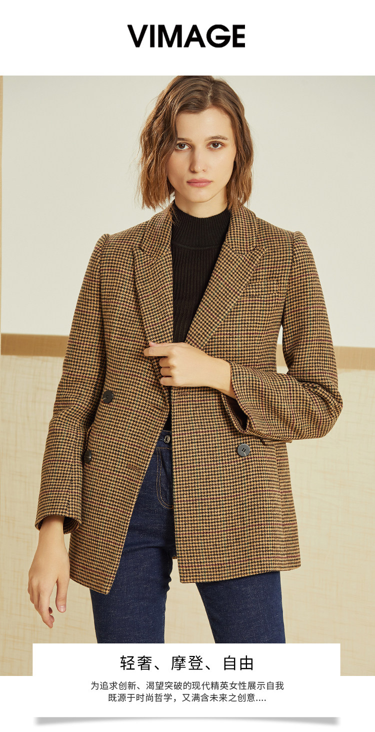 VIMAGE纬漫纪冬季复古格纹职业通勤双排扣西装短外套女V1214805