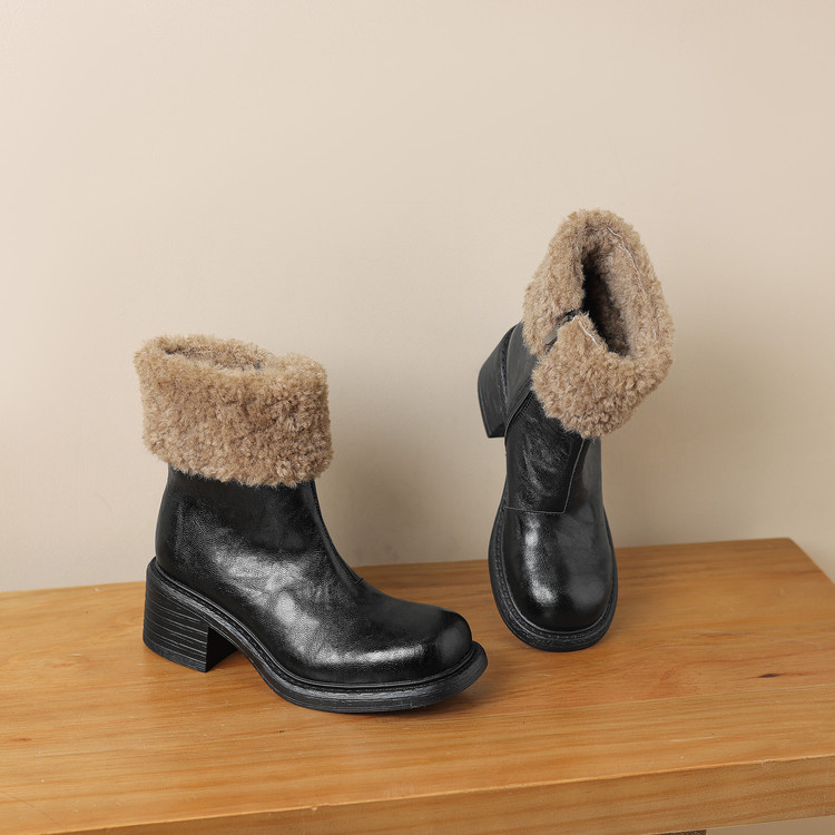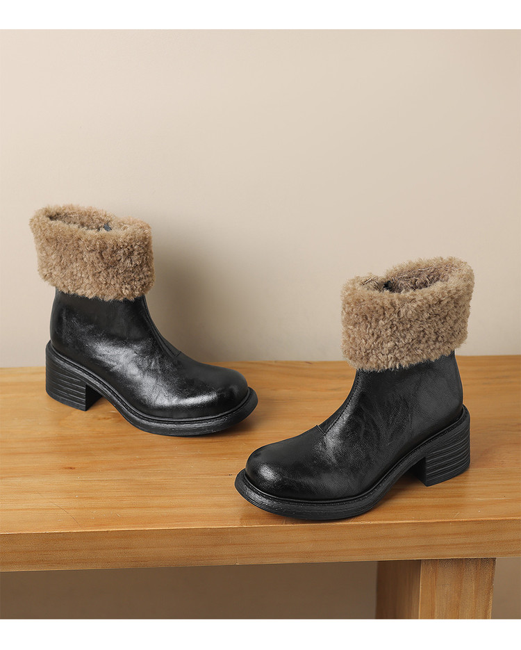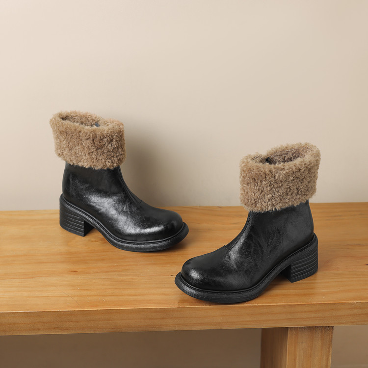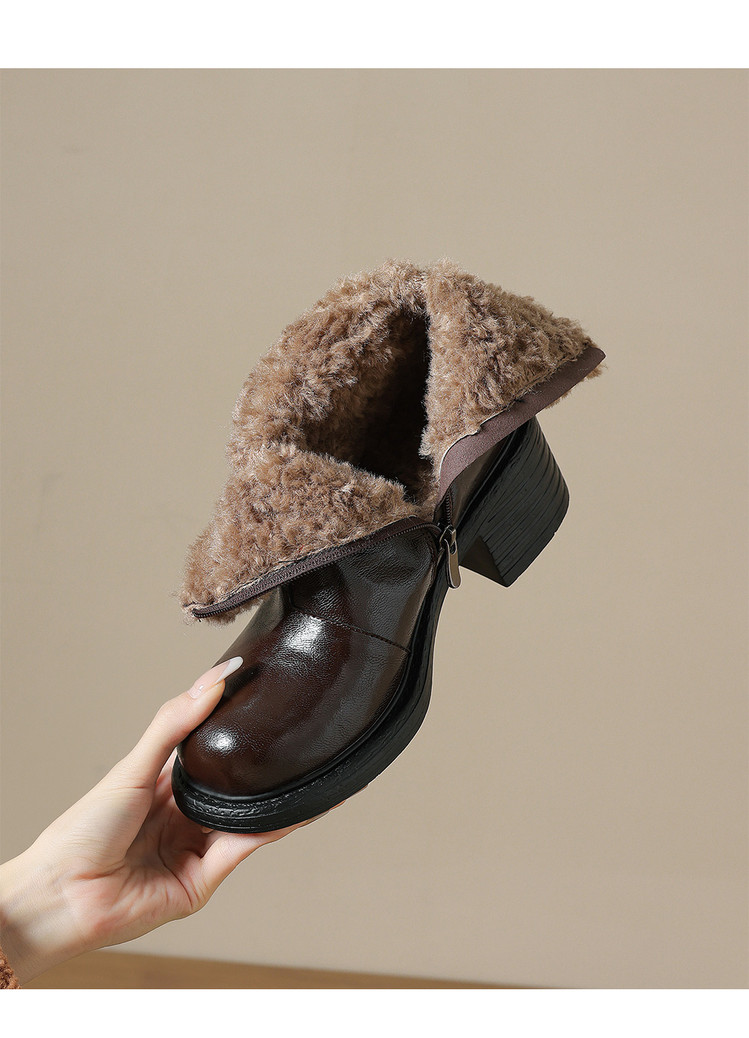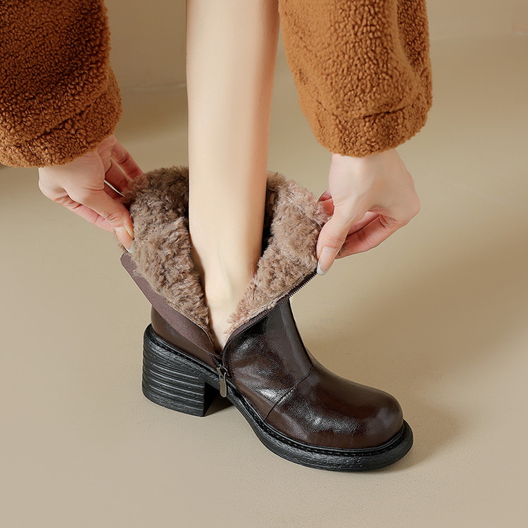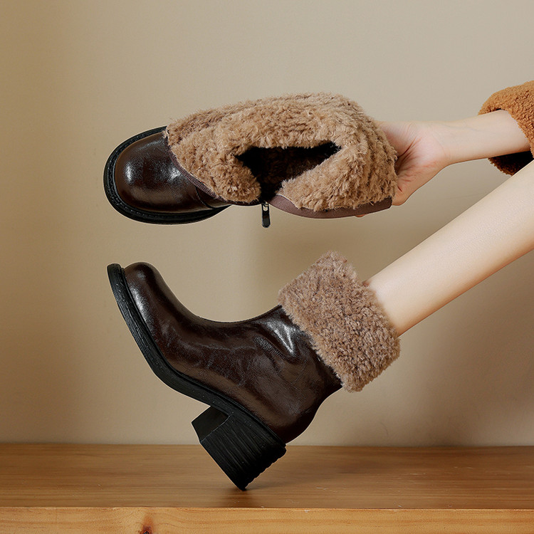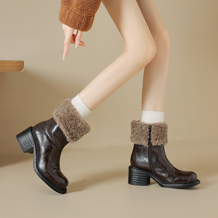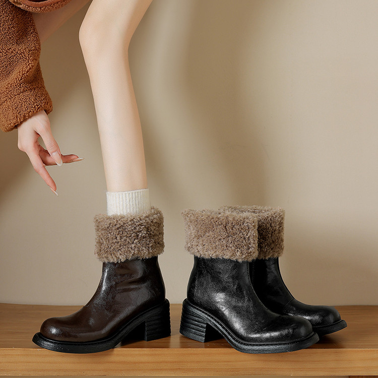 【预售5天】显瘦轻便毛靴冬季新款圆头舒适百搭粗高跟保暖短靴女雪地靴NX&cs88186