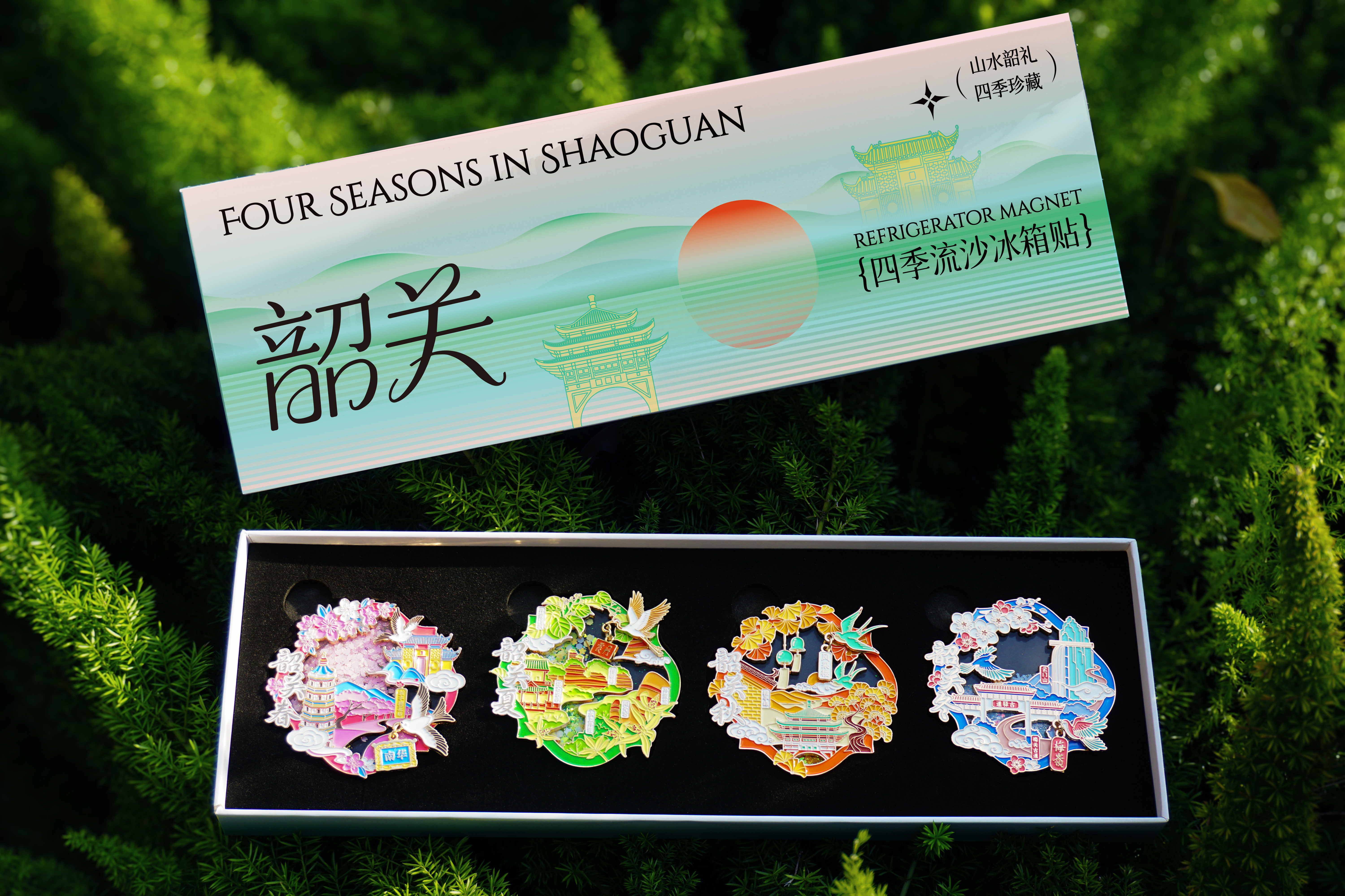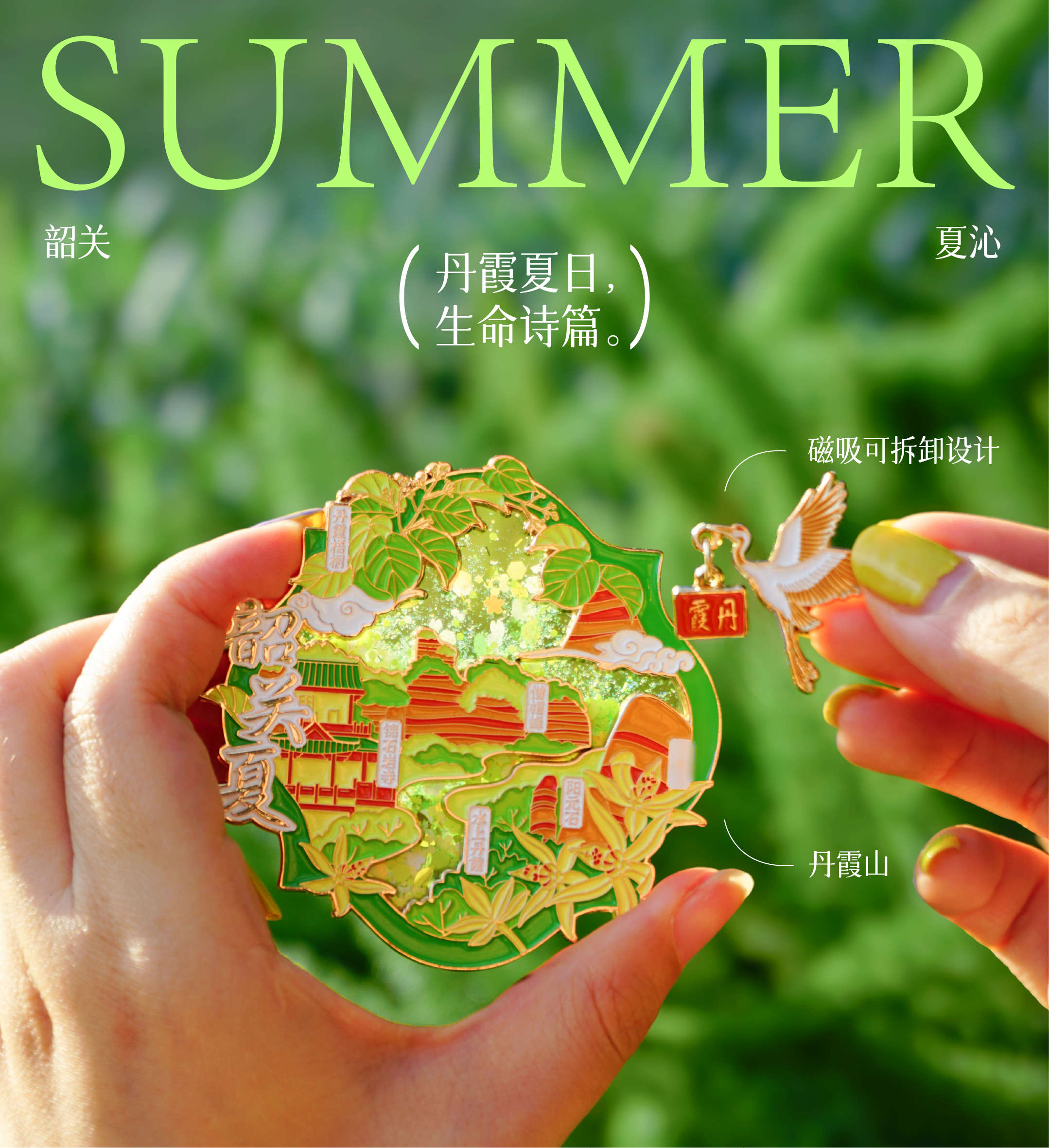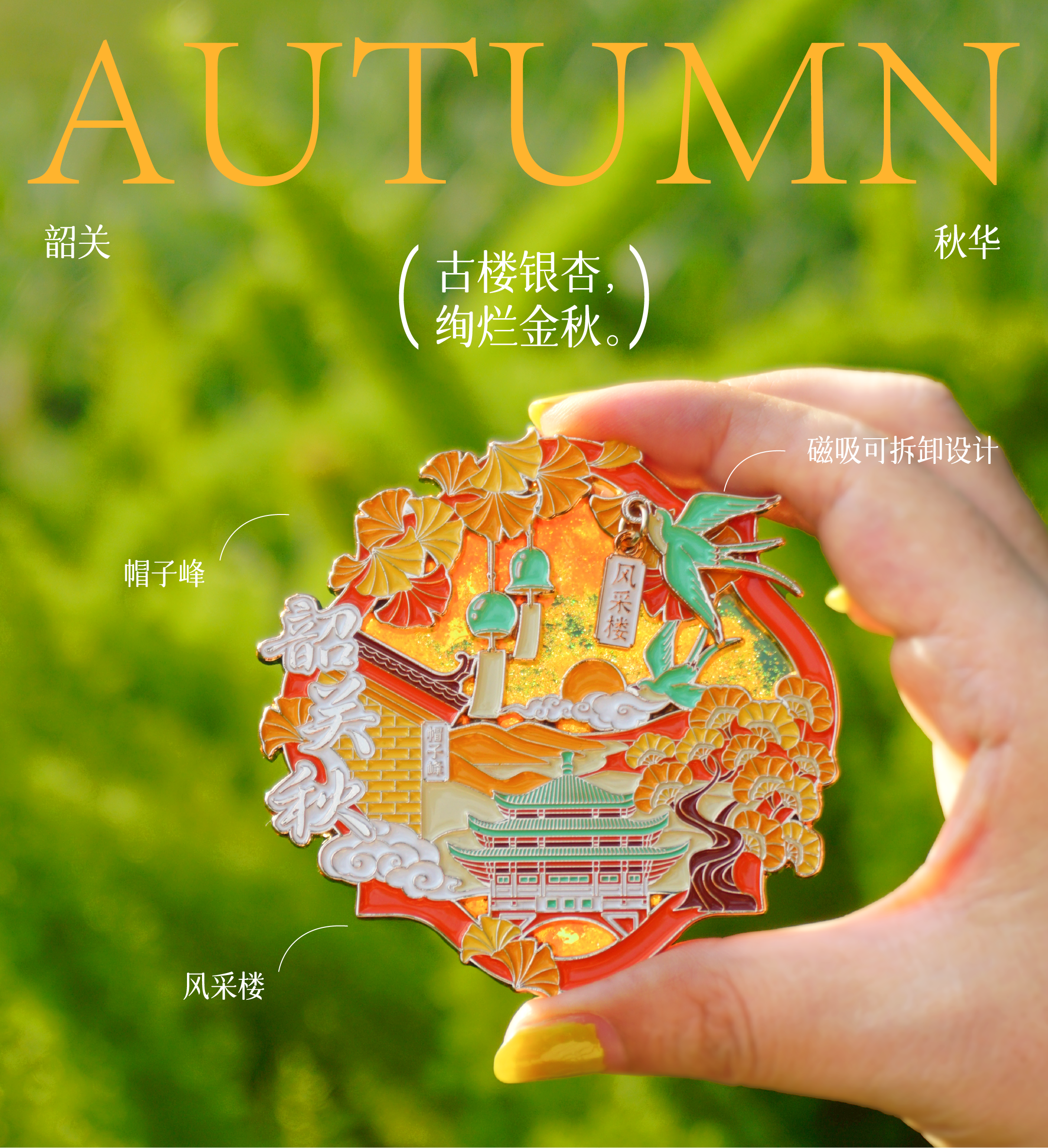"丹霞映古楼,流沙绘金秋"——以韶关地标帽子峰与风采楼为核心,通过动态流沙工艺演绎岭南秋日的绚烂,融合丹霞地质奇观与千年人文底蕴,打造一款兼具观赏性与文化收藏价值的季节限定文创。