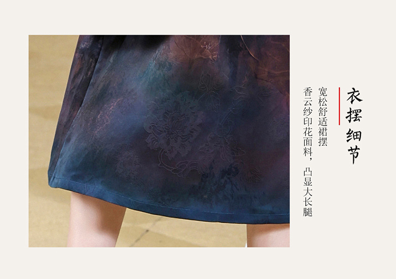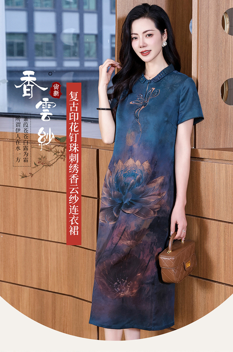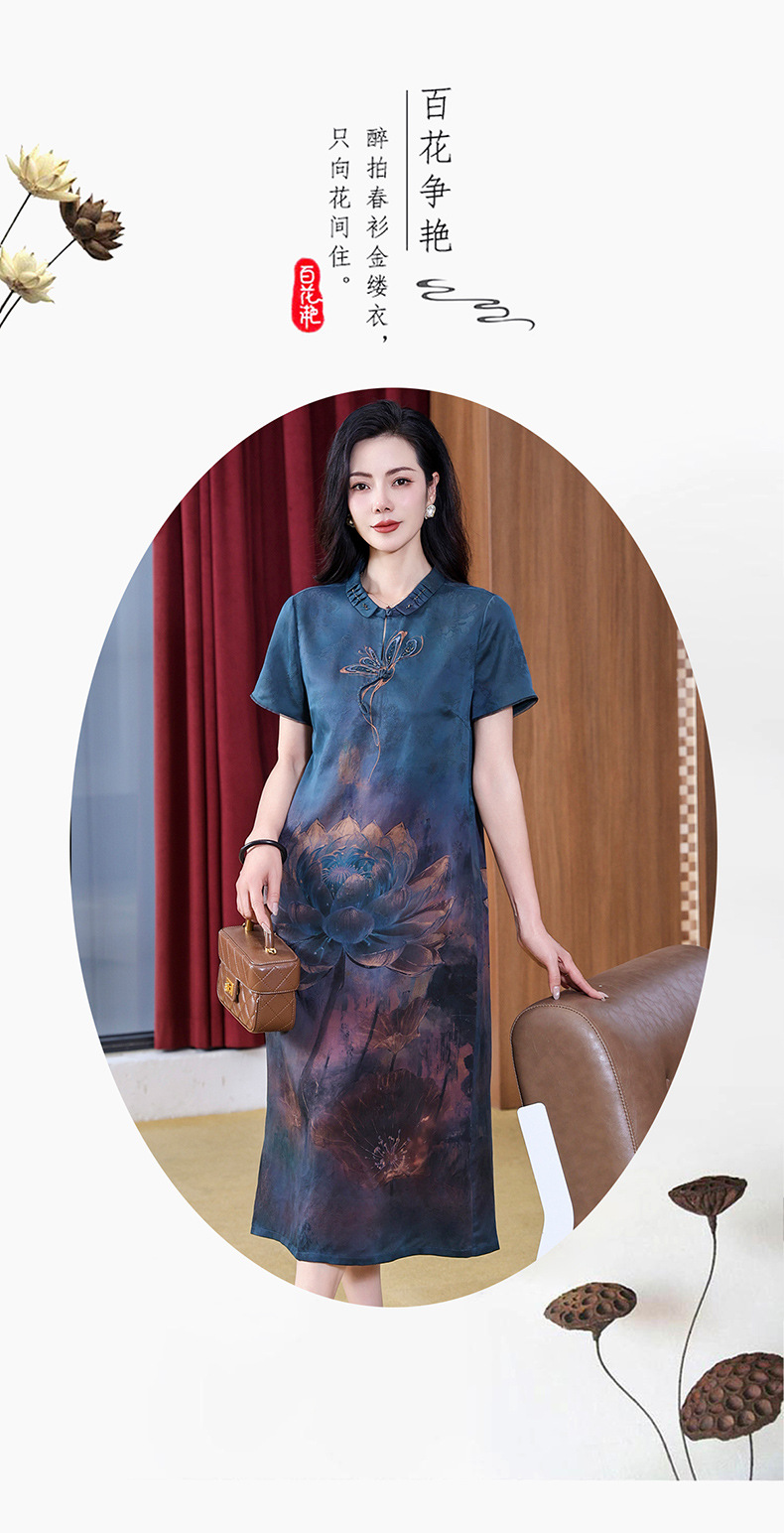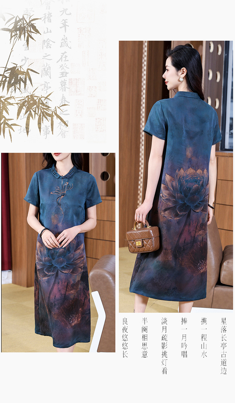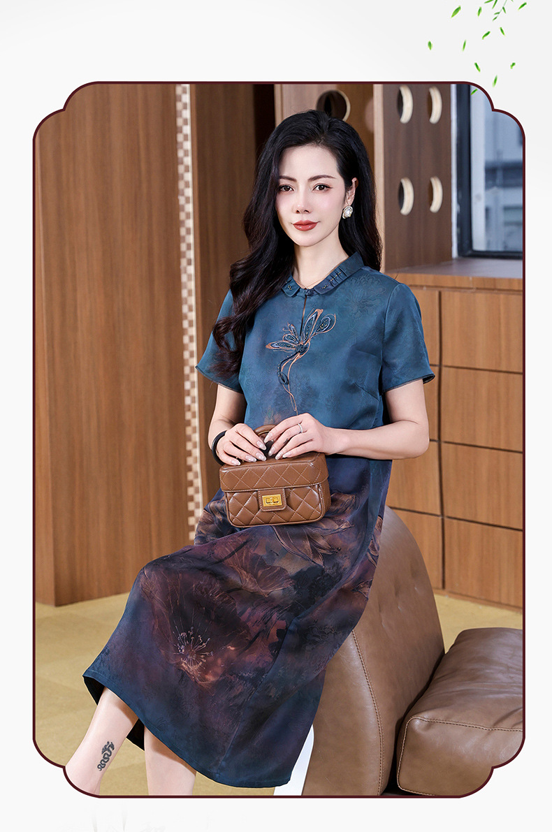 丁摩香云纱夏季短袖真丝旗袍连衣裙宽松大码过膝中长裙子AL221875