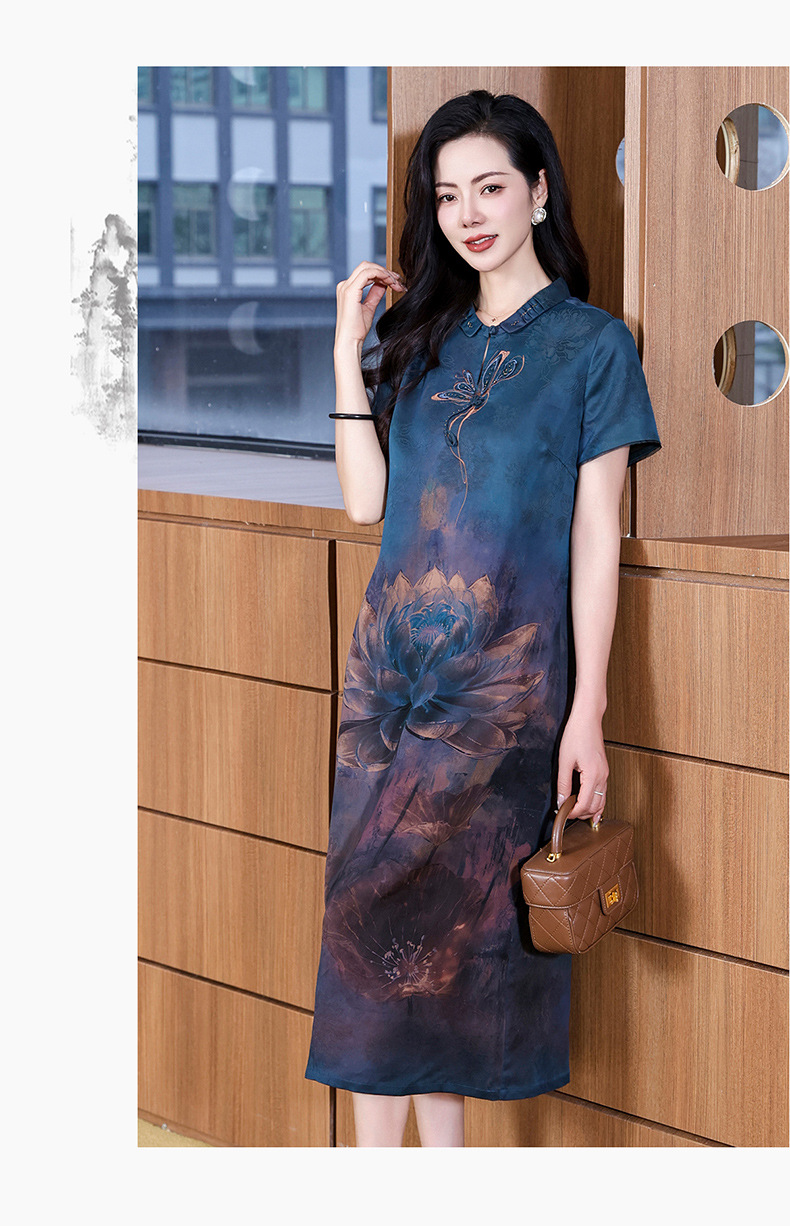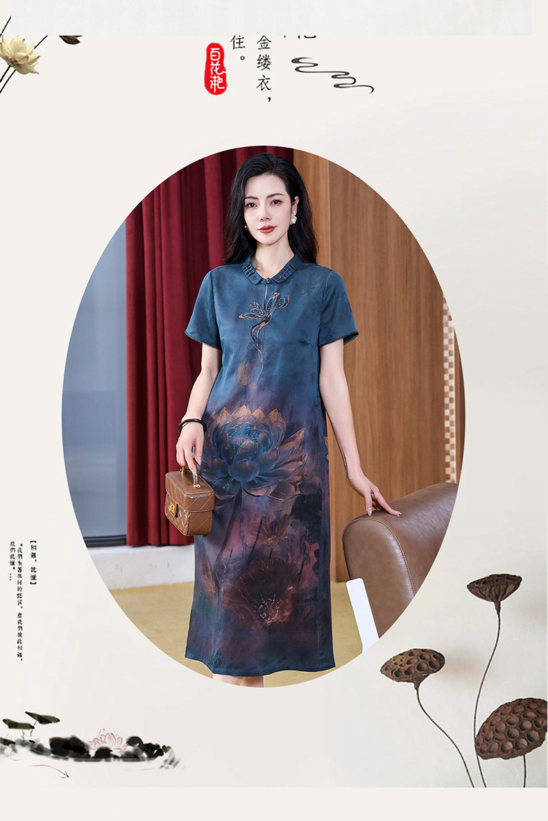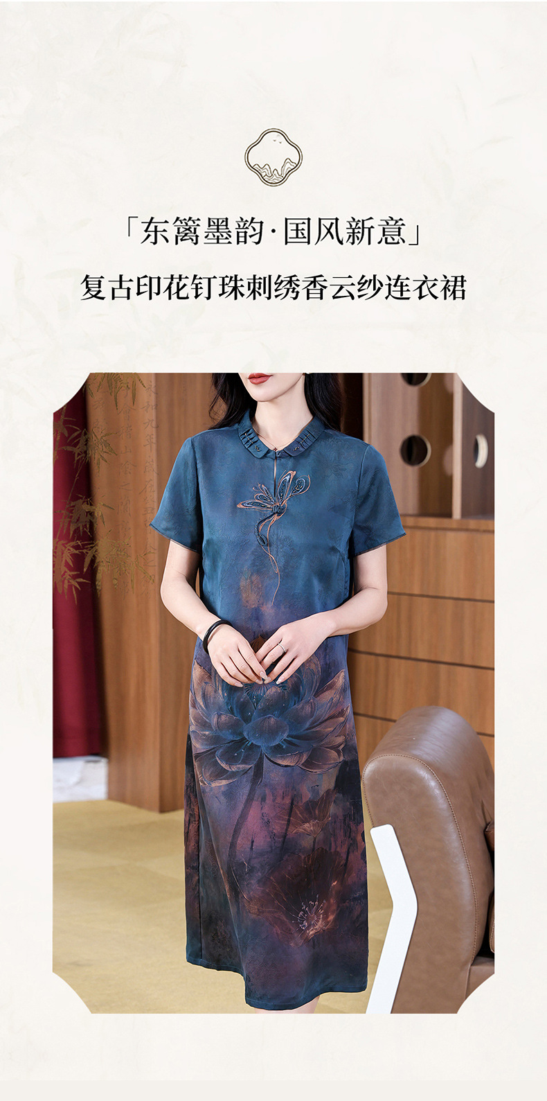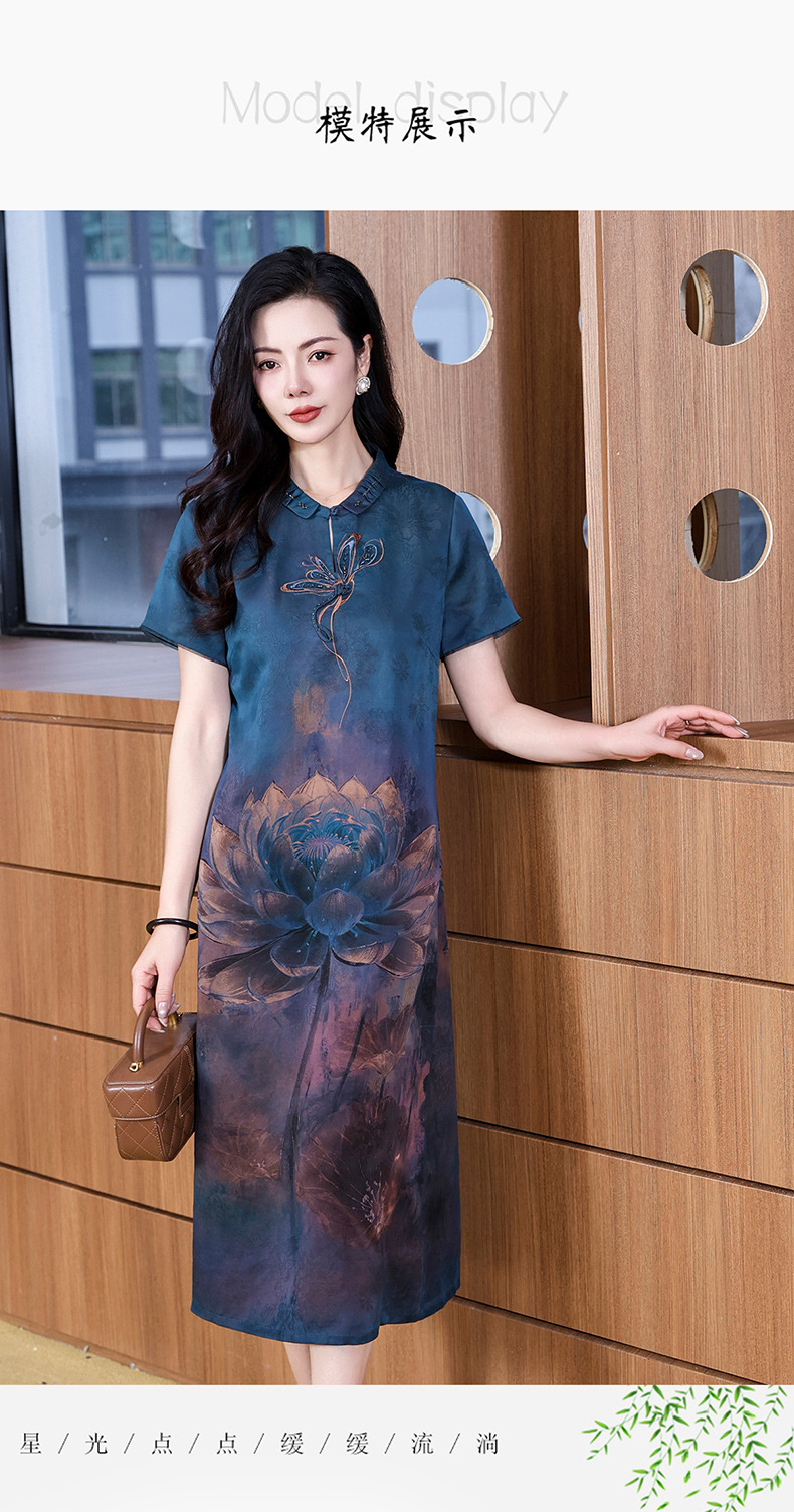 丁摩香云纱夏季短袖真丝旗袍连衣裙宽松大码过膝中长裙子AL221875