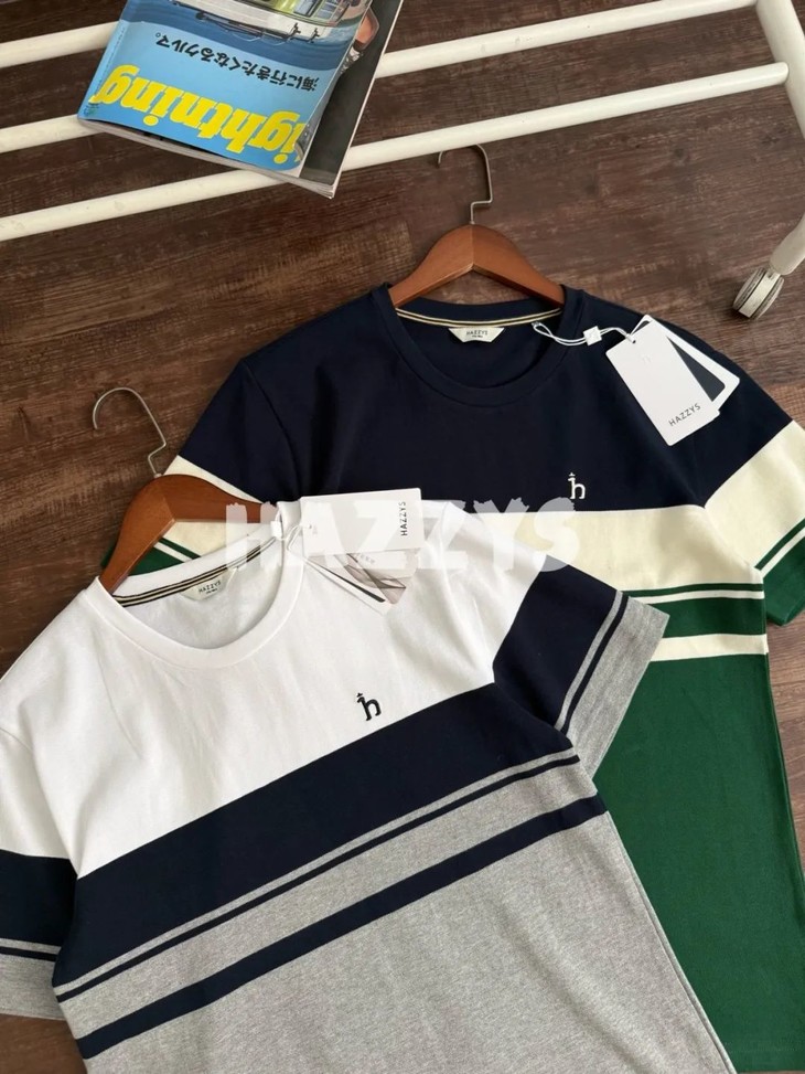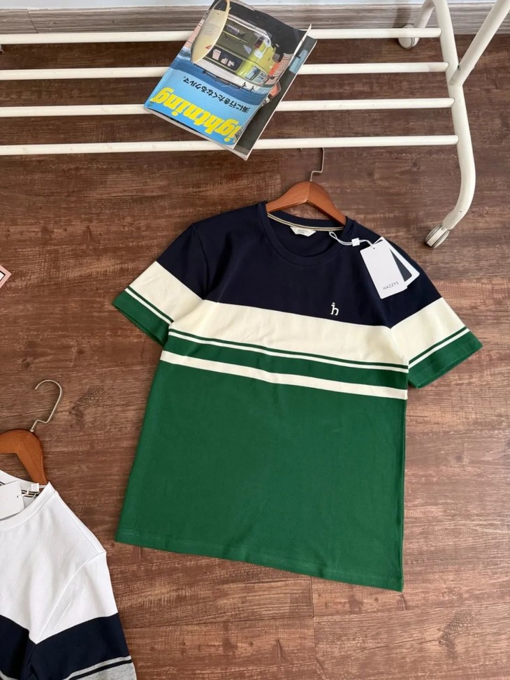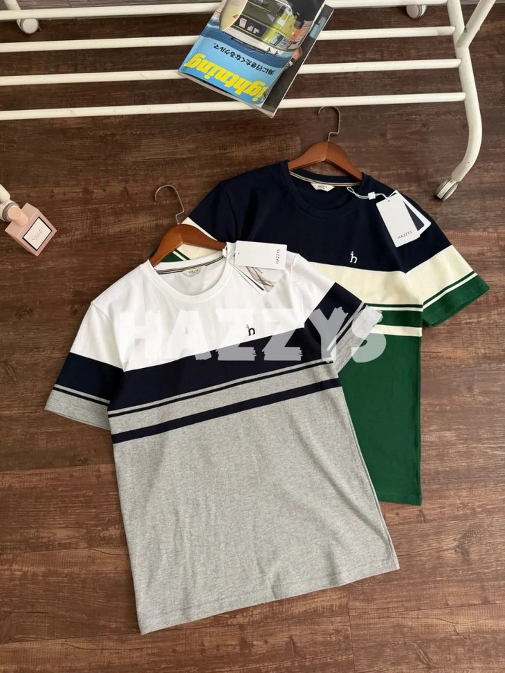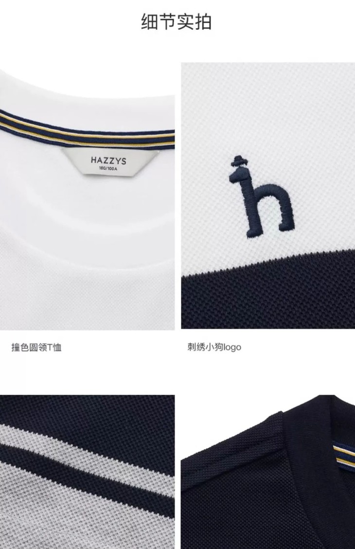 HZS 25春夏新品休闲男装条纹短袖T恤上衣潮 多远风貌 轻享自在!! 这款T恤从设计细节到实穿性都体现了品牌经典休闲风格。 设计亮点:刺绣小狗Logo:标志性品牌元素,低调提升辨识度。 撞色圆领+条纹设计:经典撞色搭配条纹图案,兼顾清爽与层次感,适合春夏活力穿搭。 肌理感面料:相比普通棉质,面料带有立体纹理,增添质感且透气性佳。 剪裁考究:HZS的版型通常偏修身但不紧身,适合亚洲男性身材,通勤休闲两相宜。