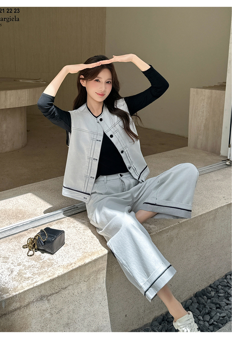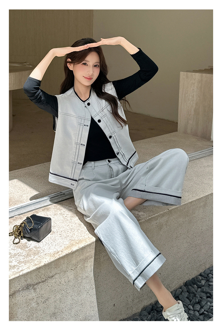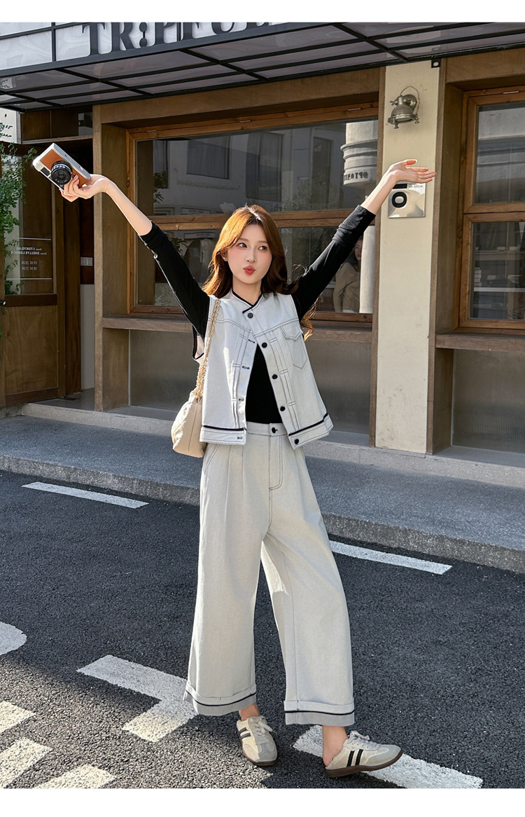HR YDYX9371复古风酷飒时尚套装裤牛仔马甲t恤阔腿裤三两件套 商品图0