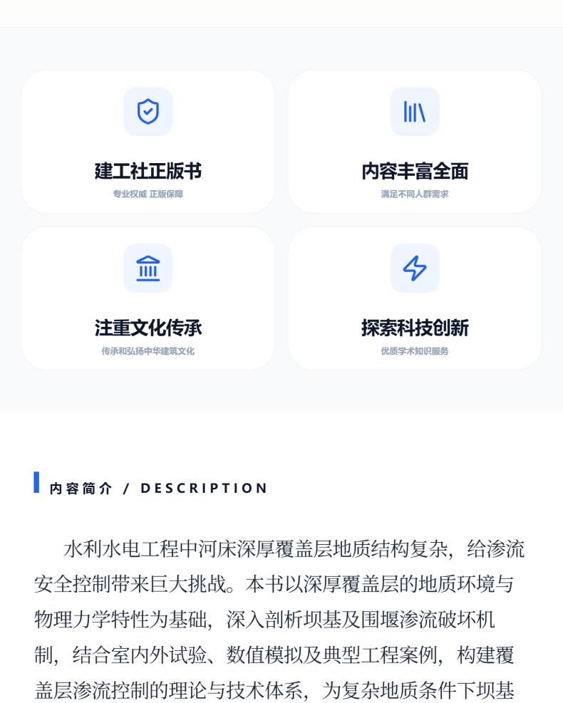 本书聚焦水利水电工程中深厚覆盖层地基渗流特性与控制这一关键难题,系统整合理论研究、试验分析与工程实践,为复杂地质条件下坝基及围堰的渗流安全提供科学解决方案。全书以深厚覆盖层的地质环境与物理力学特性为基础,深入剖析覆盖层渗流破坏机制,结合室内外试验、数值模拟及典型工程案例,构建覆盖层渗流控制的理论与技术体系,将基础理论创新与工程应用需求紧密结合,深入剖析覆盖层临界坡降判定、渗流场演化规律等关键科学问题,为高水头、复杂地质条件下坝基及围堰的渗流安全评估、施工优化提供了可复制的技术路径,是水利水电工程领域科研人员、设计人员及工程管理者的重要参考。