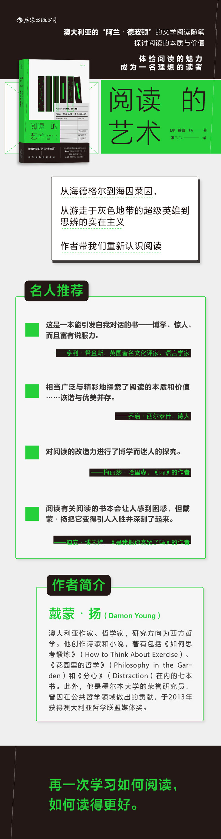 ◆作者被誉为澳大利亚的“阿兰•德波顿”,此书为他的文学阅读随笔,探讨了阅读的本质与价值,既是为了礼赞阅读和读者,也是为了给阅读这项被大为低估的能力正名。