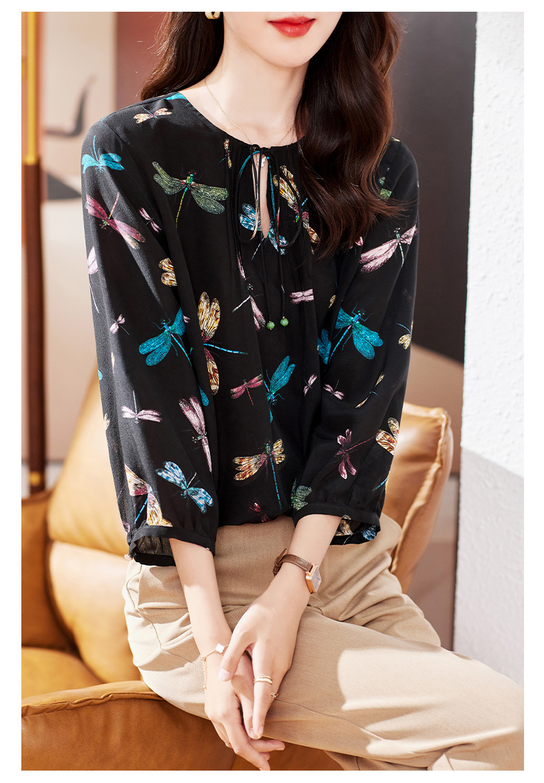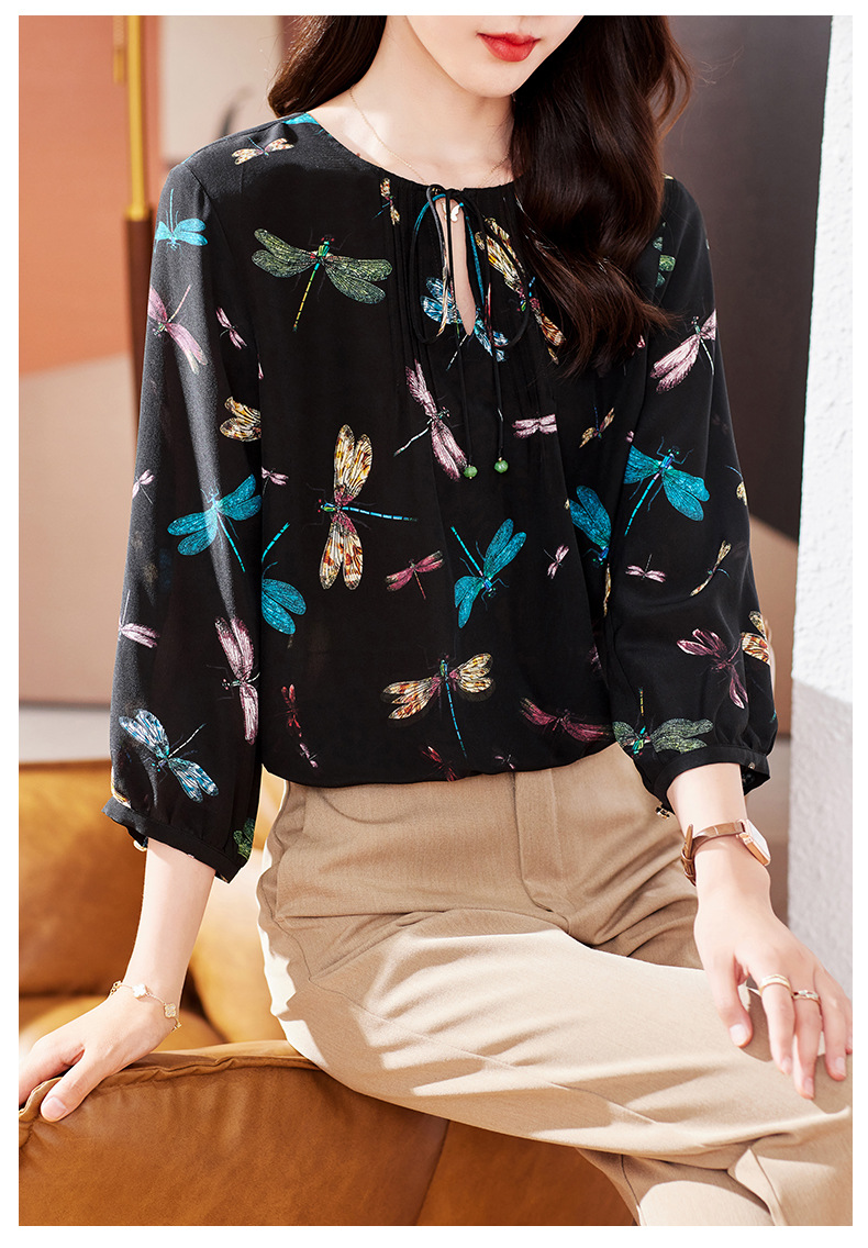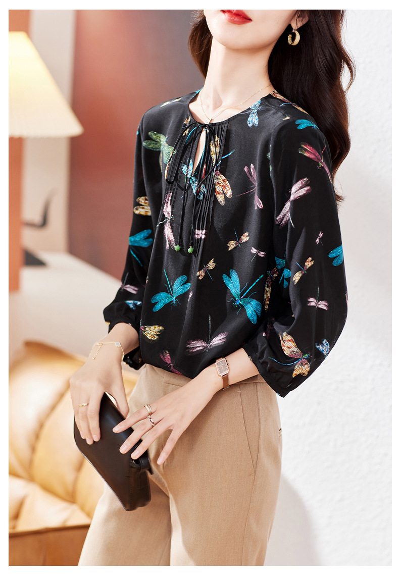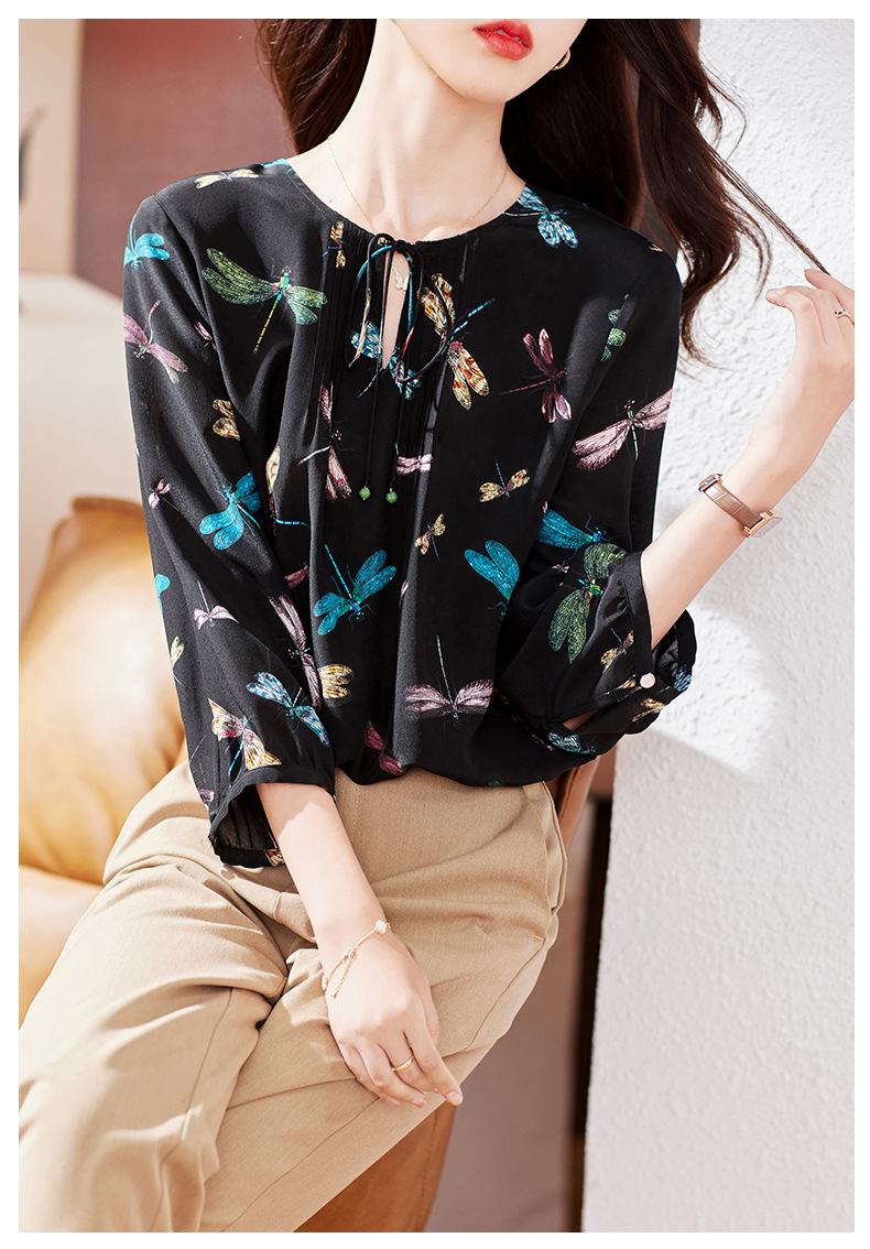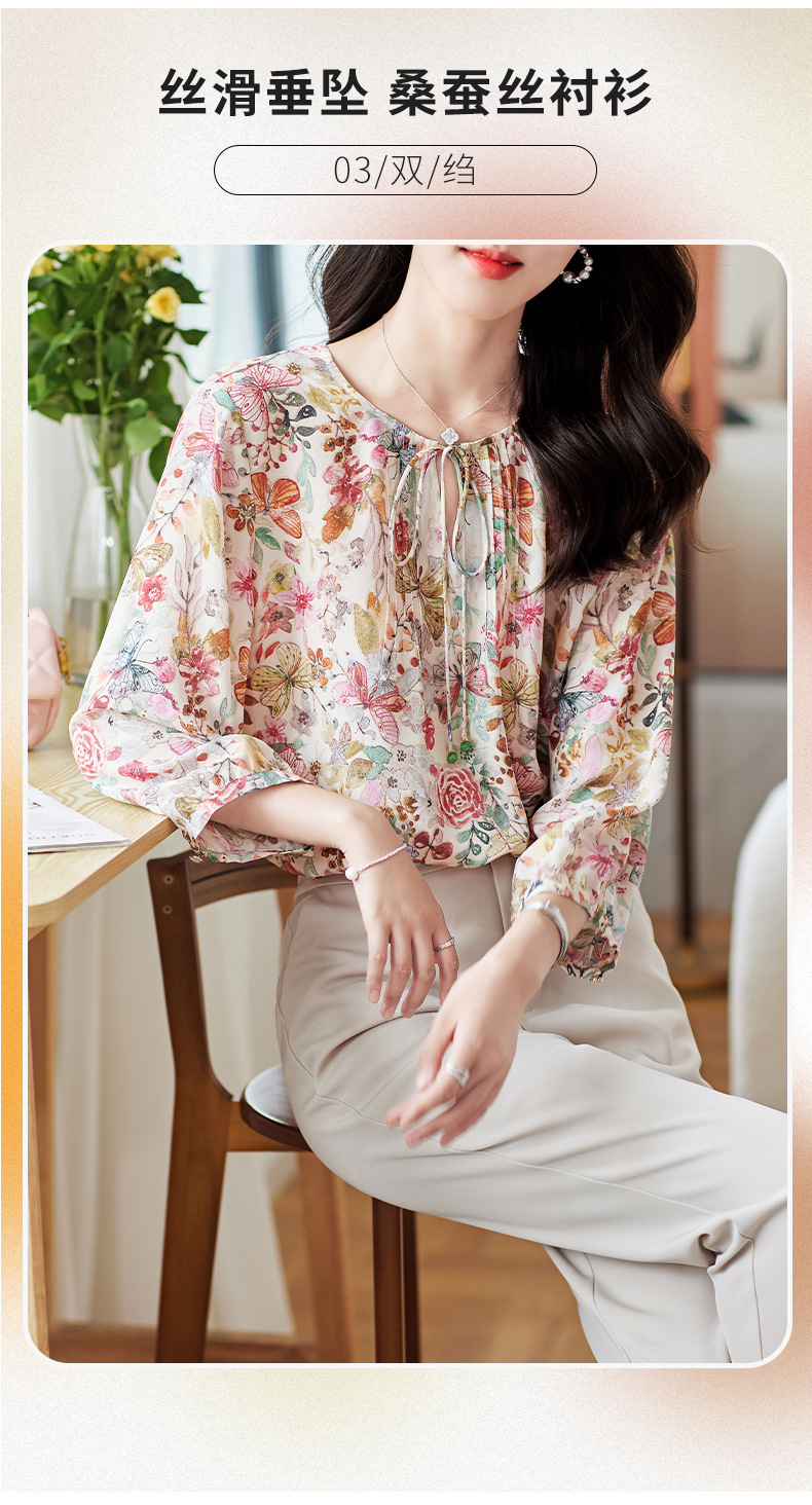 KQ-19175系带双绉真丝上衣女士秋新款宽松大码小衫设计感七分袖桑蚕丝衬衫