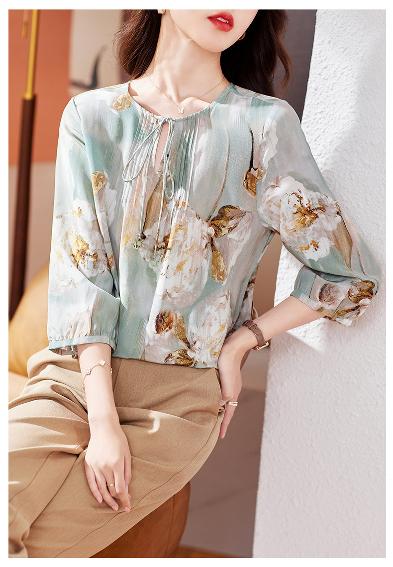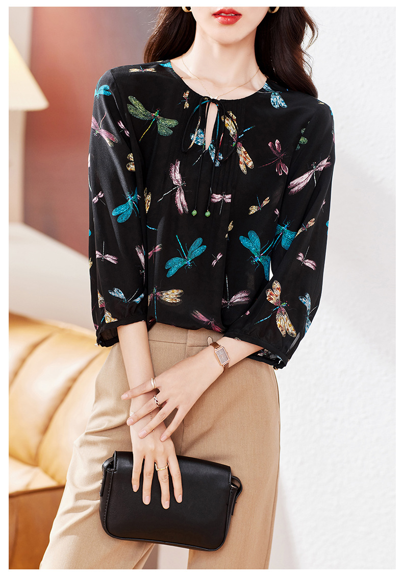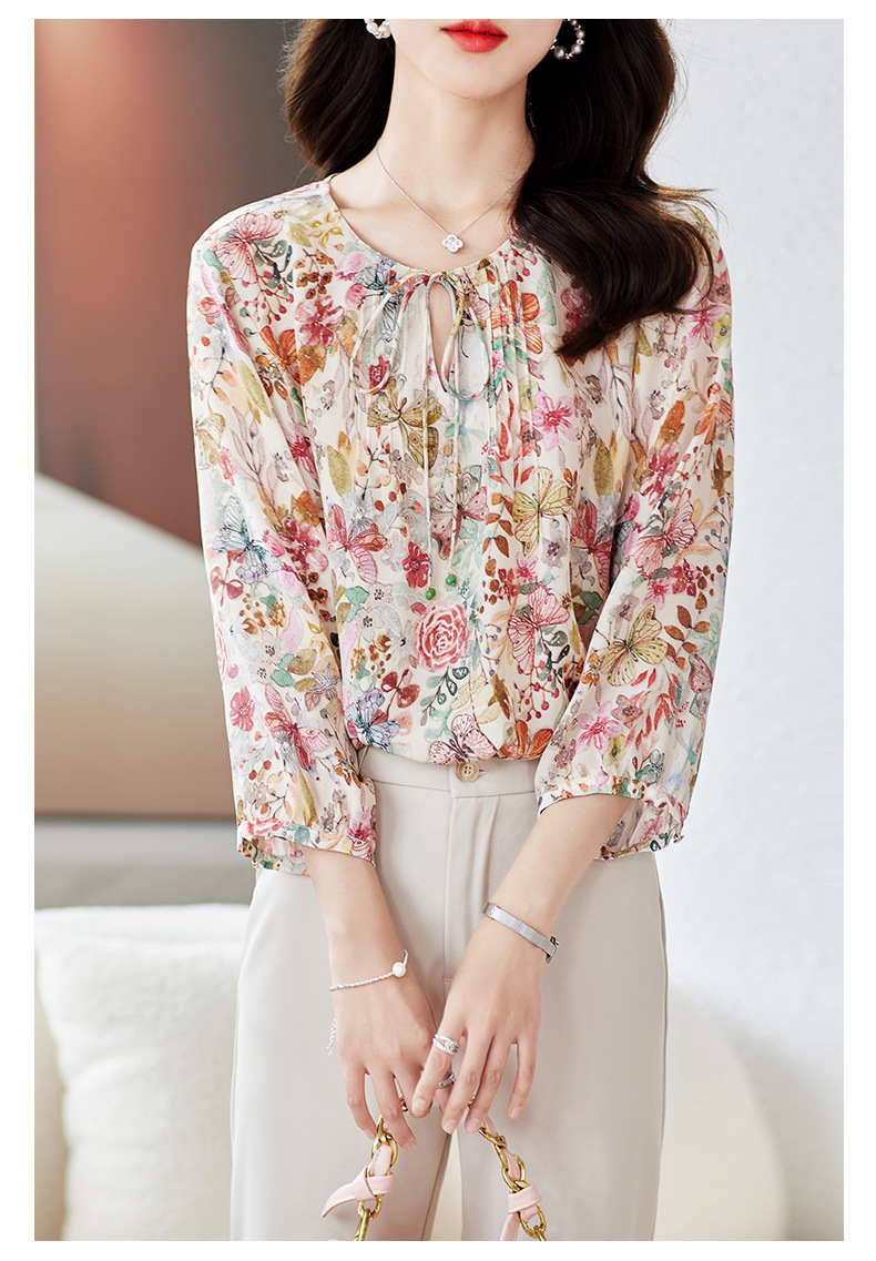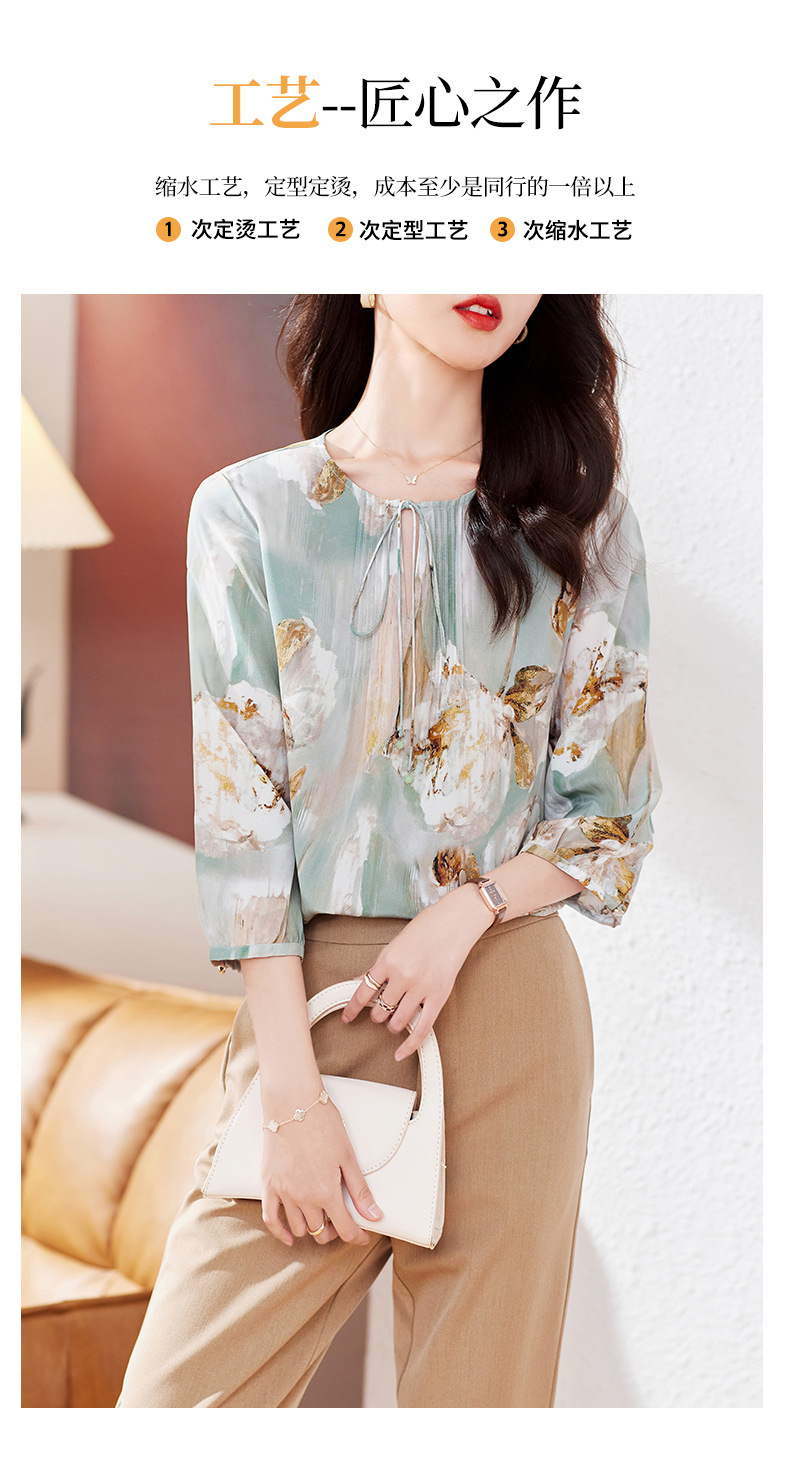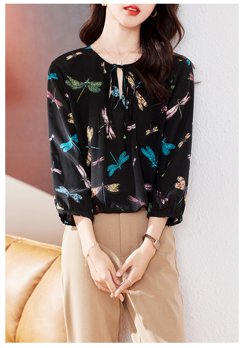 KQ-19175系带双绉真丝上衣女士秋新款宽松大码小衫设计感七分袖桑蚕丝衬衫