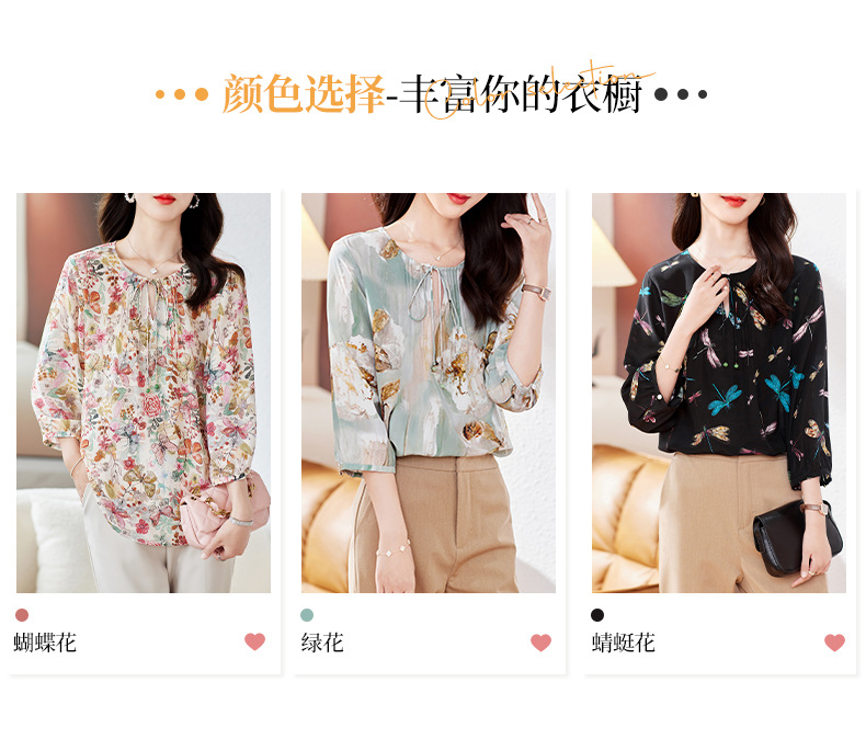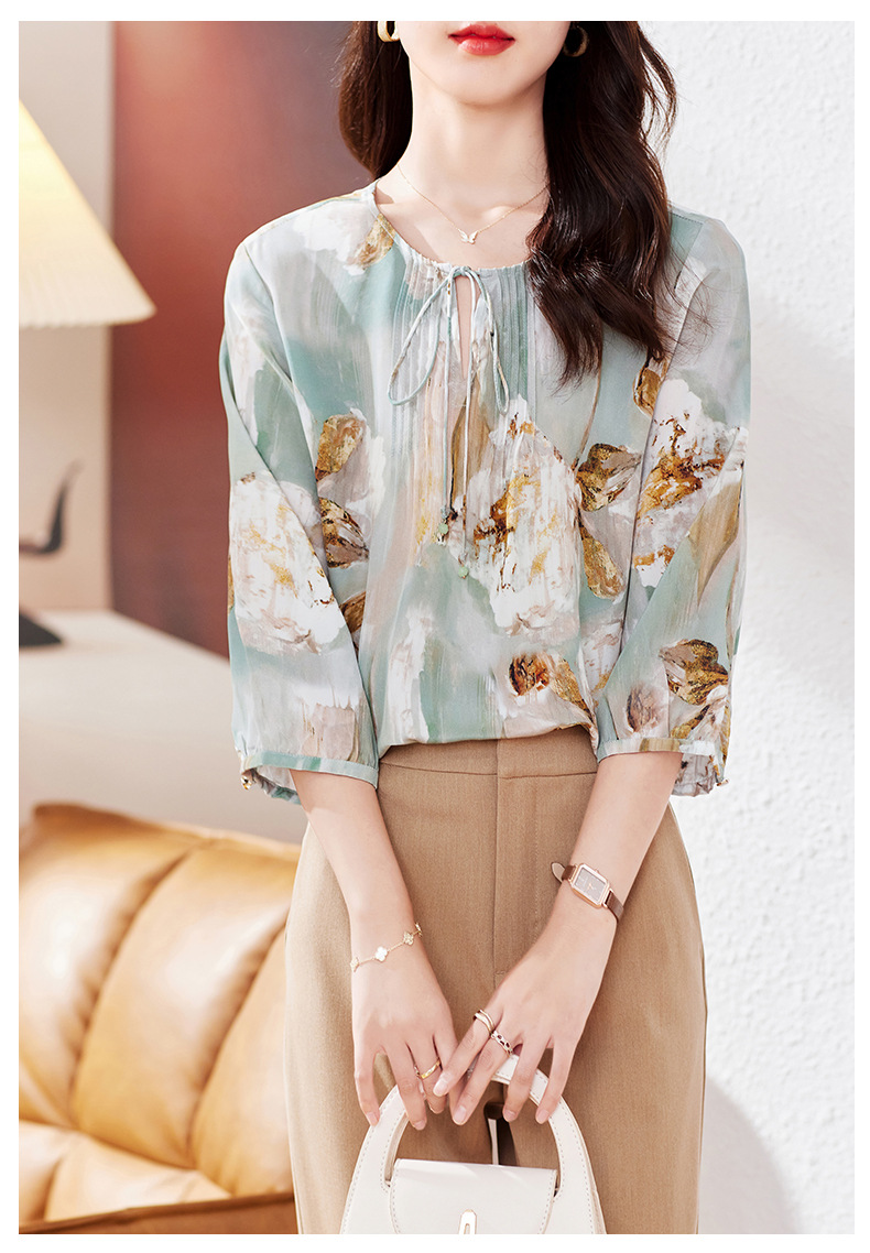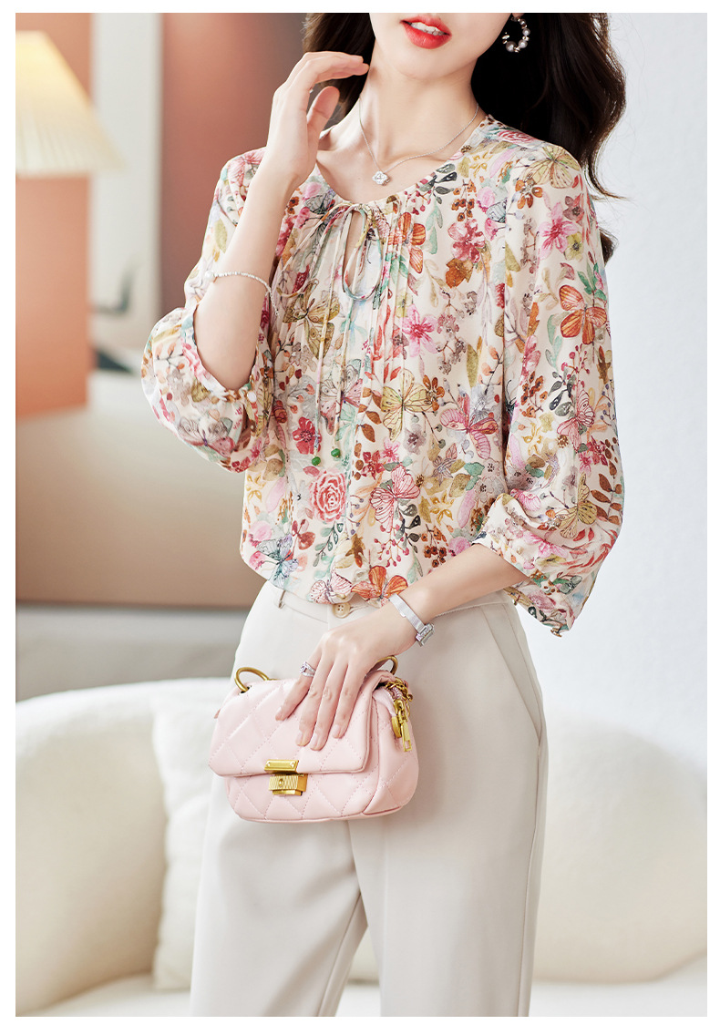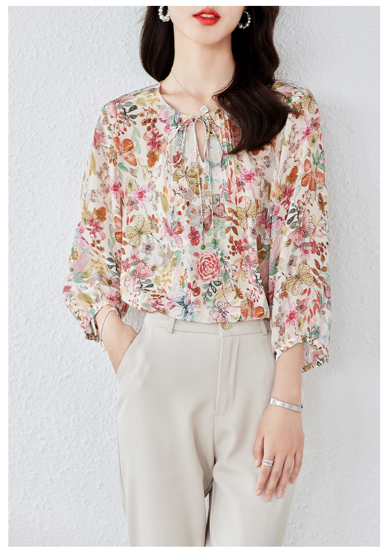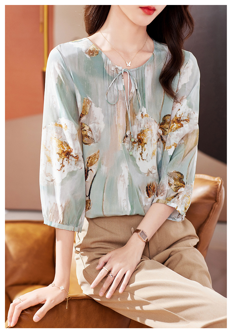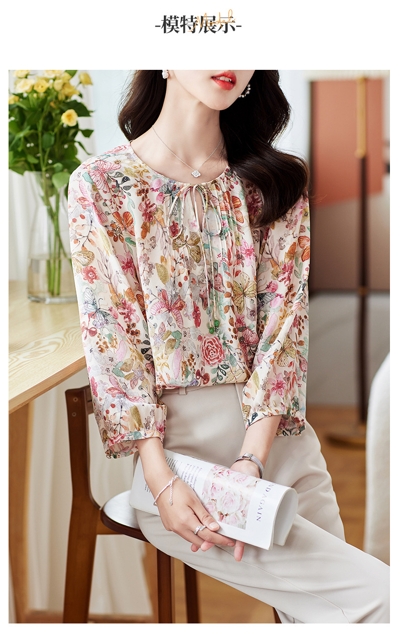 KQ-19175系带双绉真丝上衣女士秋新款宽松大码小衫设计感七分袖桑蚕丝衬衫