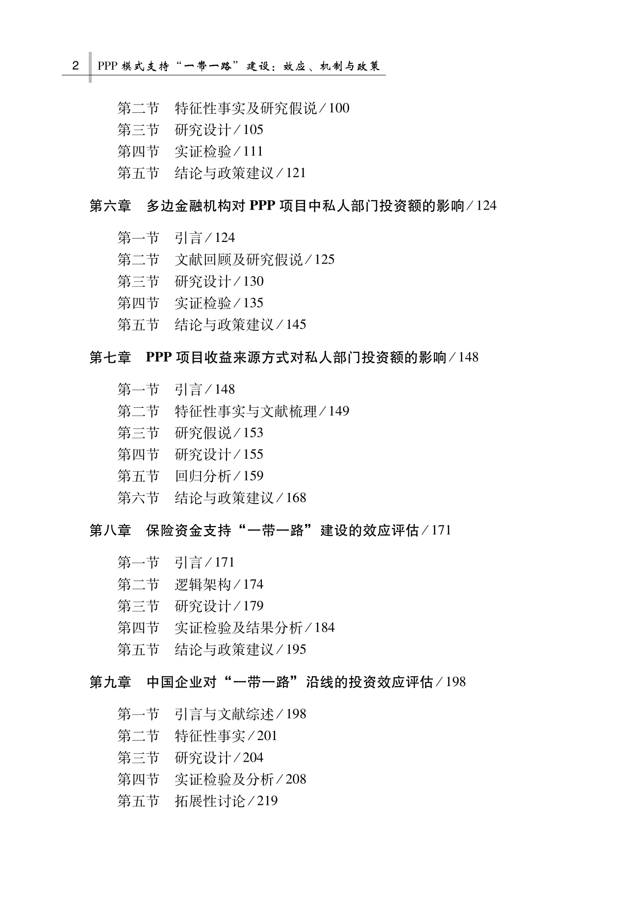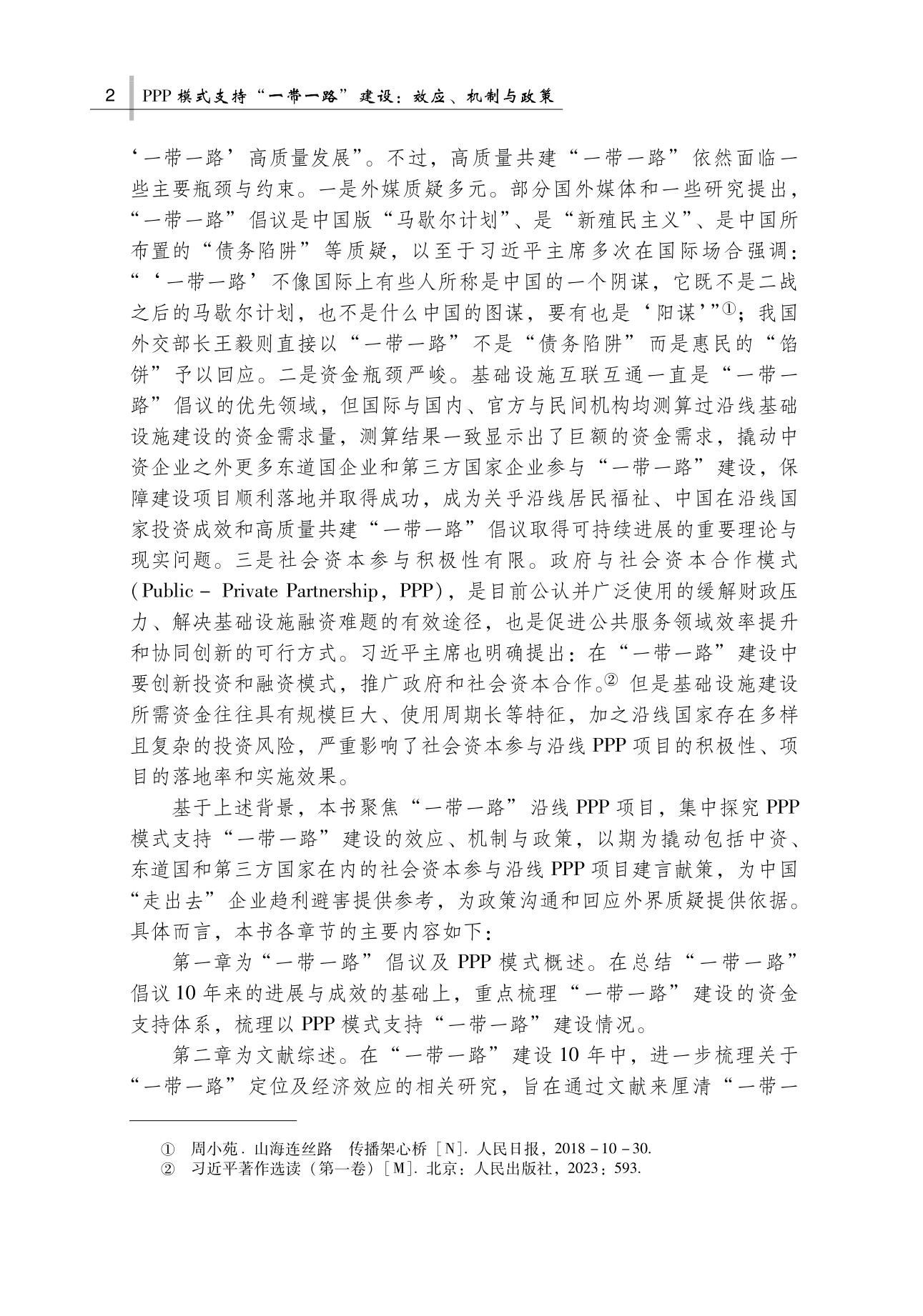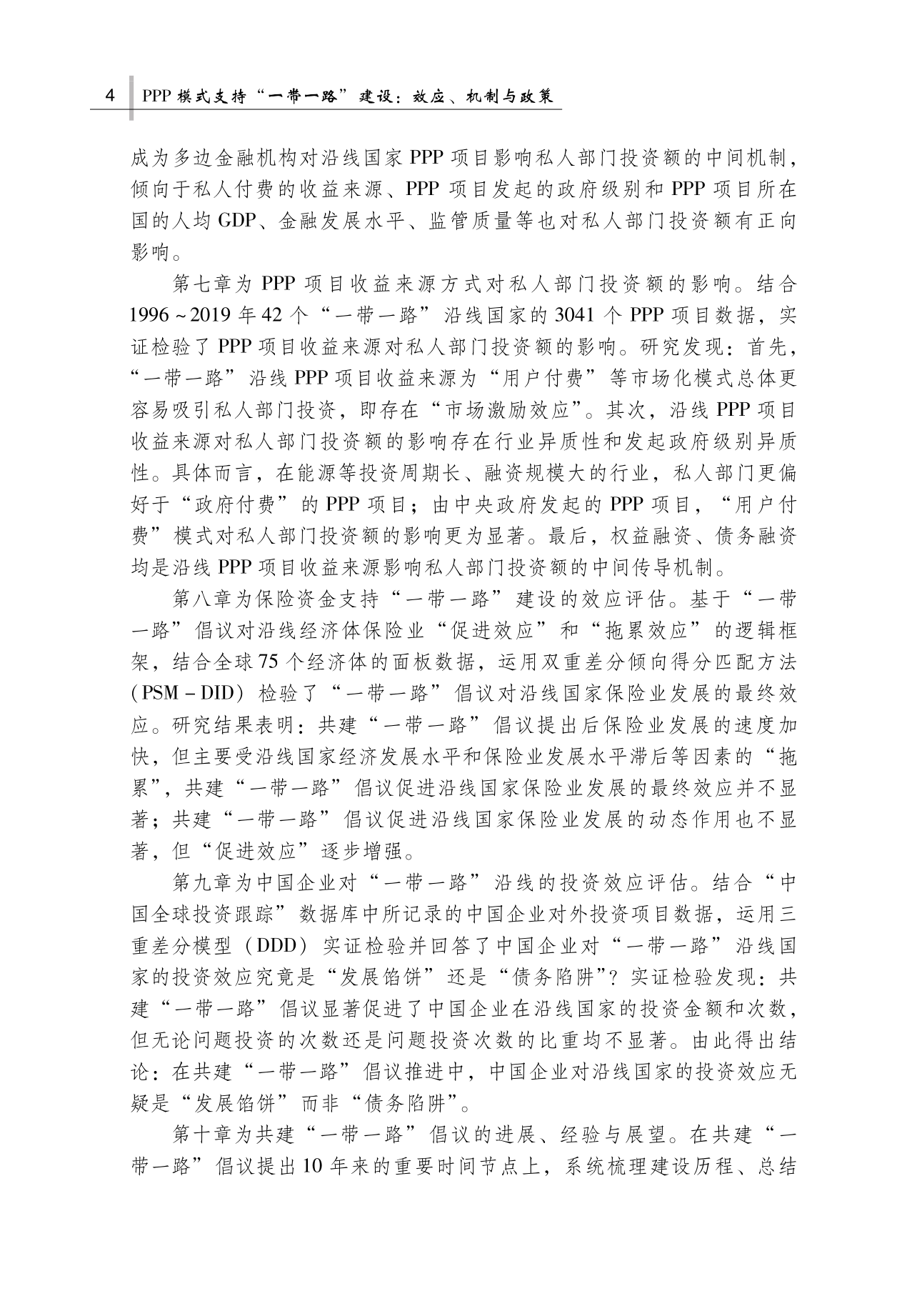 基于上述背景,本书聚焦“一带一路”沿线PPP项目,集中探究PPP模式支持“一带一路”建设的效应、机制与政策,以期为撬动包括中资、东道国和第三方国家在内的社会资本参与沿线PPP项目建言献策,为中国“走出去”企业趋利避害提供参考,为政策沟通和回应外界质疑提供依据。