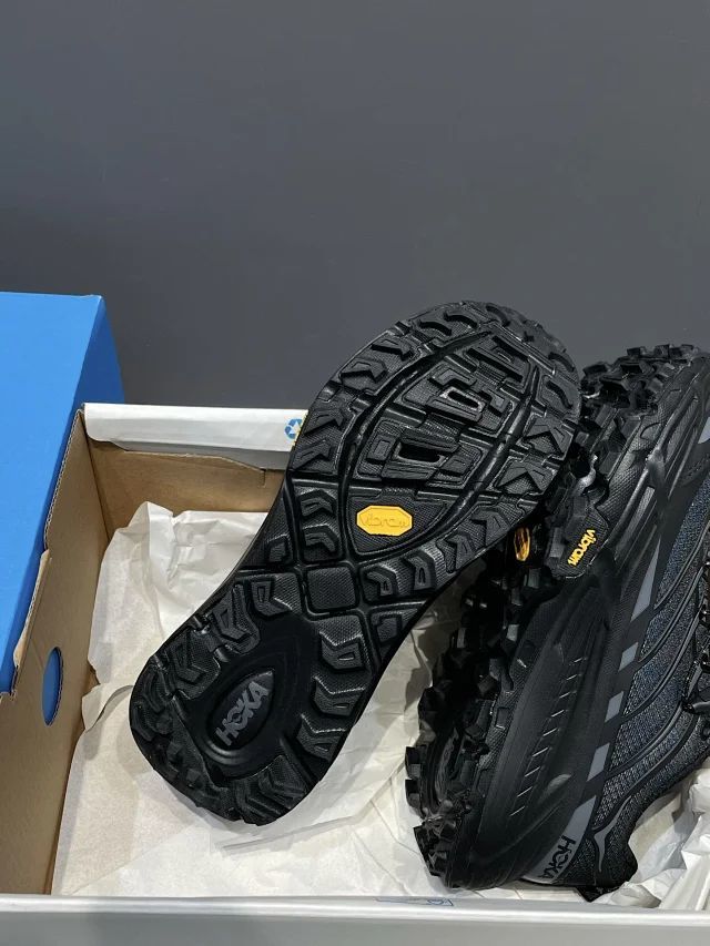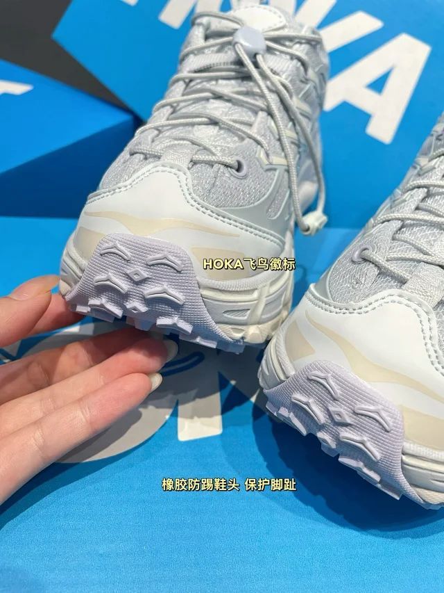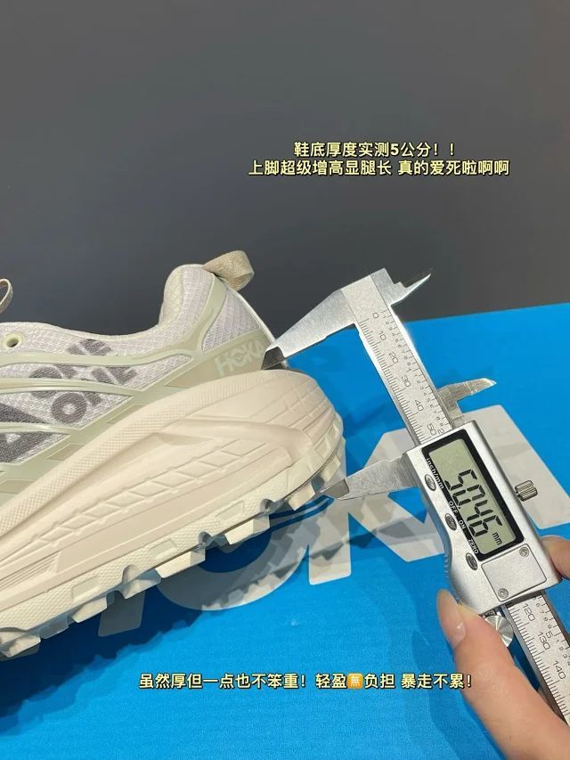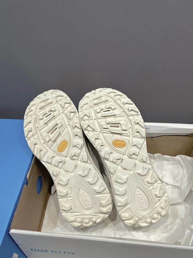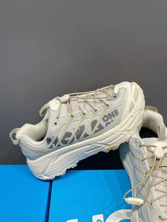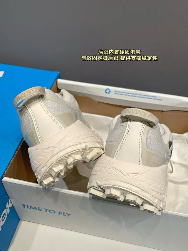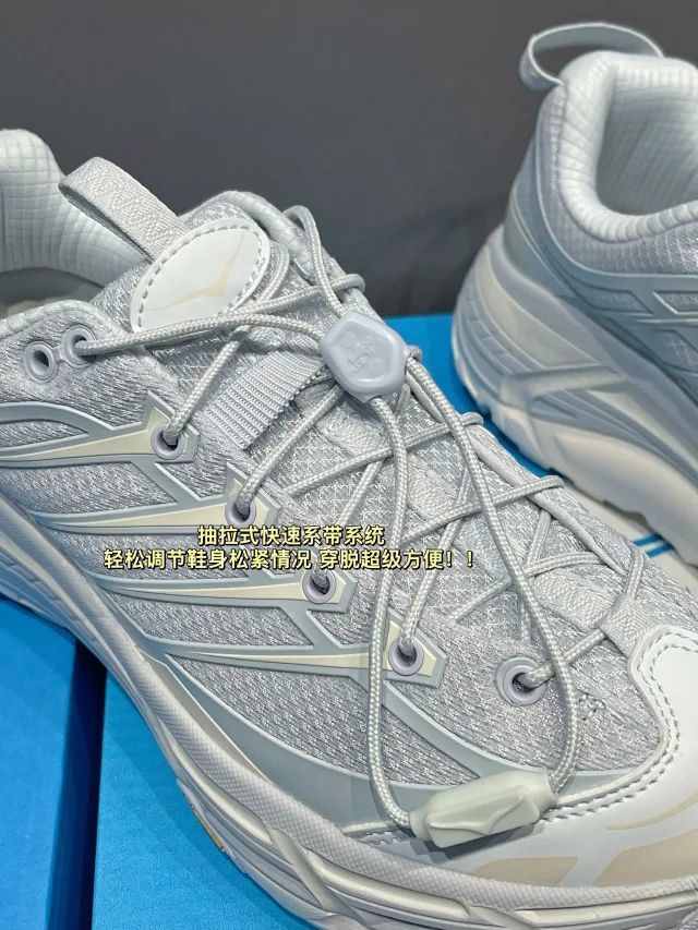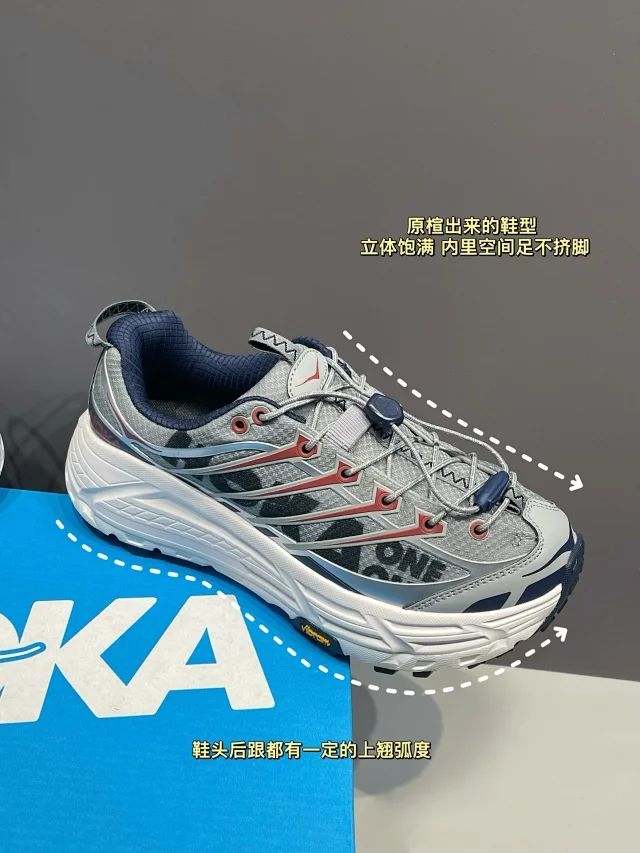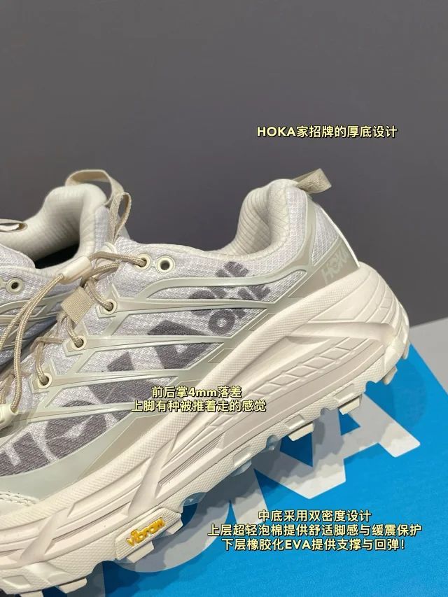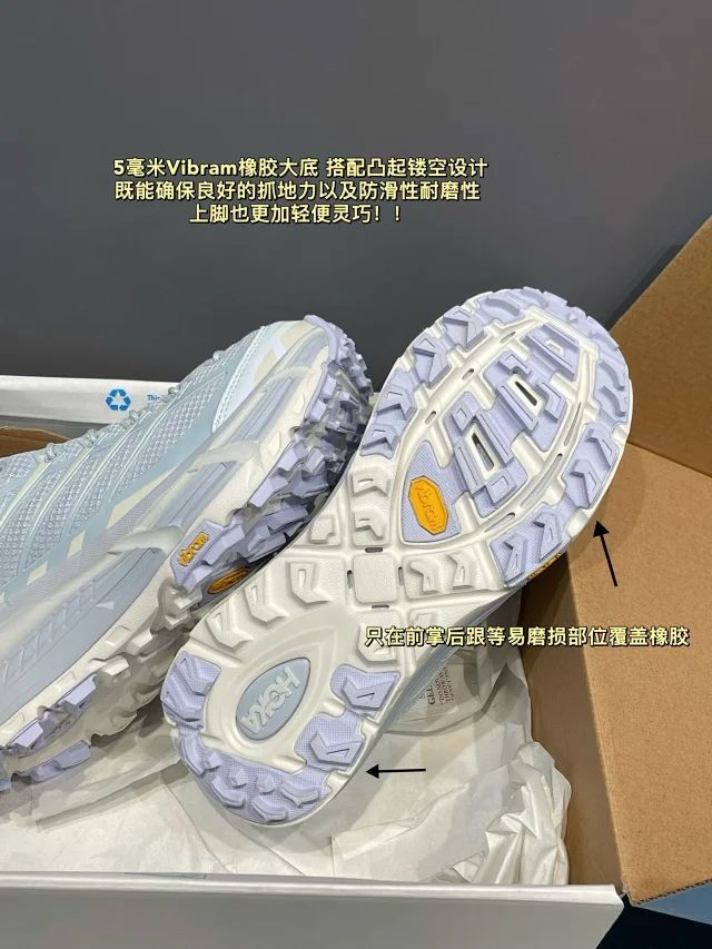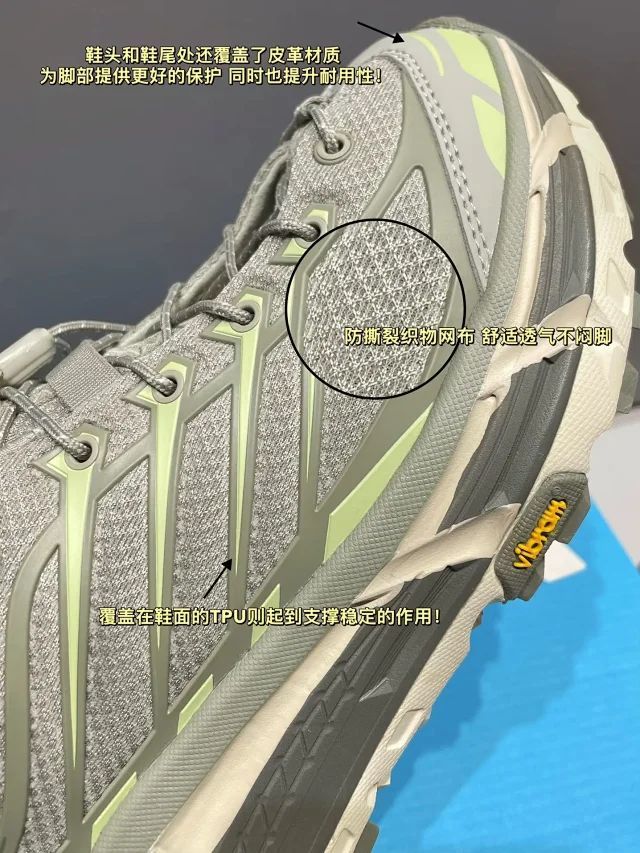 防撕裂轻量无缝鞋面配合TPU支撑条加强 轻薄又透气!穿脱方便的抽拉式快速系带系统!加上HOKA招牌的厚底设计 能够起到很好的缓冲减震效果!还有5毫米专业Vibram橡胶大底 提供充足抓地力!