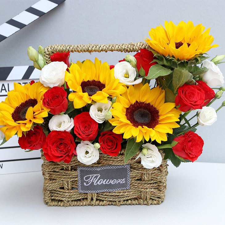 玫瑰向日葵精美混搭手提花篮-送女朋友老婆妈妈老师闺蜜生日教师节生日礼物精美时尚