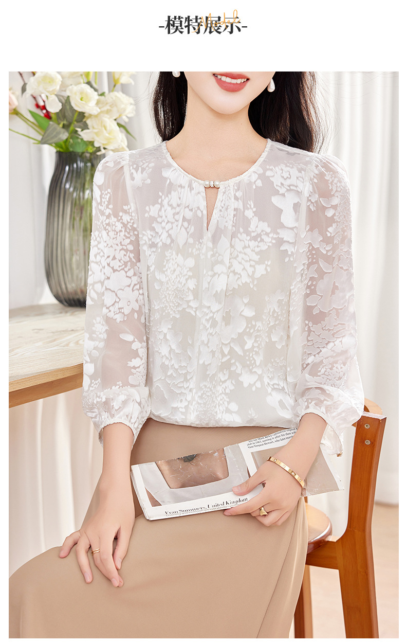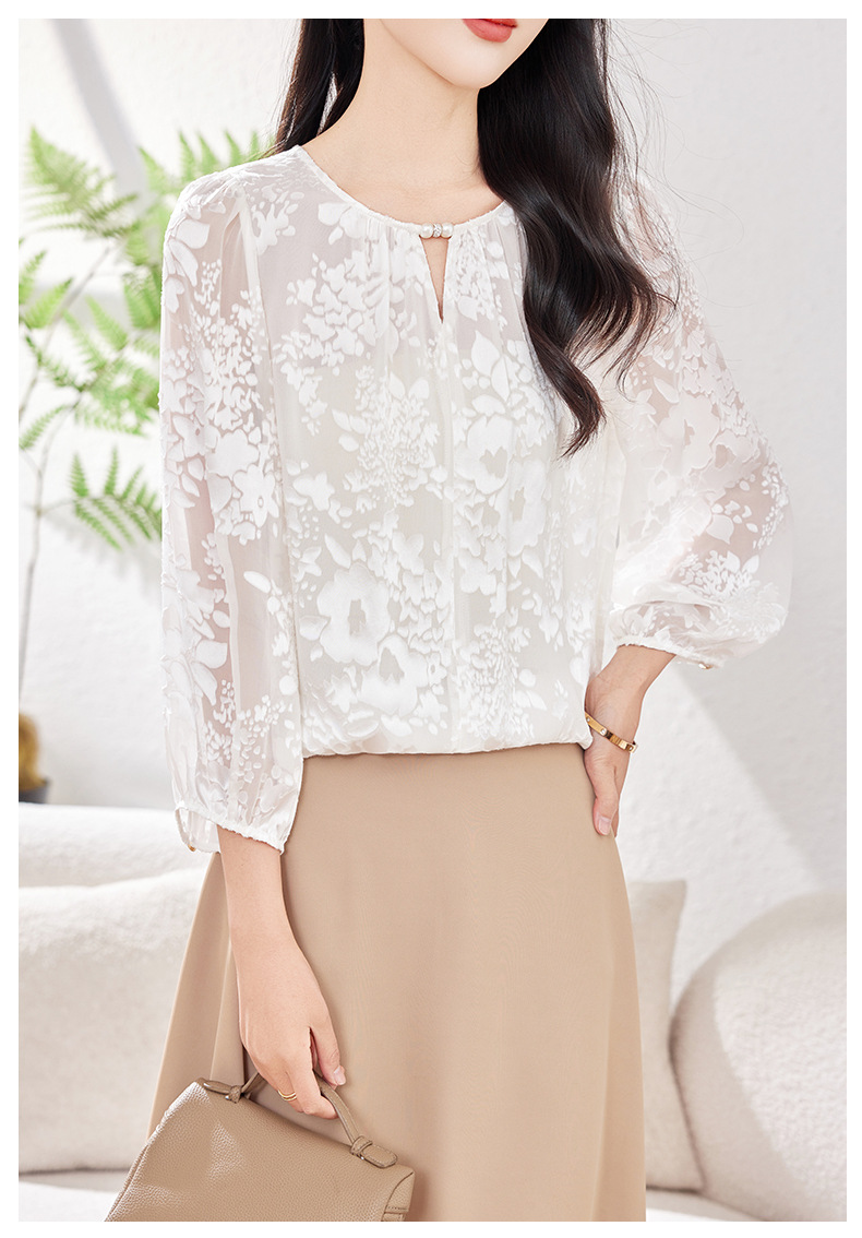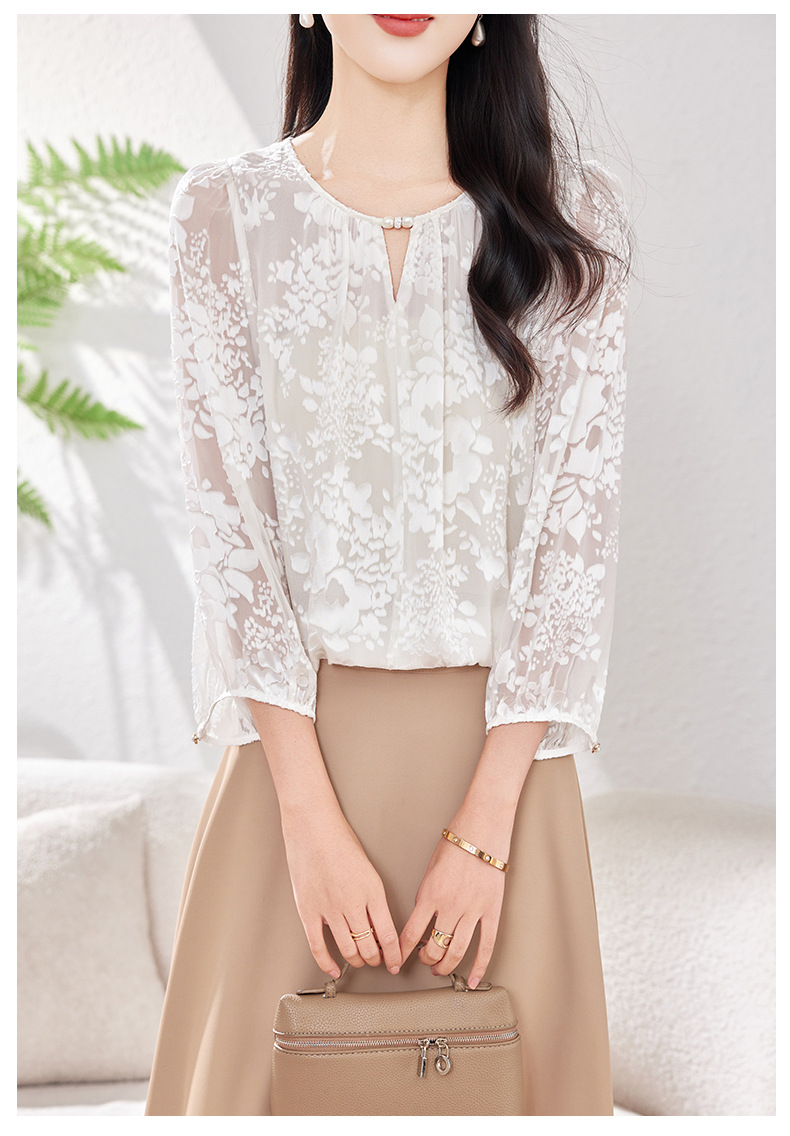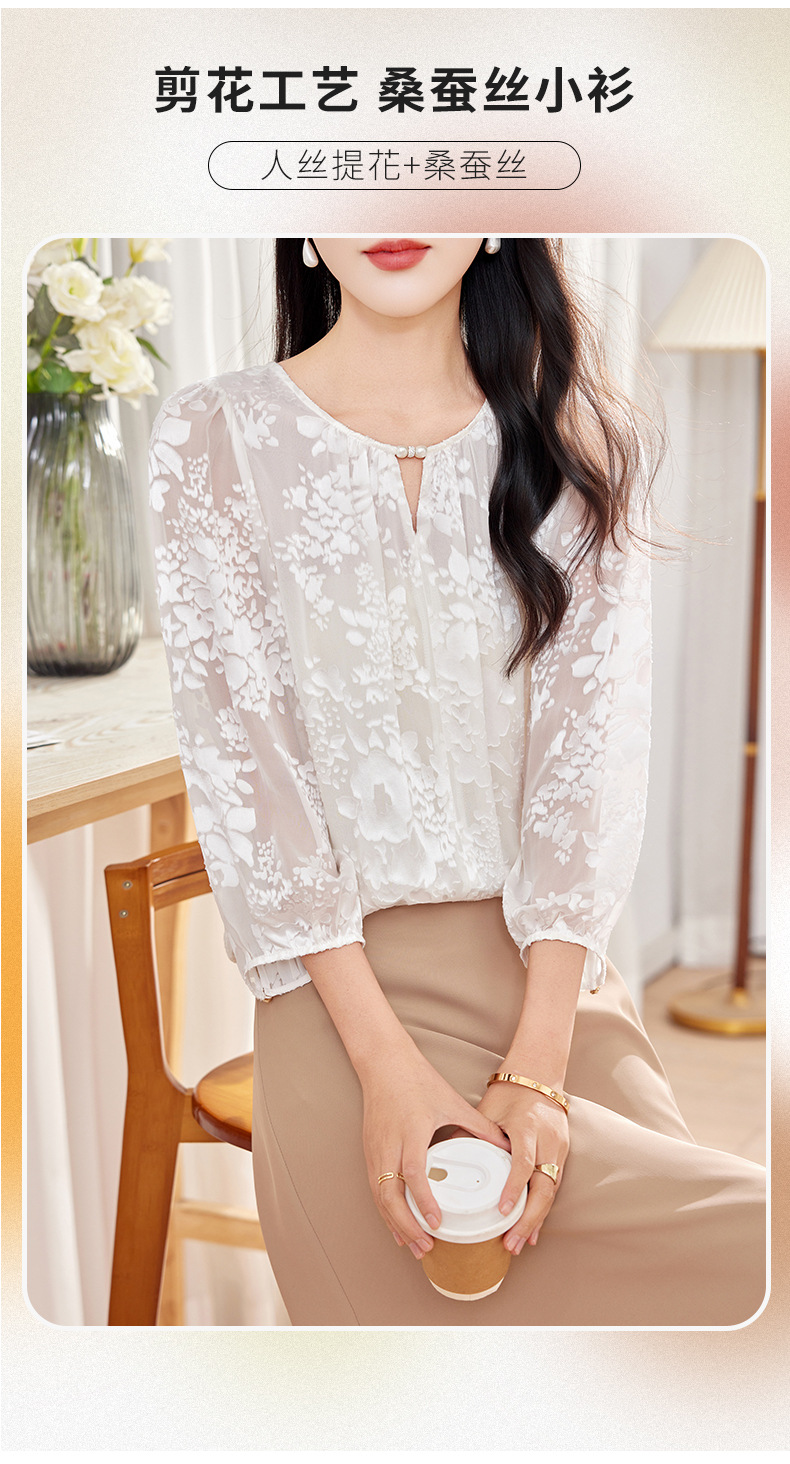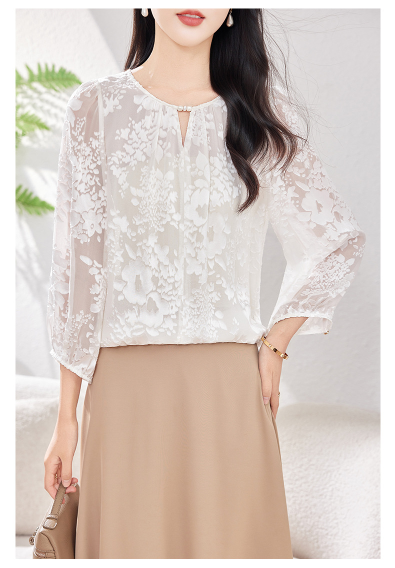 KQ-2026年春季新款白色圆领提花小衫薄款桑蚕丝七分袖上衣女法式衬衫