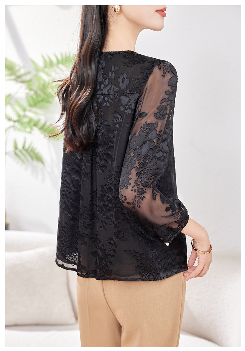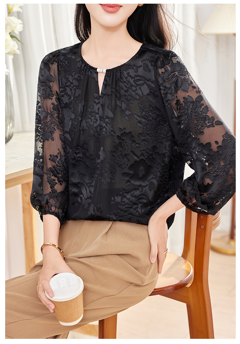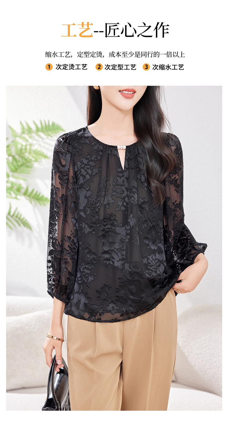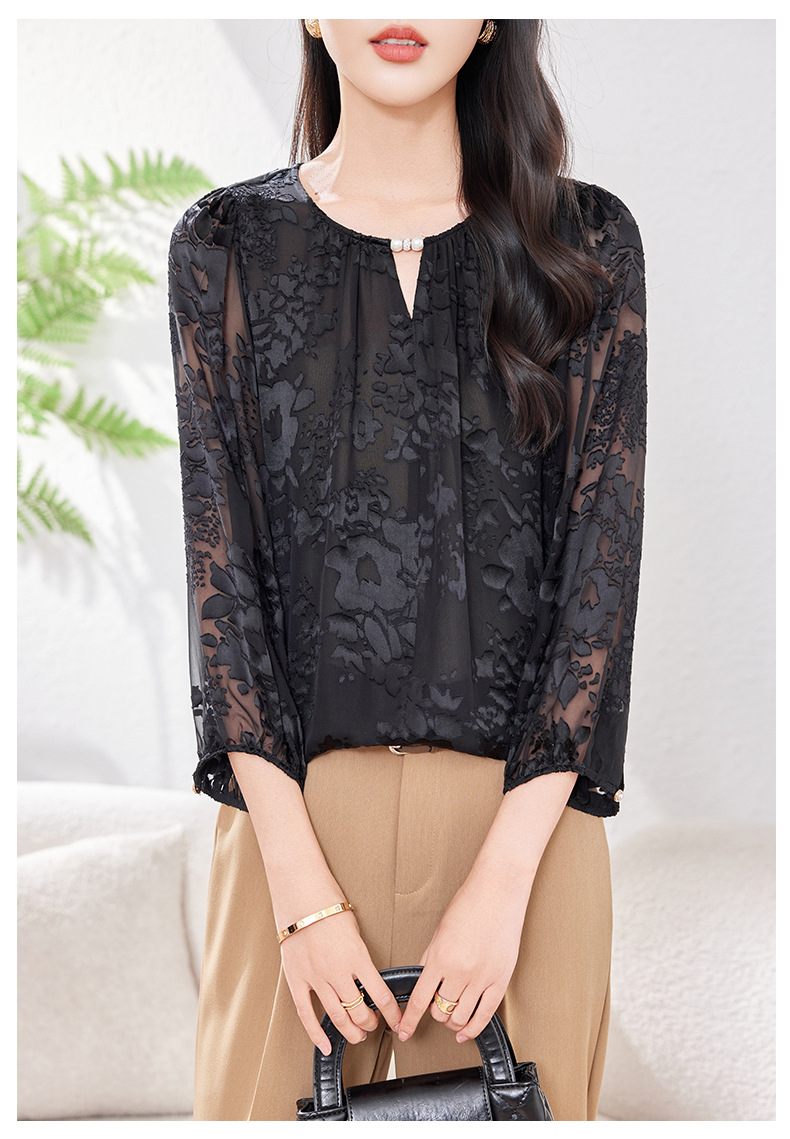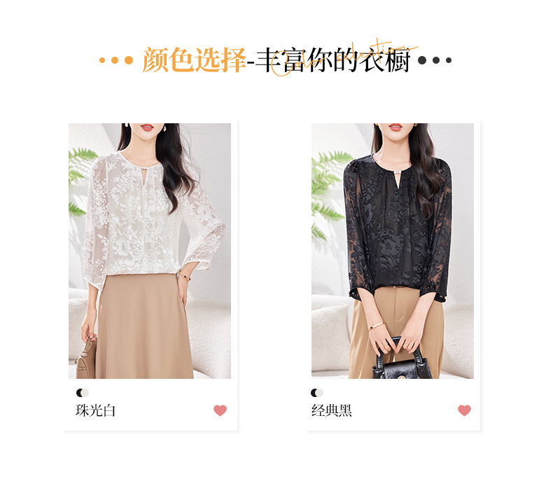 KQ-2026年春季新款白色圆领提花小衫薄款桑蚕丝七分袖上衣女法式衬衫