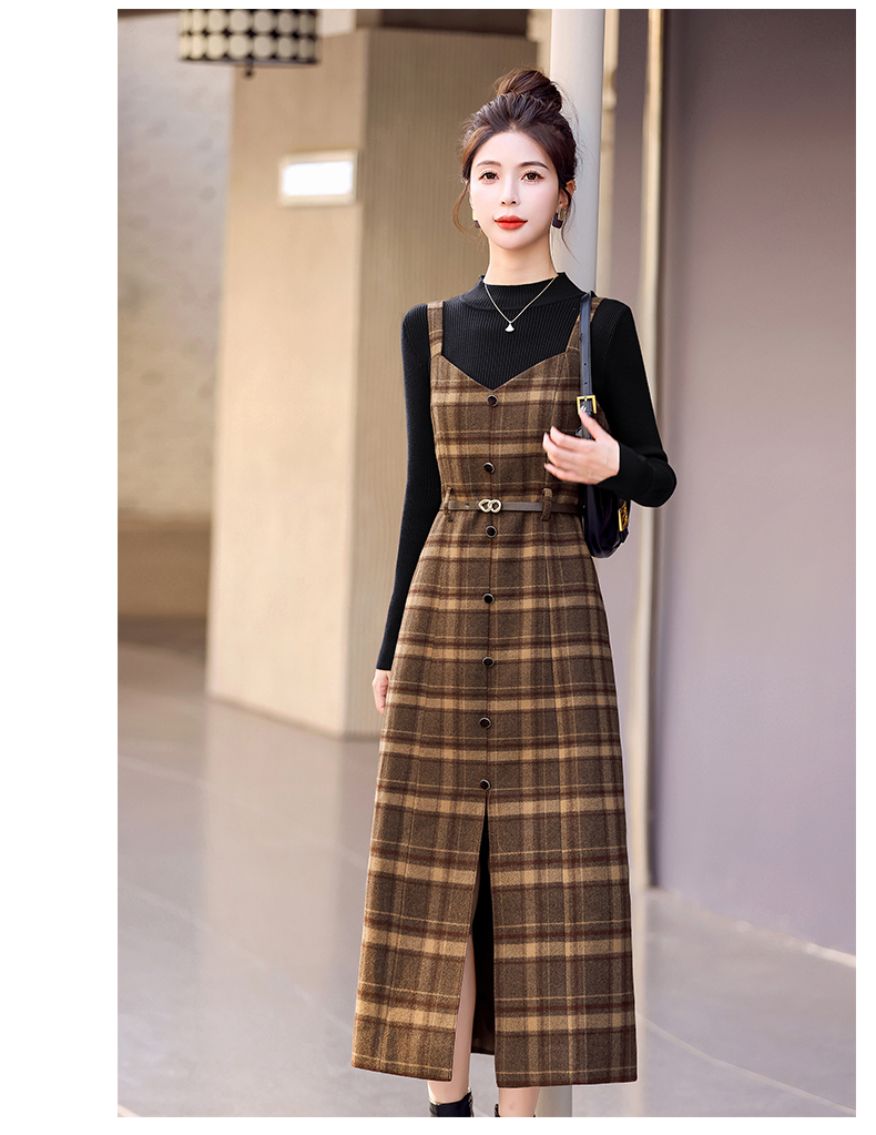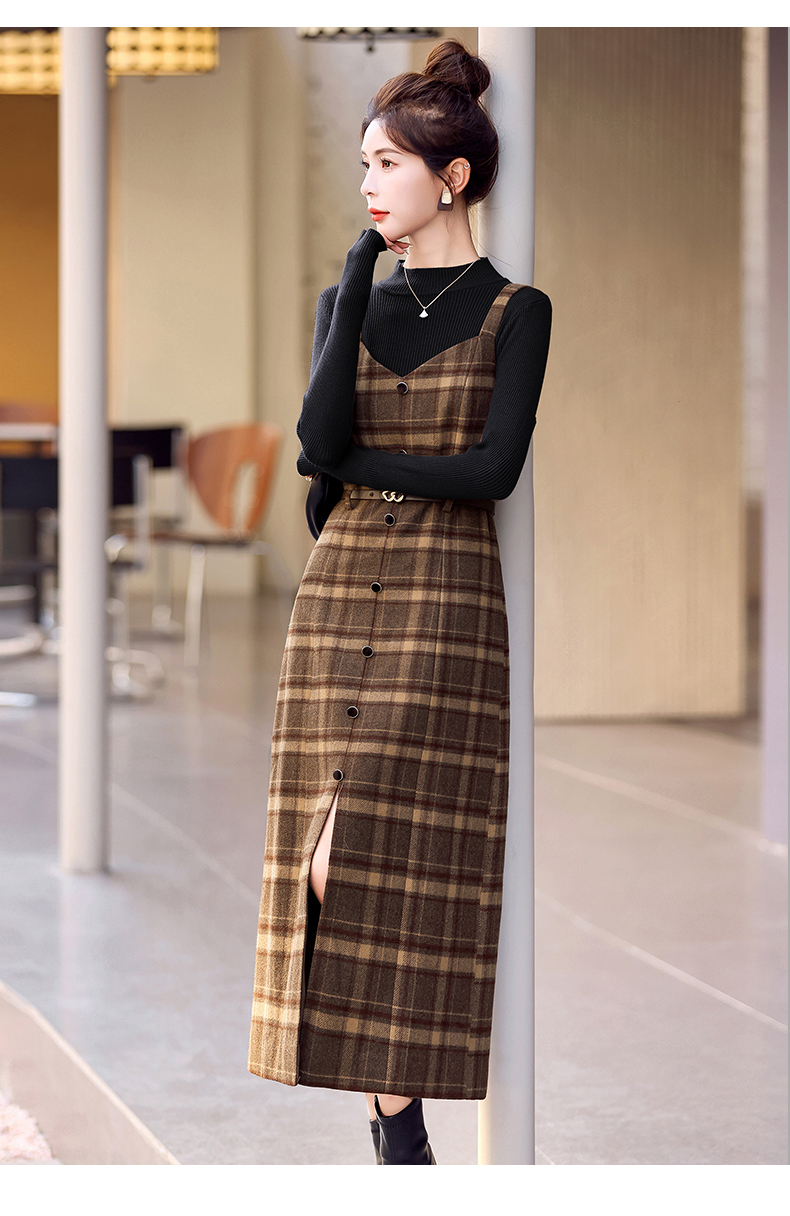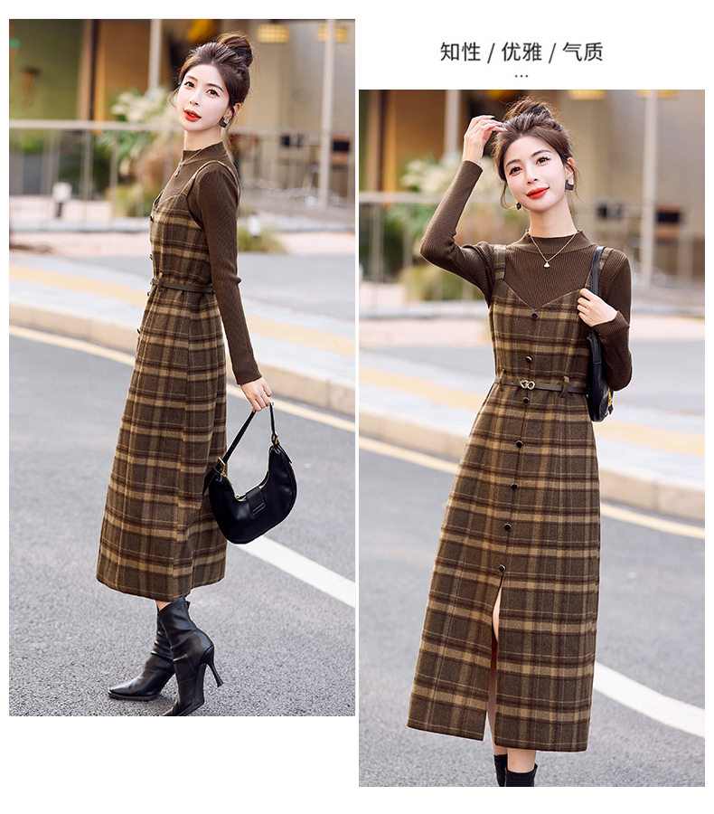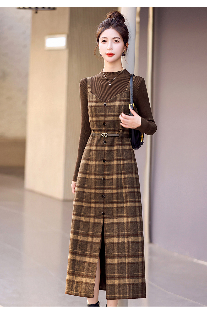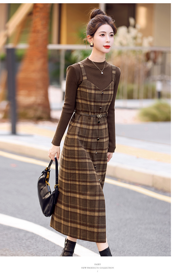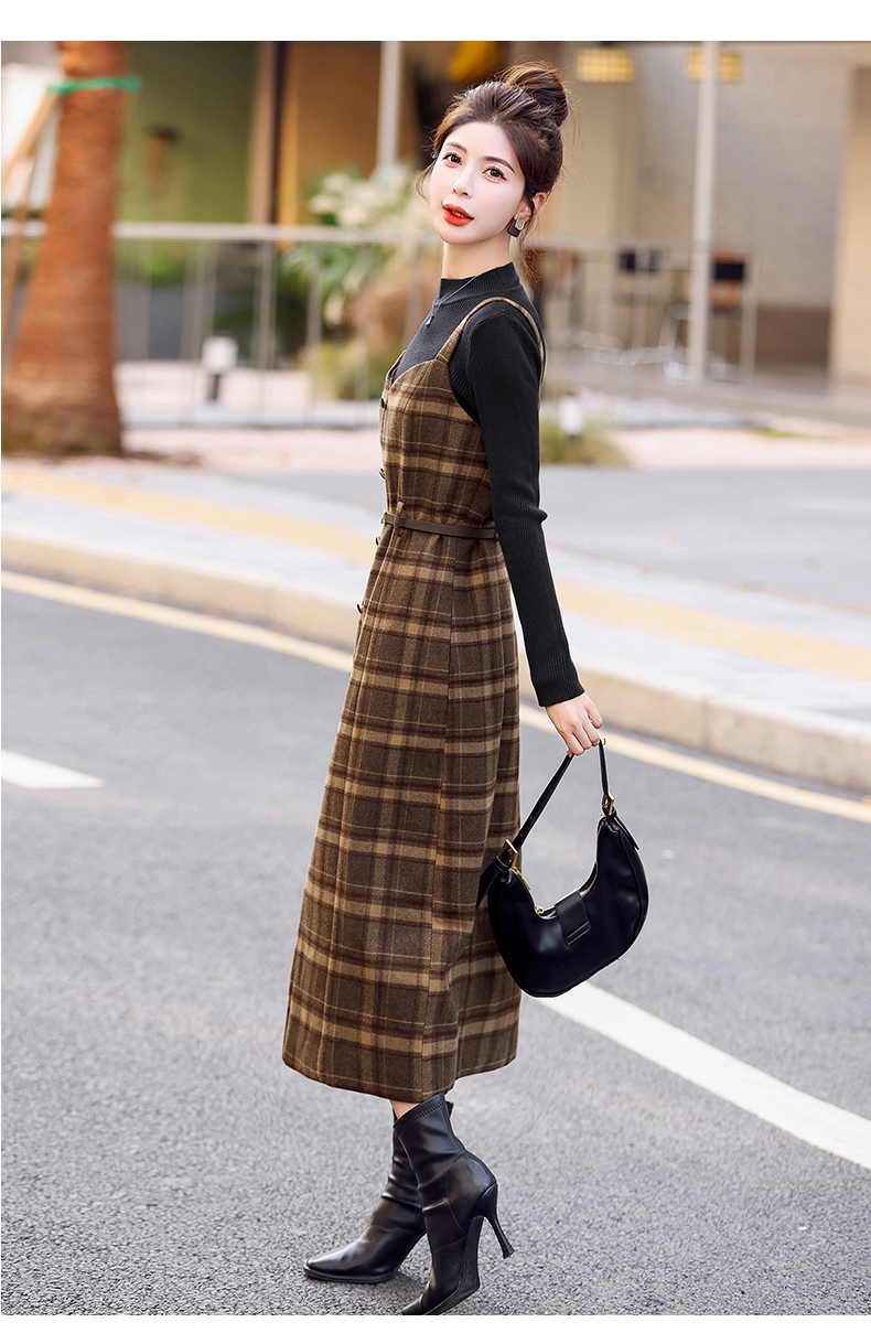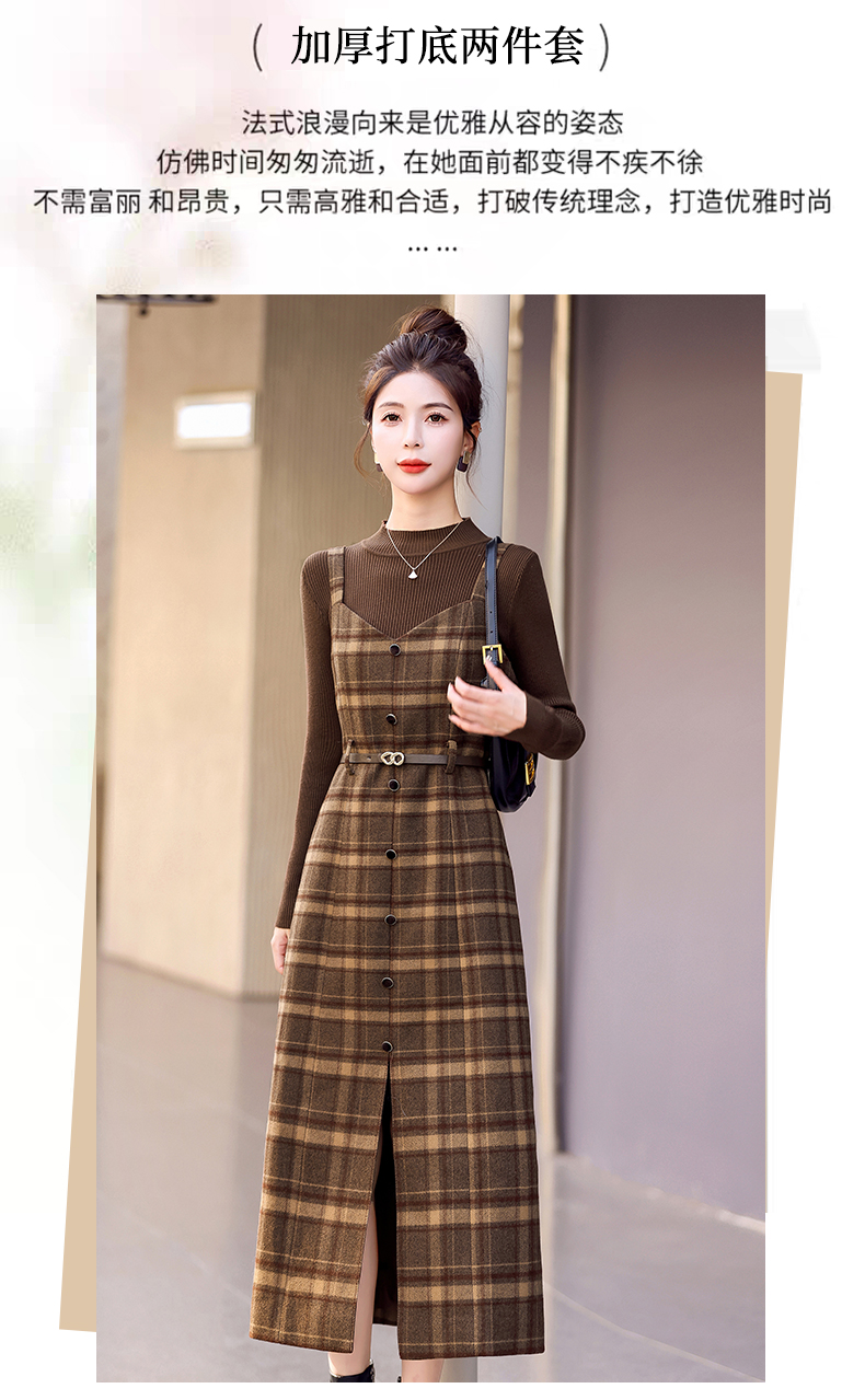 修身显瘦,气质复古格子加厚毛呢两件套连衣裙HR-LNS9662-1