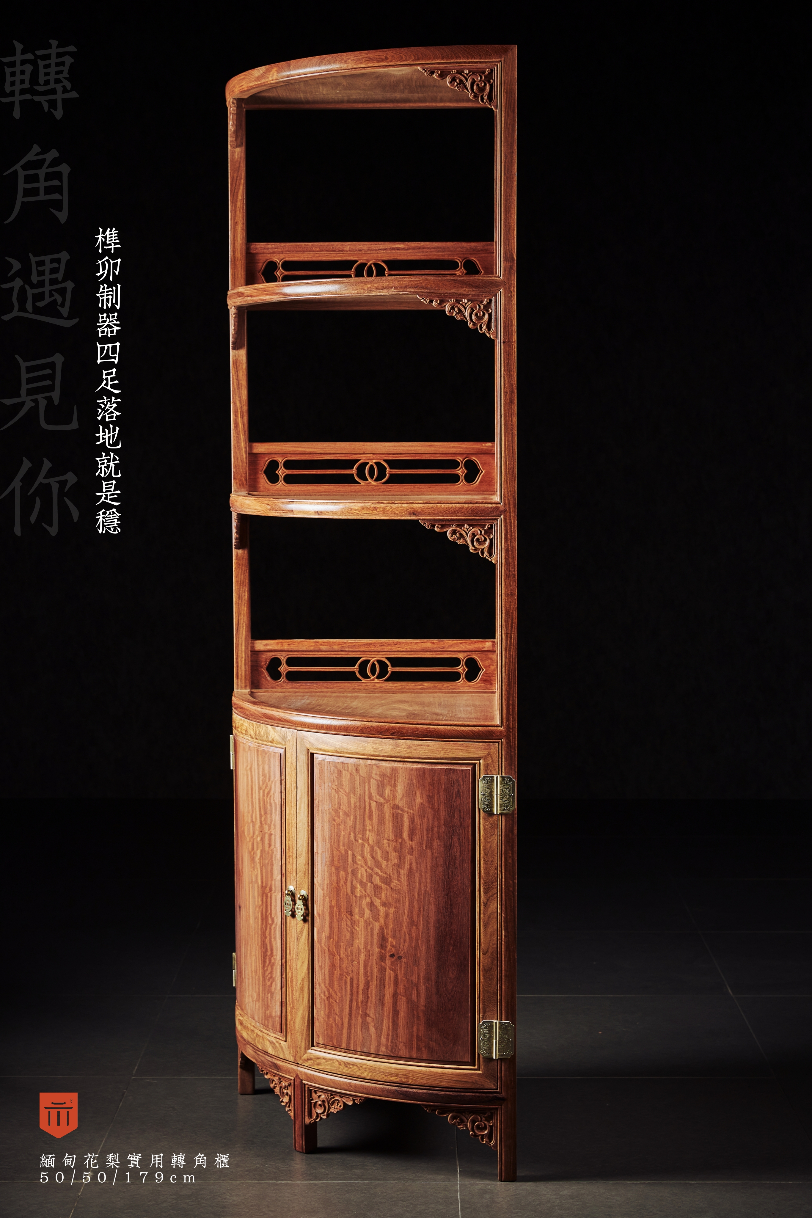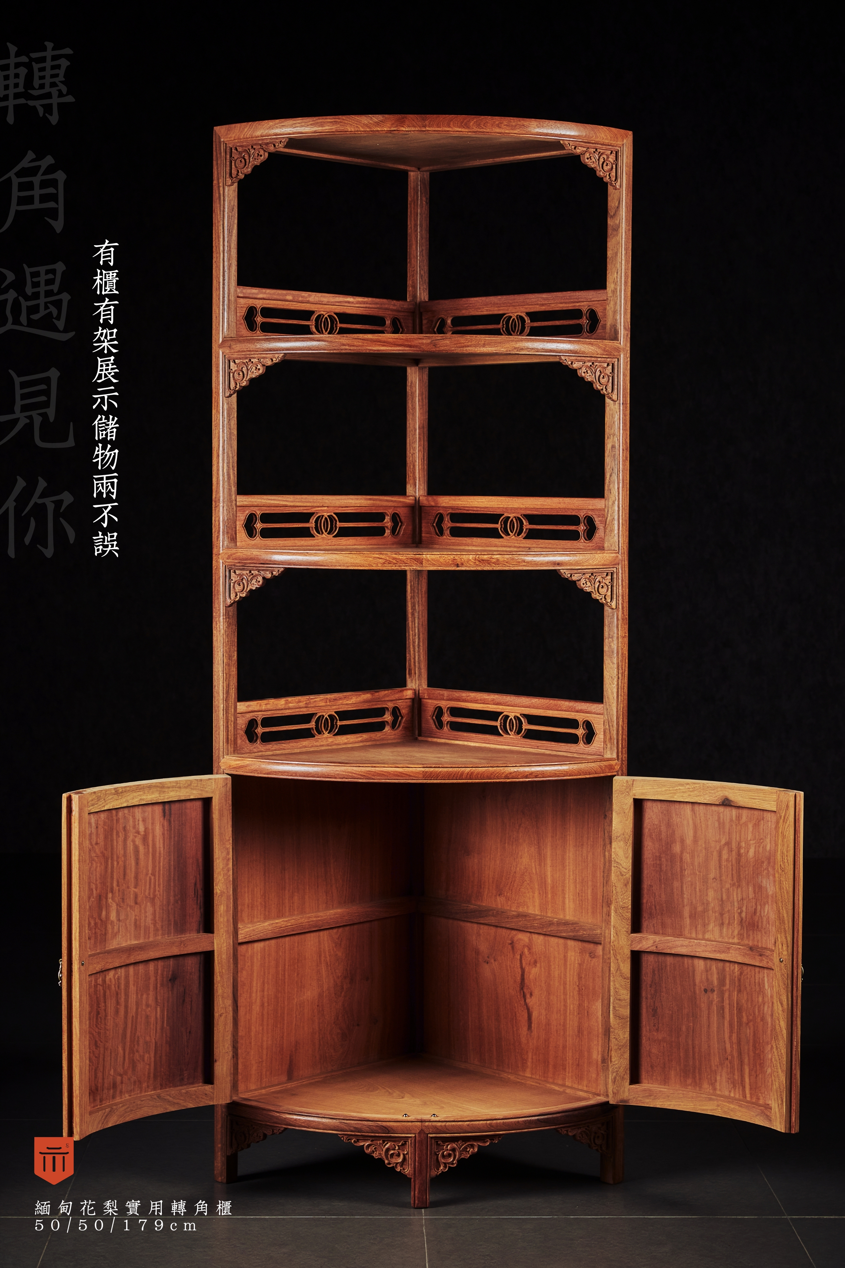 角柜90°直角,无缝贴墙,合理利用转角空间,上三层为开放式展示架,下为对门封闭式储物柜,攒框镶扇面层板,两侧及底部安卷草纹角牙,精美秀丽,沿边设围栏,有阻拦之用,防止物品滑落,围栏镂雕双环卡子花,两侧另开小形孔,似如意纹,破除单调感,下设封闭式储物柜,用于收纳较大物件,遮光防尘。