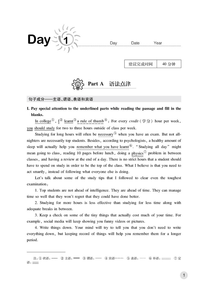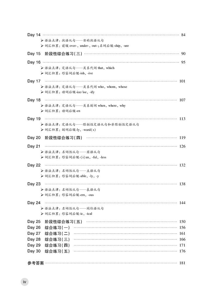 全书共计30天的练习,分为20天日常练习、5天阶段性综合练习和5天大综练习。日常练习分为三大板块:语法点津、词汇积累、阅读理解。