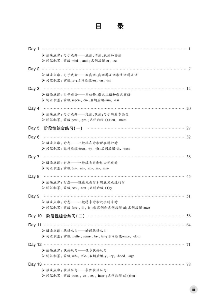 每4天日常练习后为1天的阶段性综合练习,目的是帮助学生及时复习、综合运用;最后5天是综合练习,目的是综合检测前面的学习效果,进一步夯实运用。