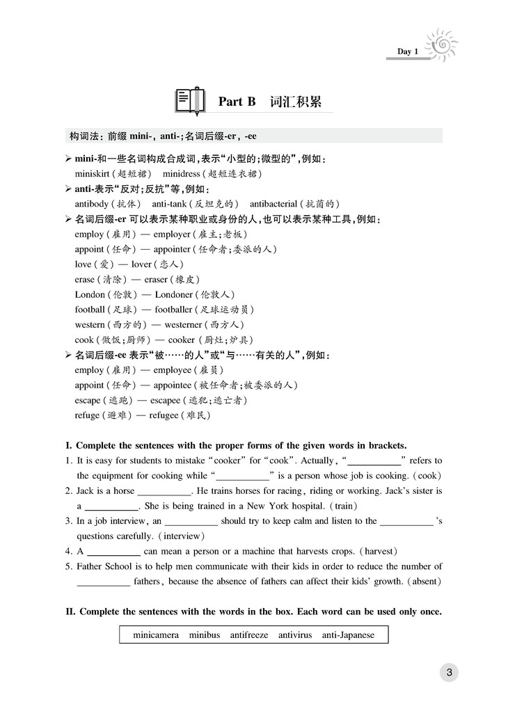 词汇积累:复习和学习初高中阶段要求掌握的基本词缀,让学生学会举一反三,不断扩大自己的词汇网。