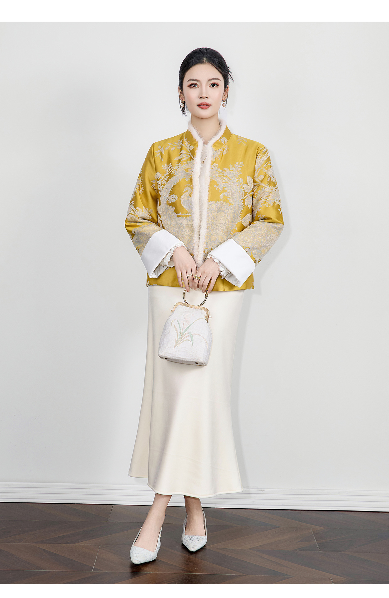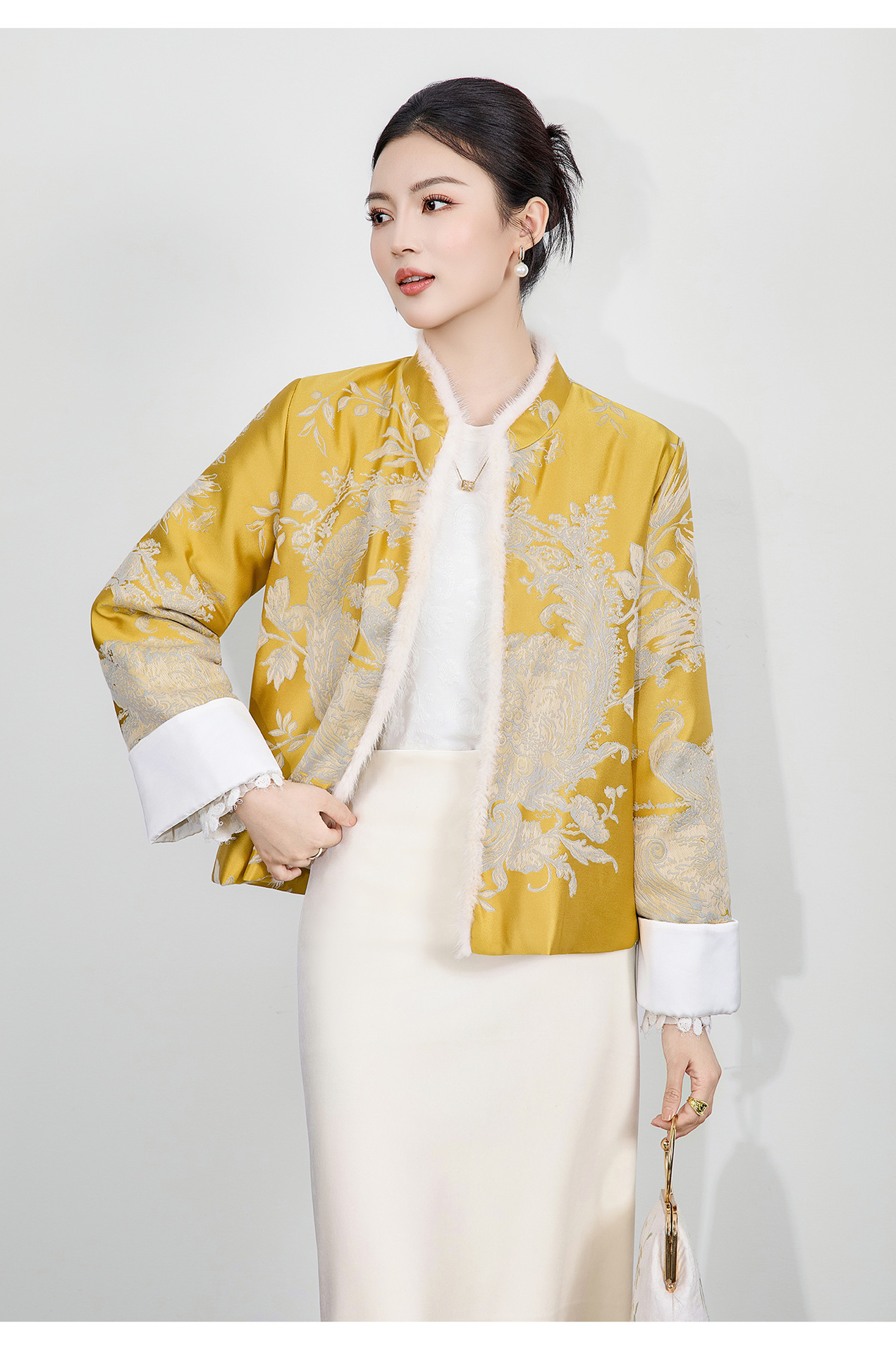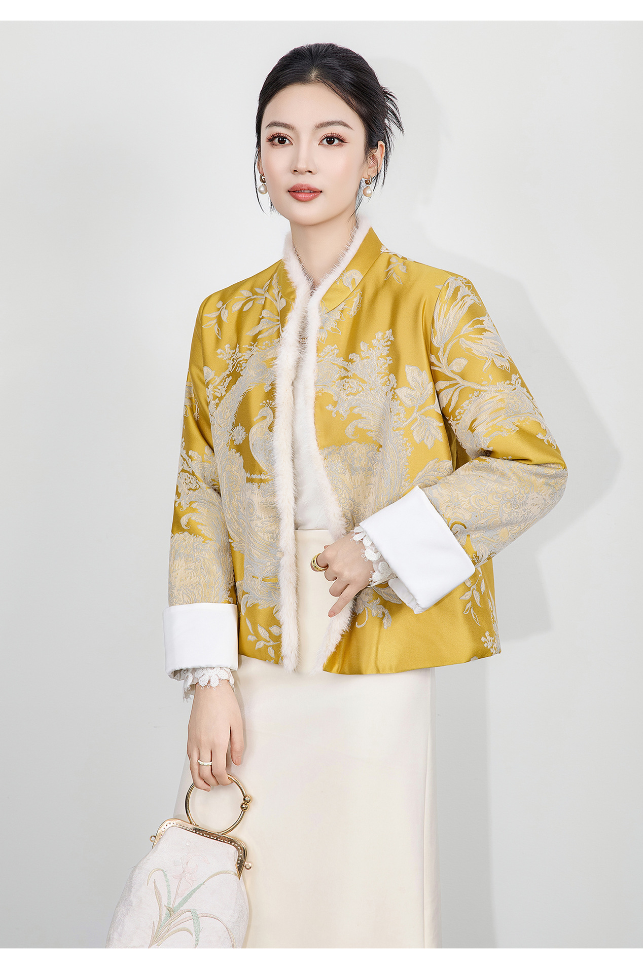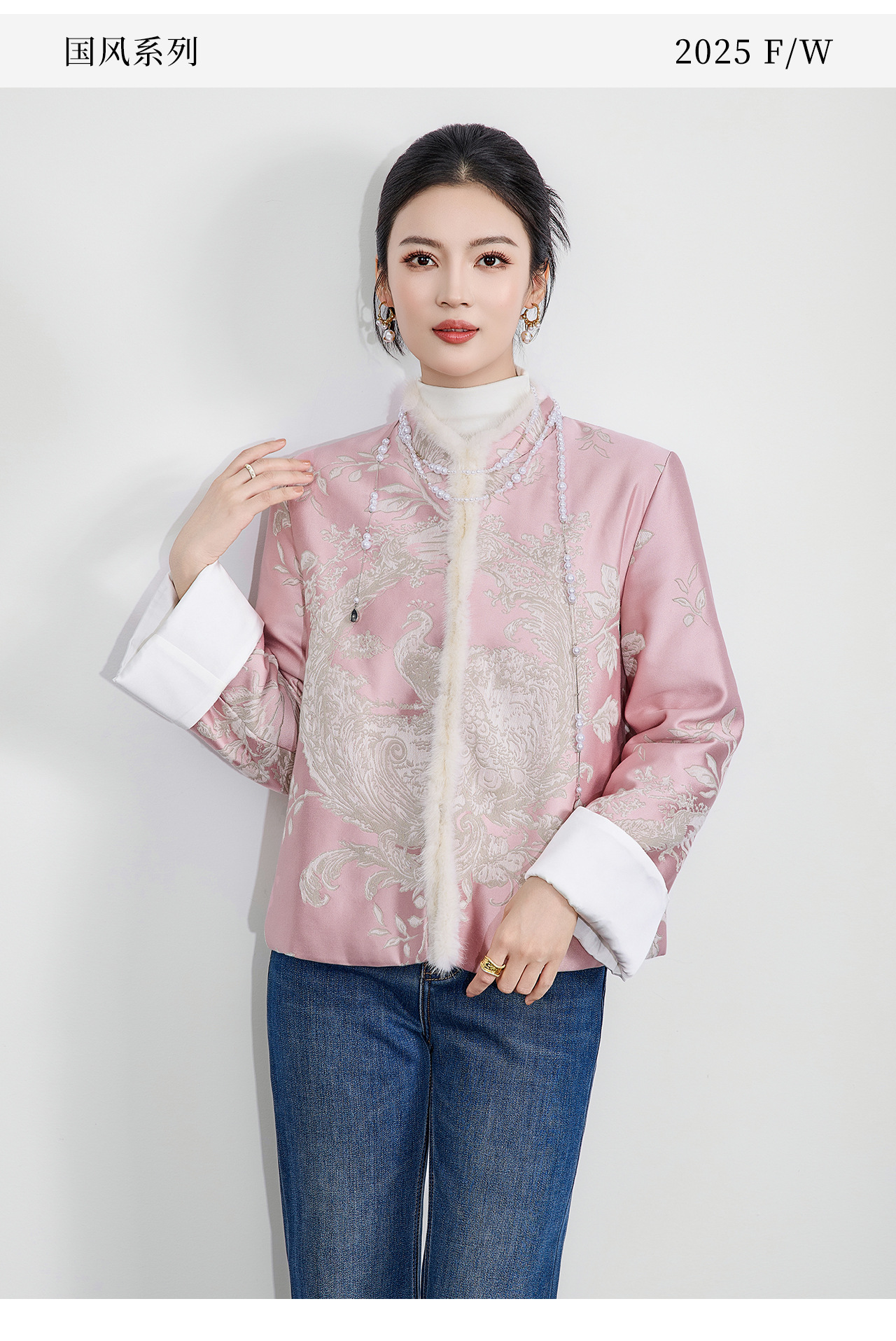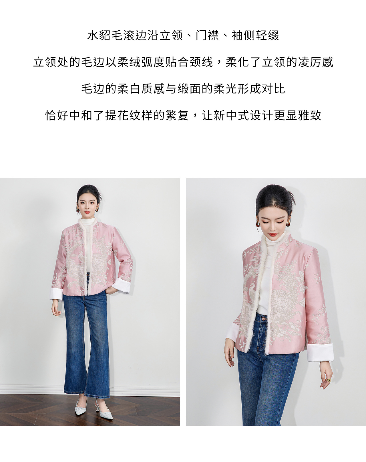「高货wl」全新升级【铂金会员422/天猫569/差价147】(05147)洛诗琳夹棉提花缎水貂毛拼接外套2025冬季气质国风棉衣女