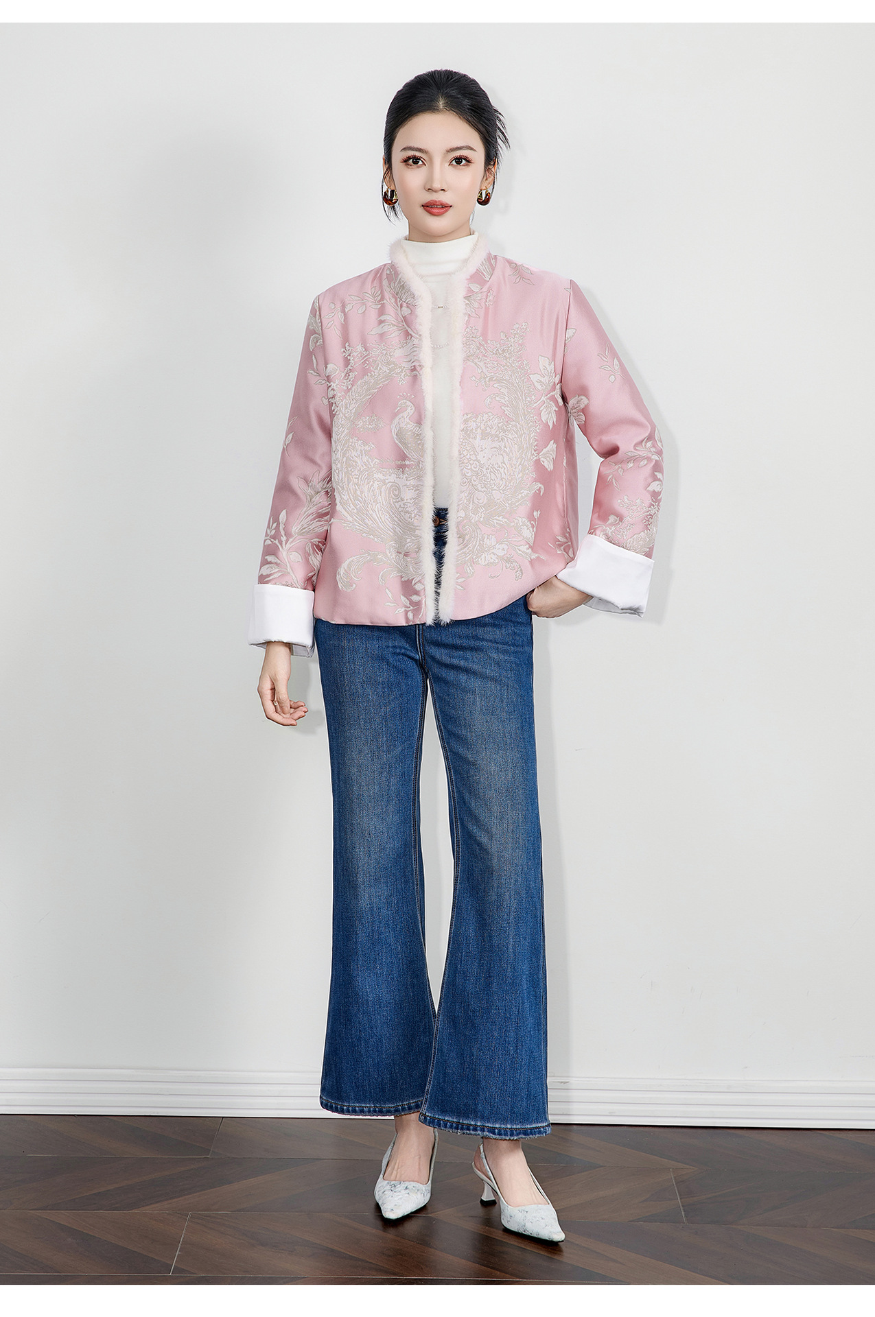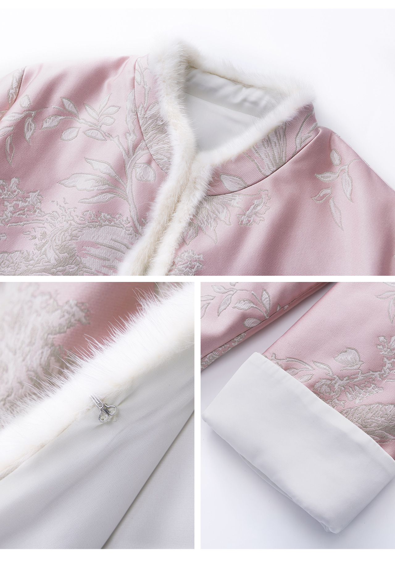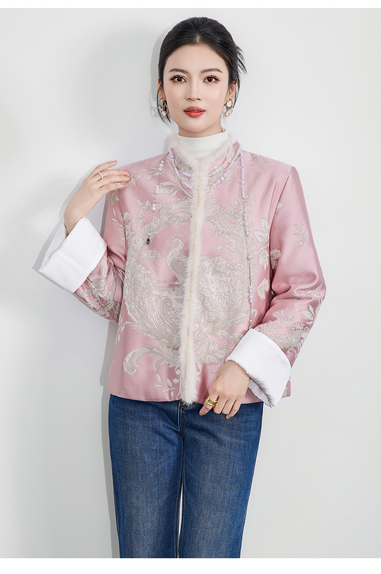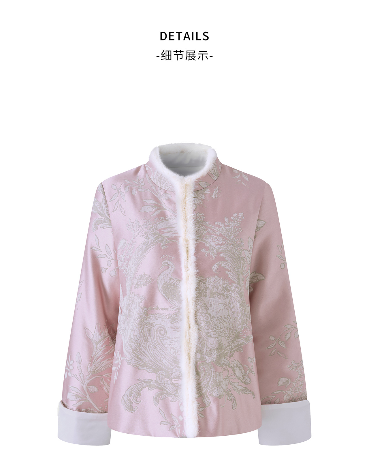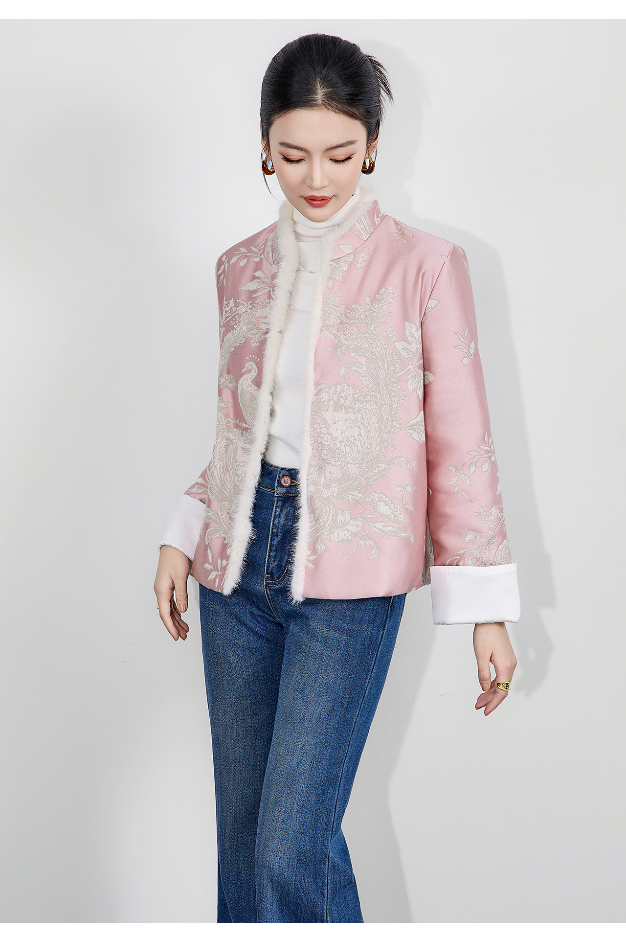 「高货wl」全新升级【铂金会员422/天猫569/差价147】(05147)洛诗琳夹棉提花缎水貂毛拼接外套2025冬季气质国风棉衣女