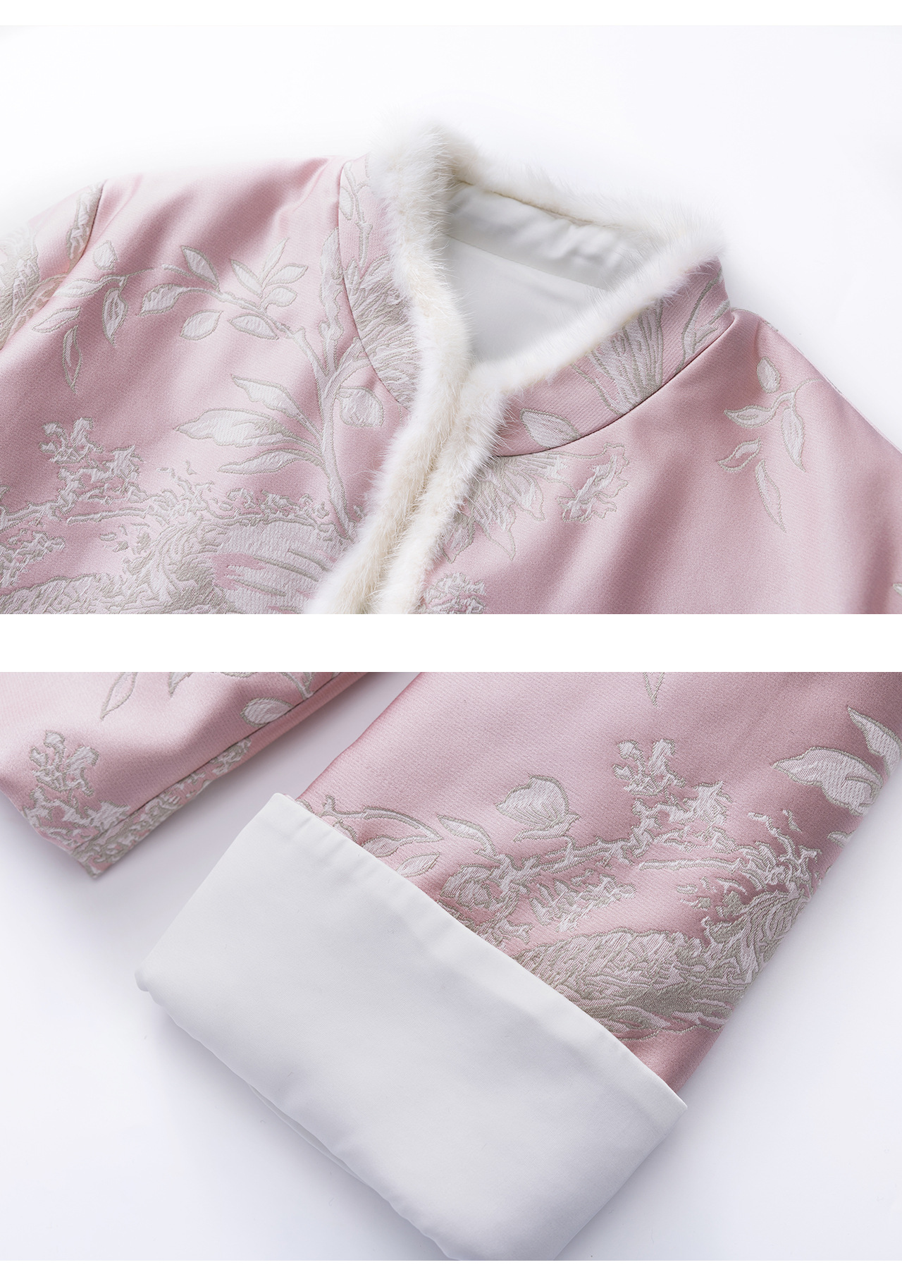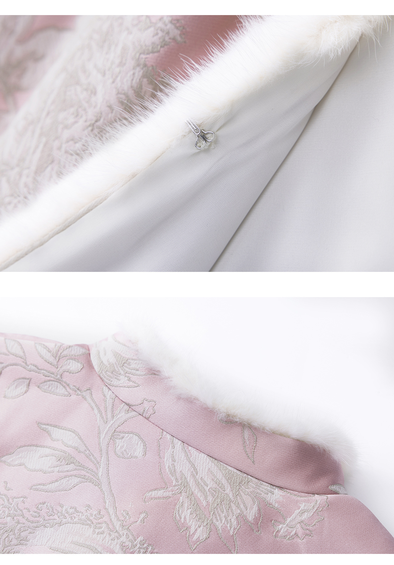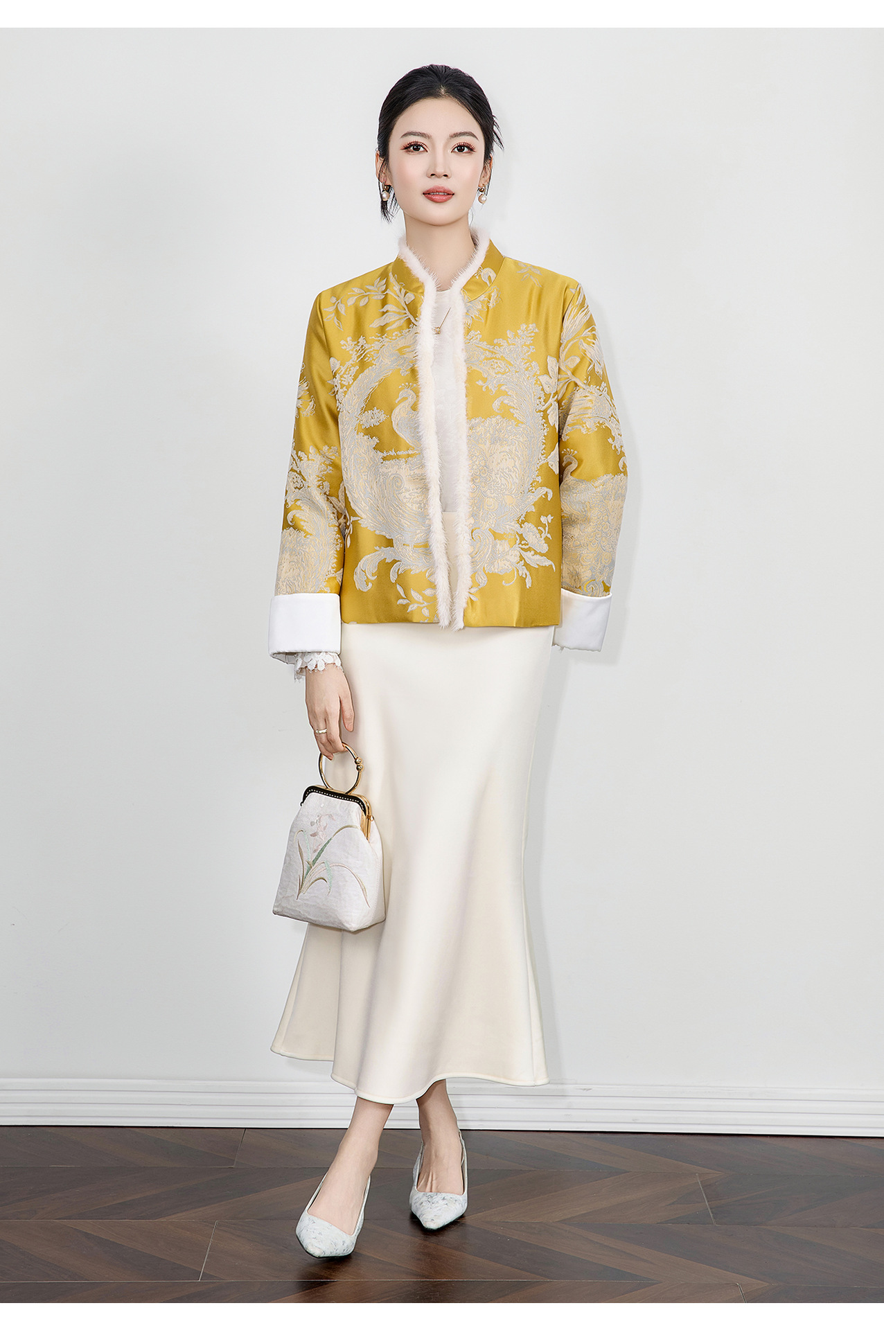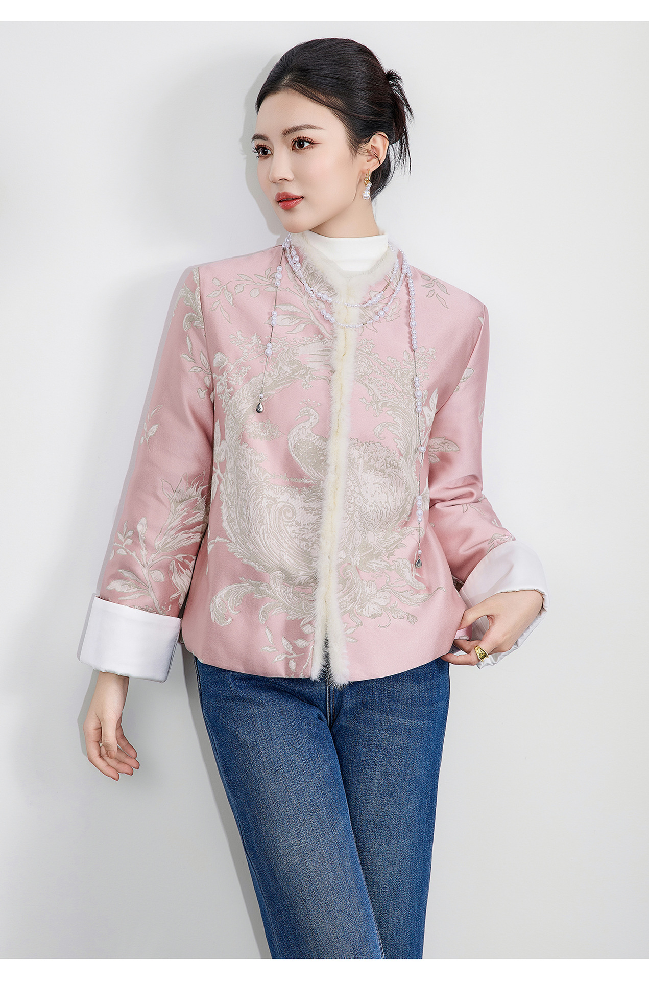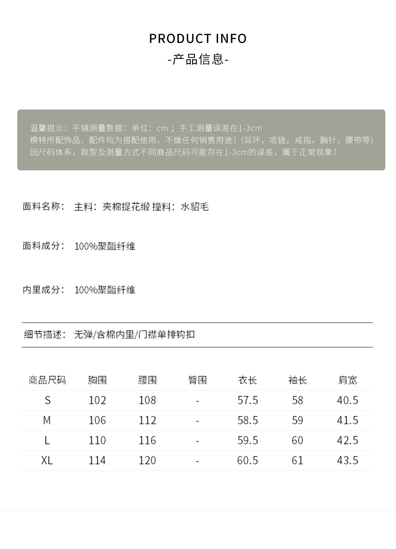 「高货wl」全新升级【铂金会员422/天猫569/差价147】(05147)洛诗琳夹棉提花缎水貂毛拼接外套2025冬季气质国风棉衣女