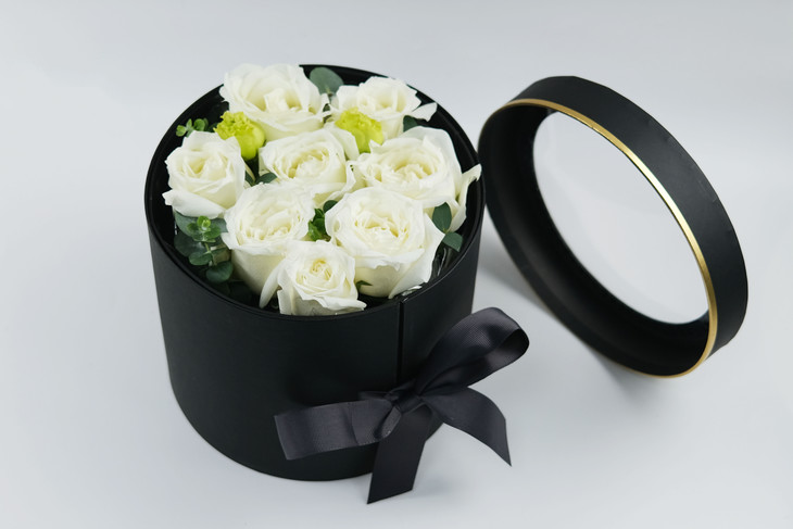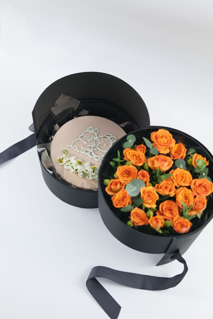 4. 双层鲜花礼盒上层鲜花为固定配置,腻歪兔款搭配橙色鲜花,简约小花款搭配白色玫瑰鲜花。