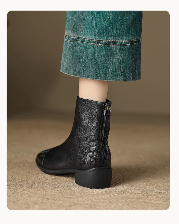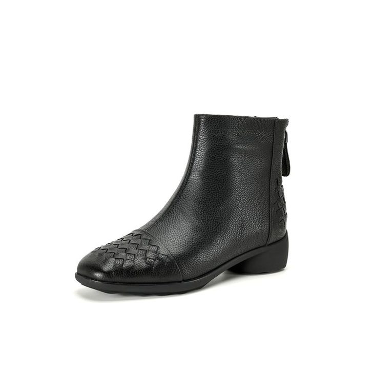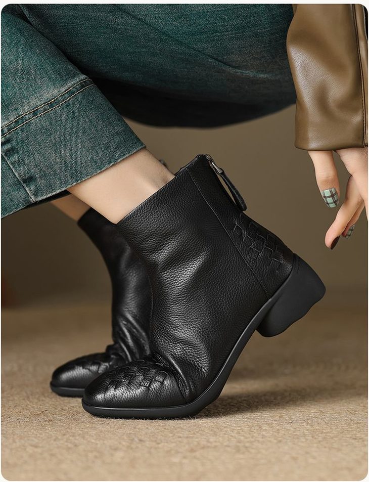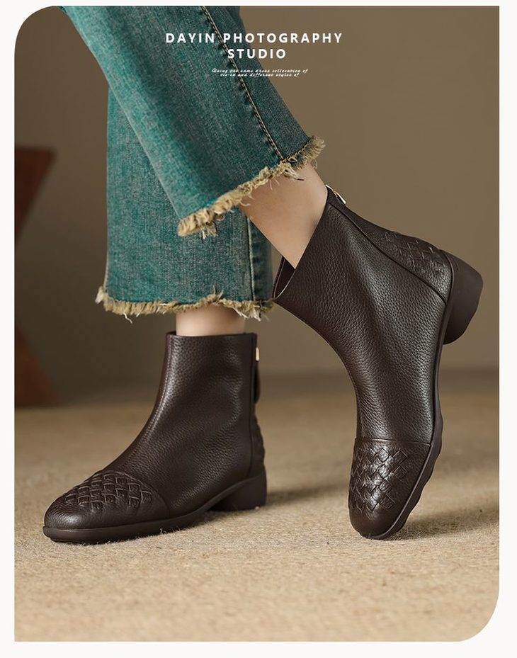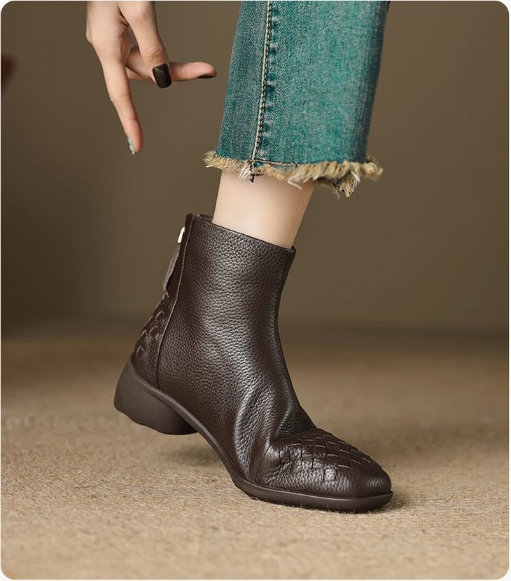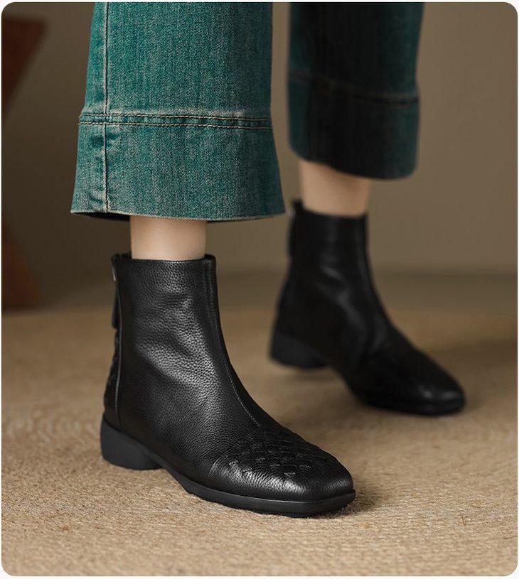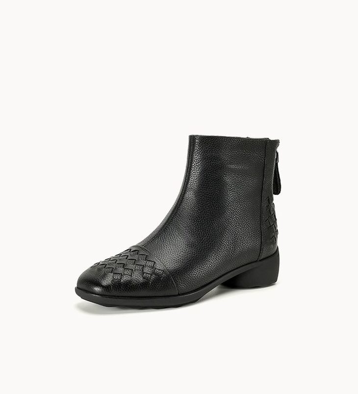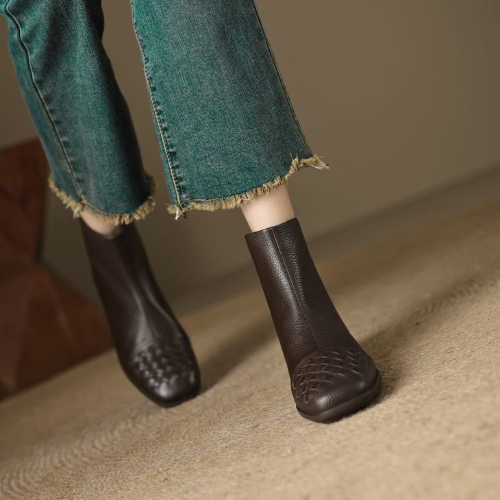 【预售5天】方头马丁靴小众中跟短靴,粗跟编织牛皮女靴子YCJX&HL-6173