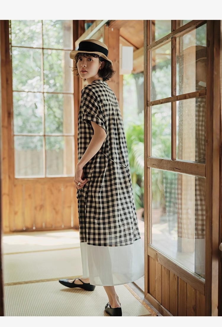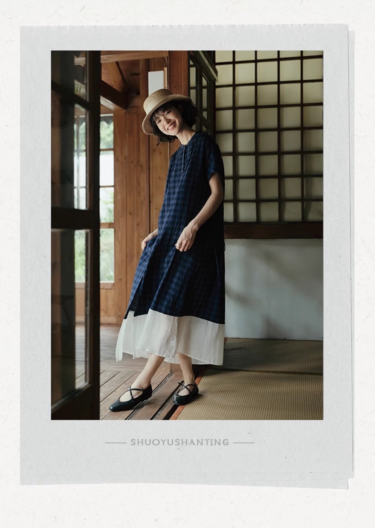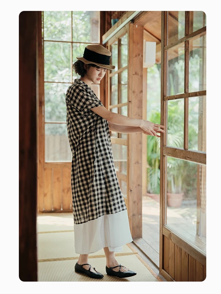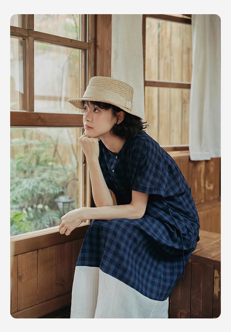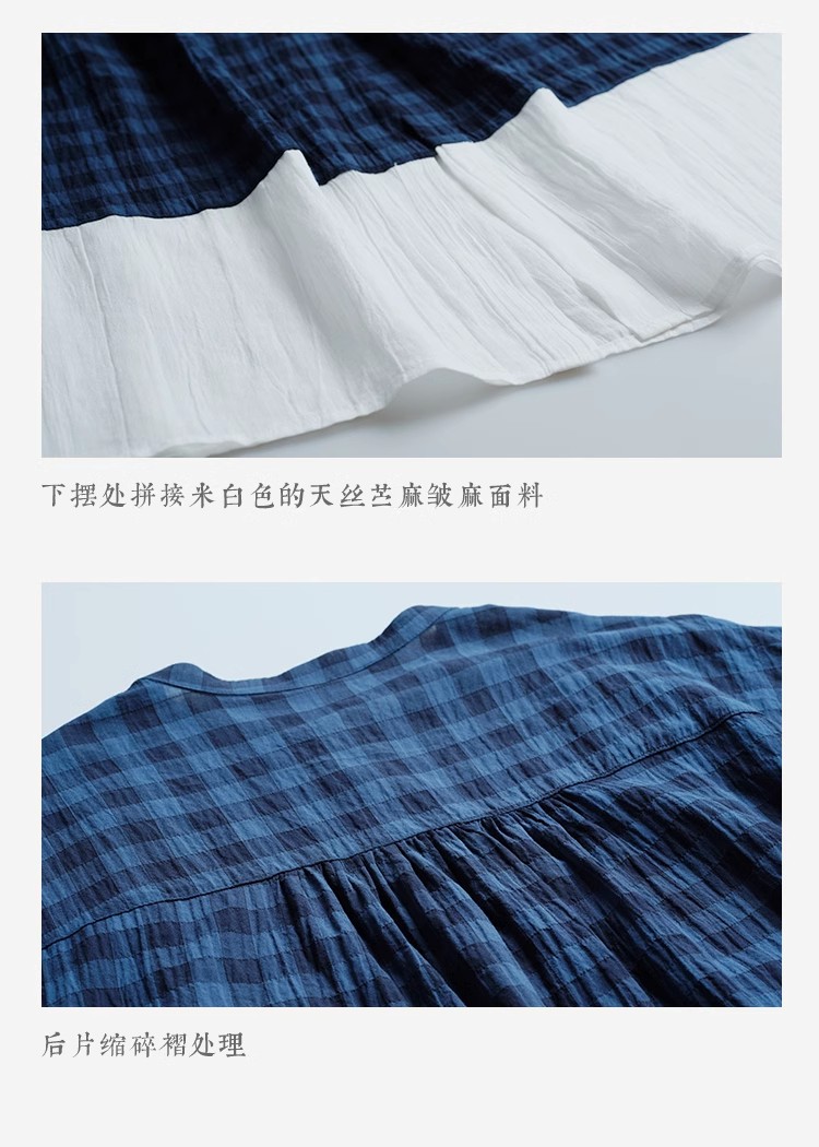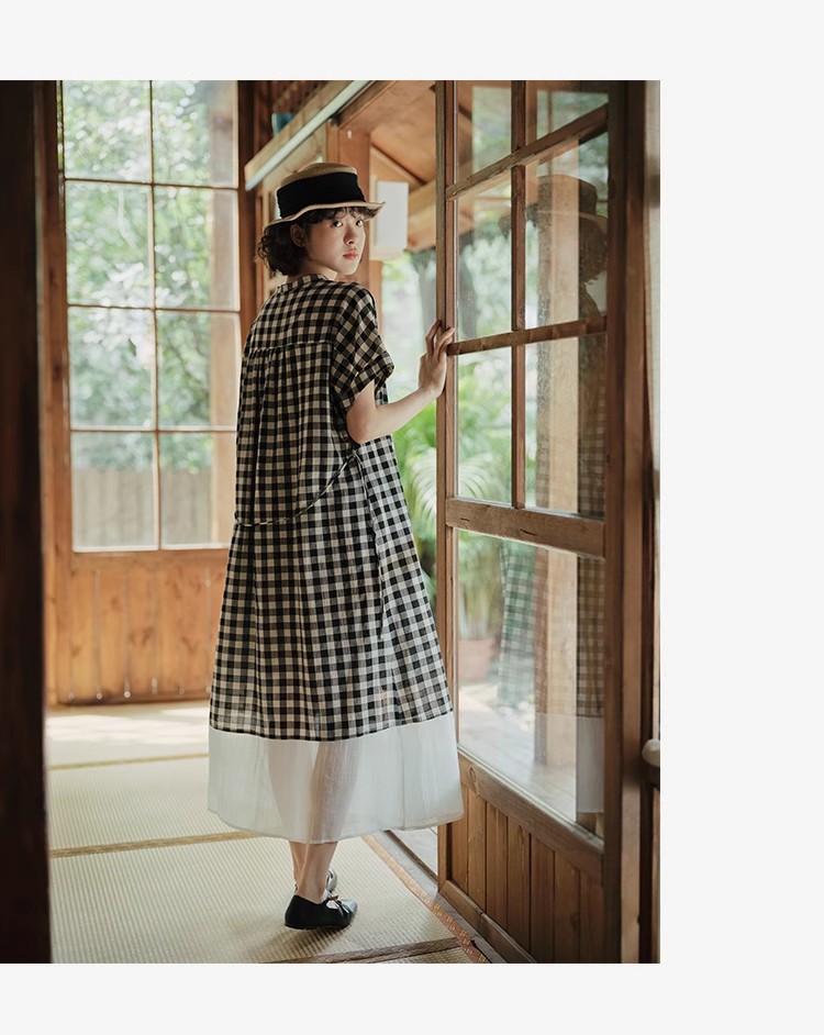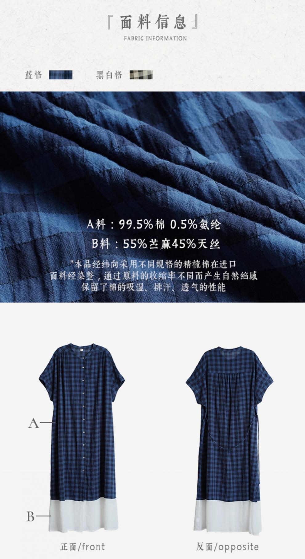 雀说新款文艺休闲松驰感宽松大码女装胖MM显瘦格子拼接连衣裙AL1630