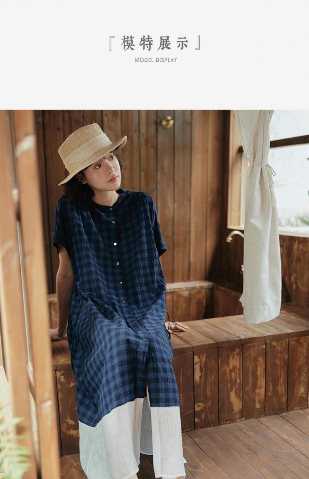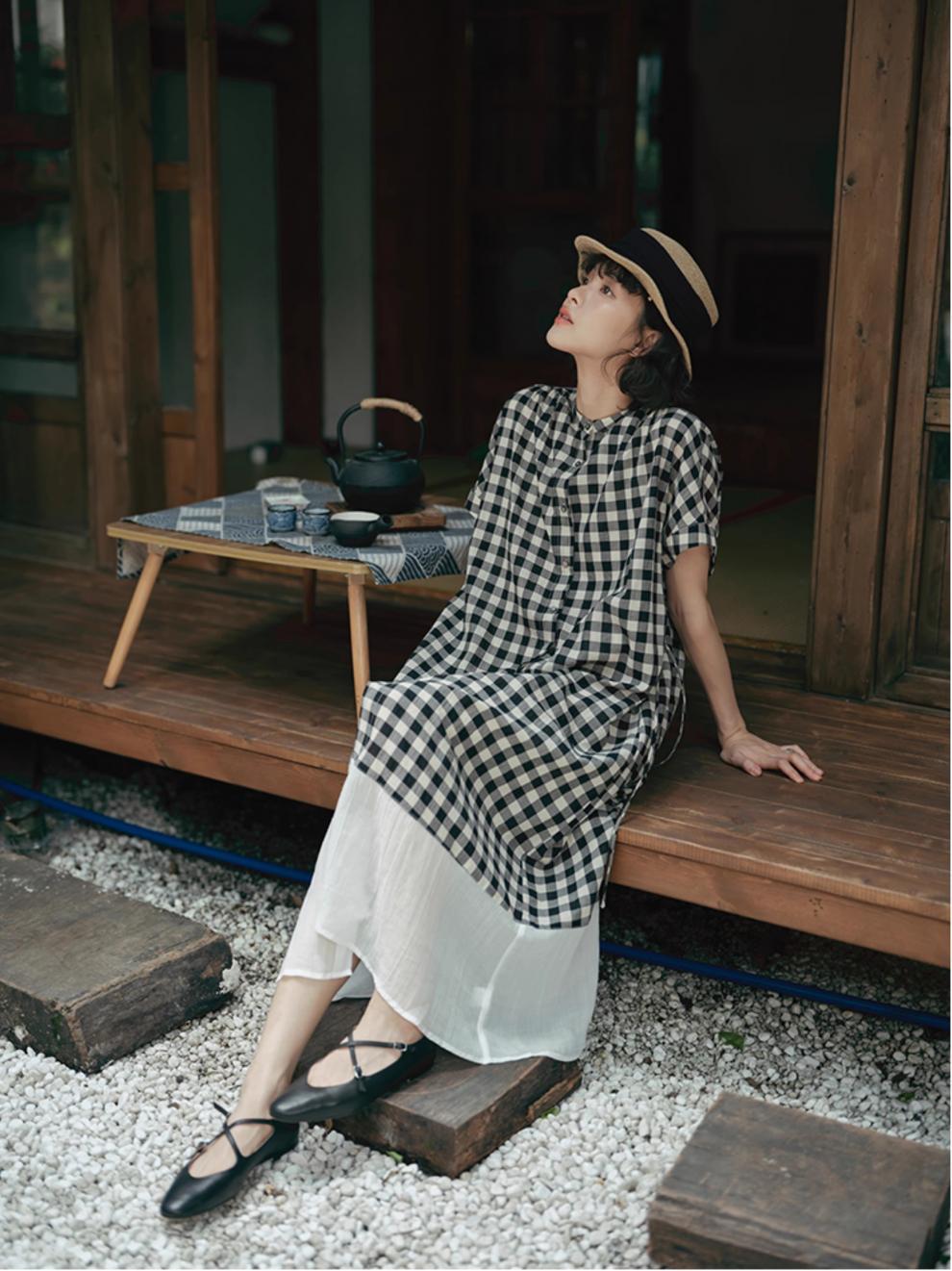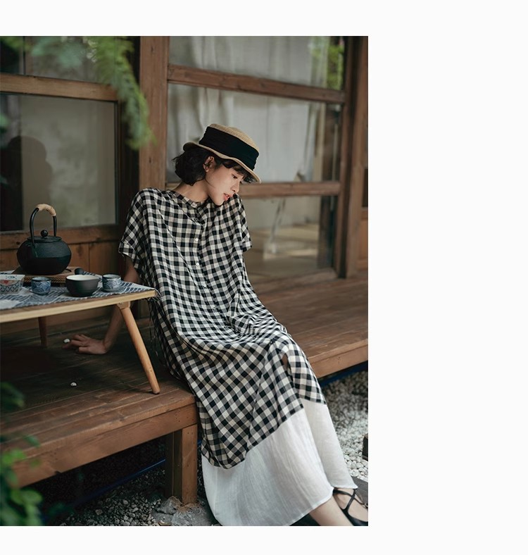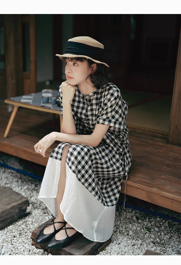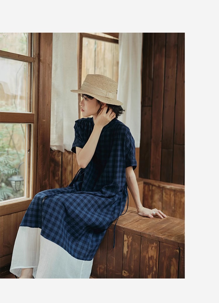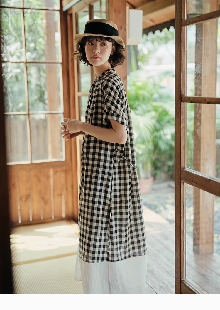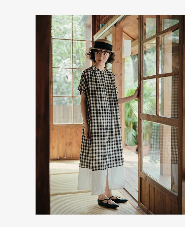雀说新款文艺休闲松驰感宽松大码女装胖MM显瘦格子拼接连衣裙AL1630